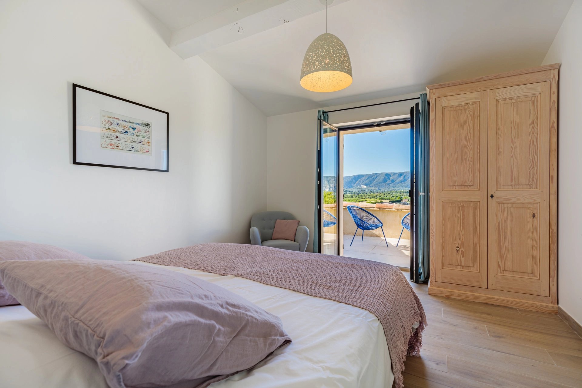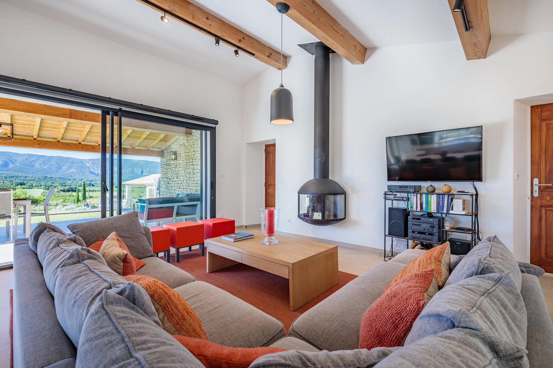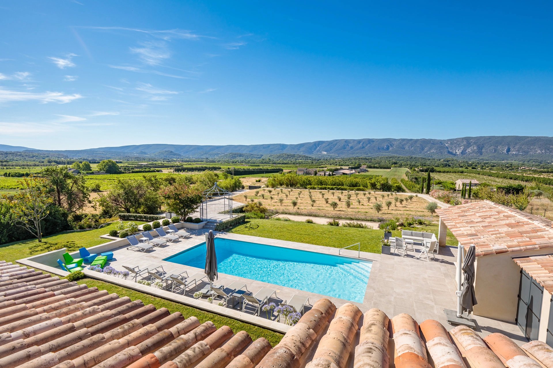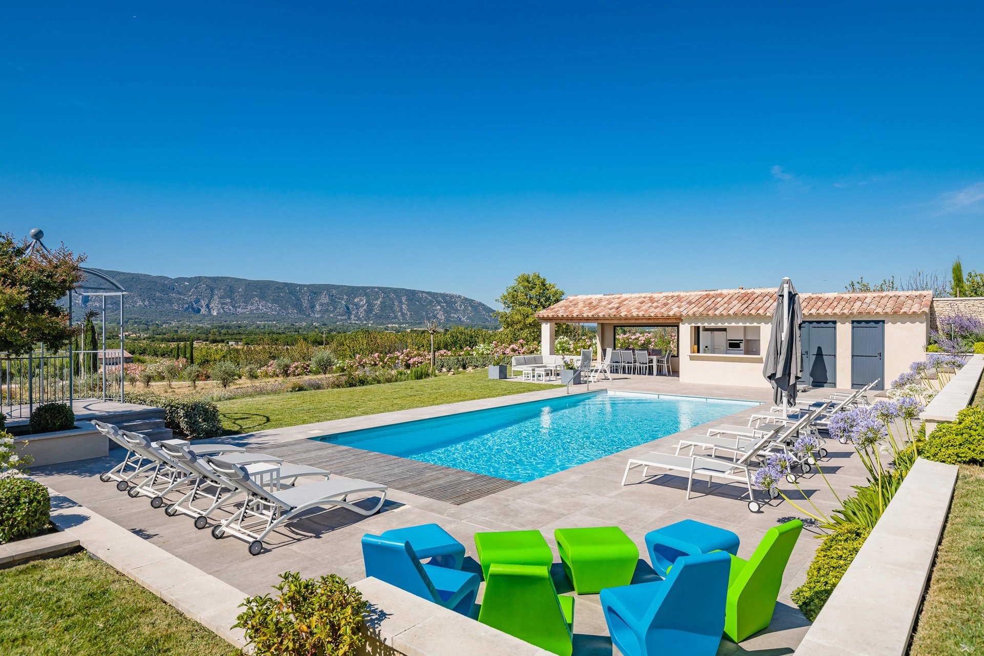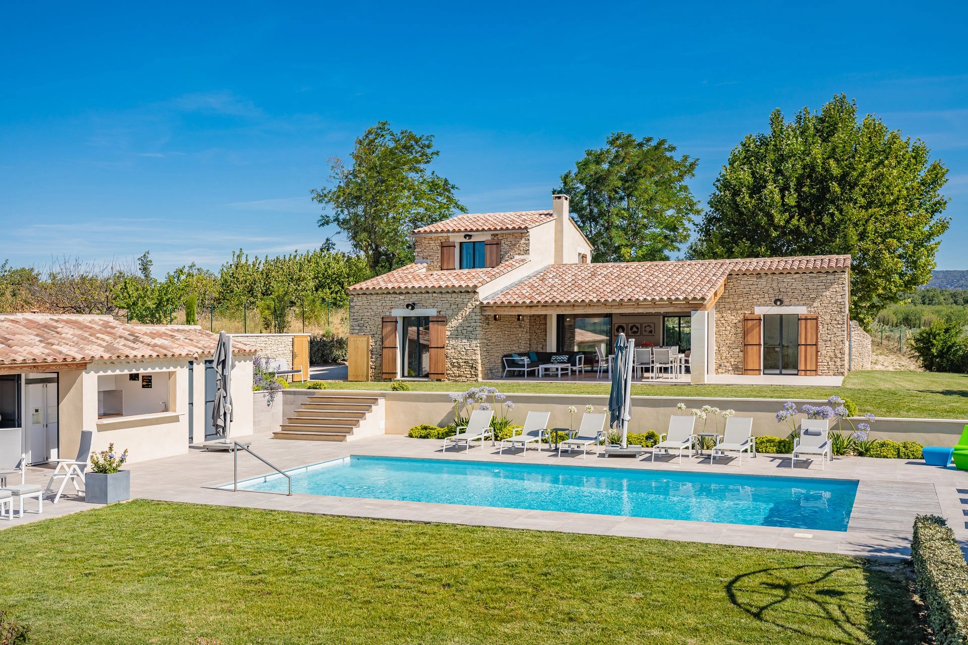 A few minutes drive from the village of Gordes, you will discover this gorgeous house away from the hustle and bustle. Facing the Luberon hill, it offers a clear view over the approx. 2 hectares garden. Beautiful secure 11 x 5 m pool with comfortable sunbeds and large umbrellas, equipped summer kitchen with a nice shaded terrace.