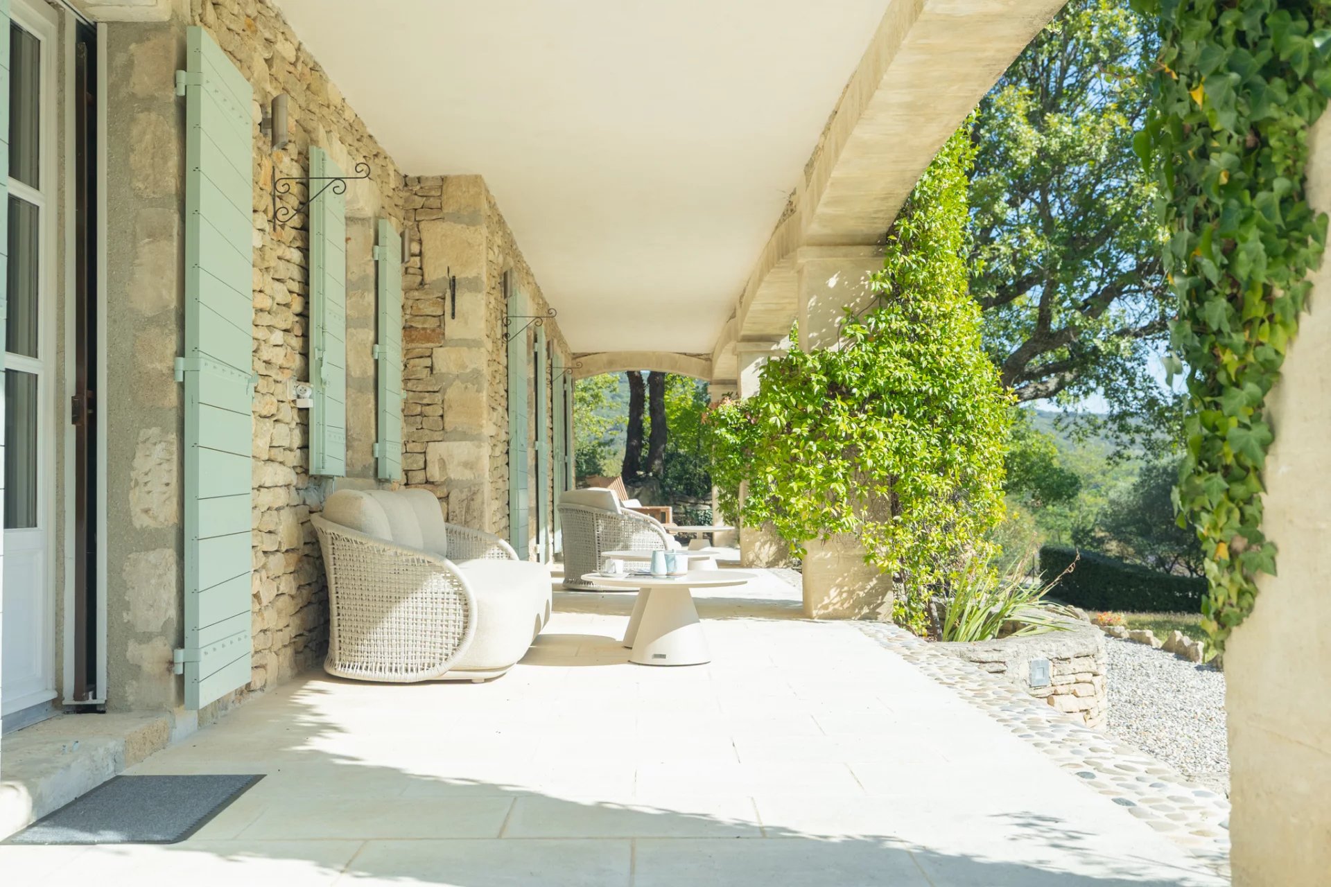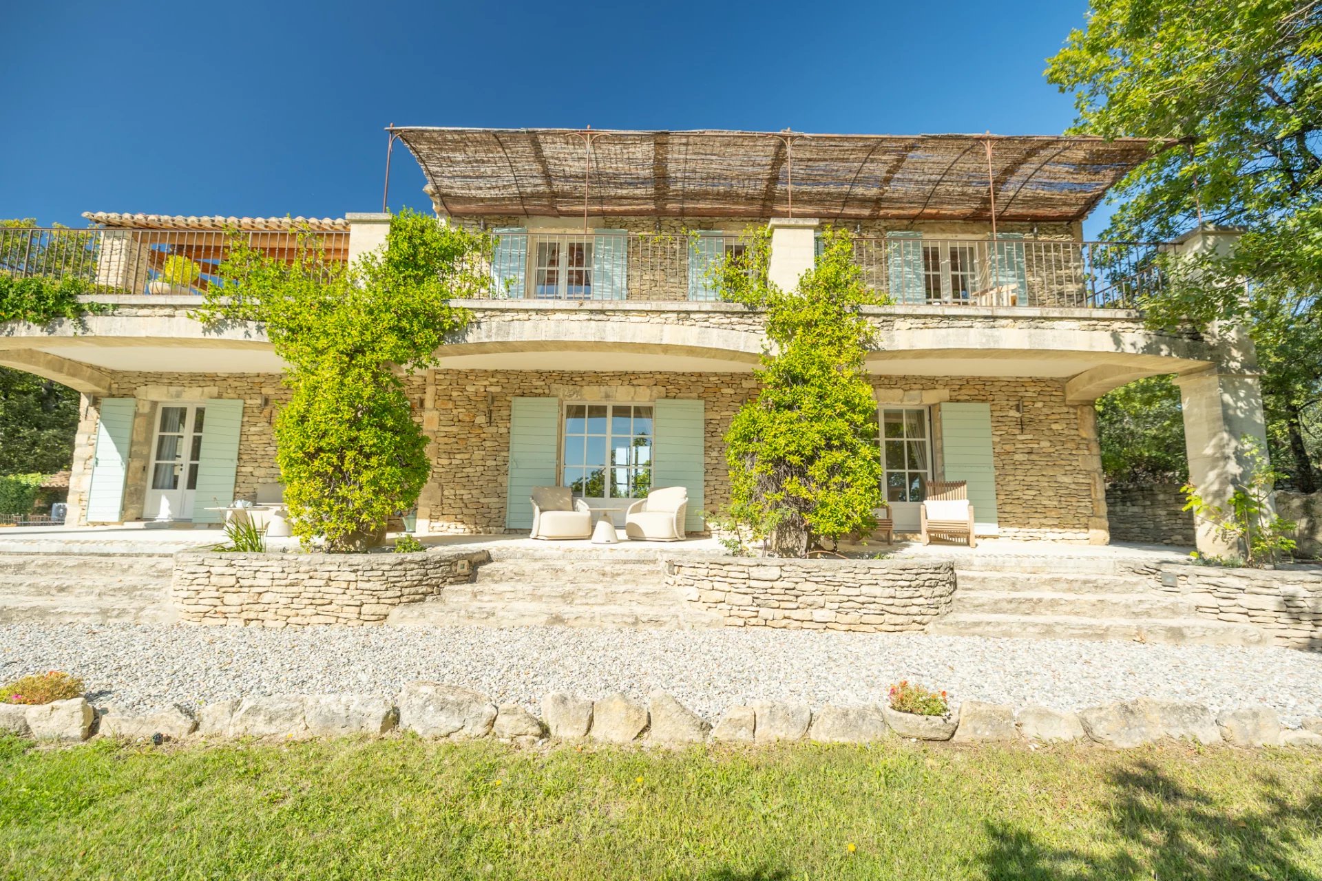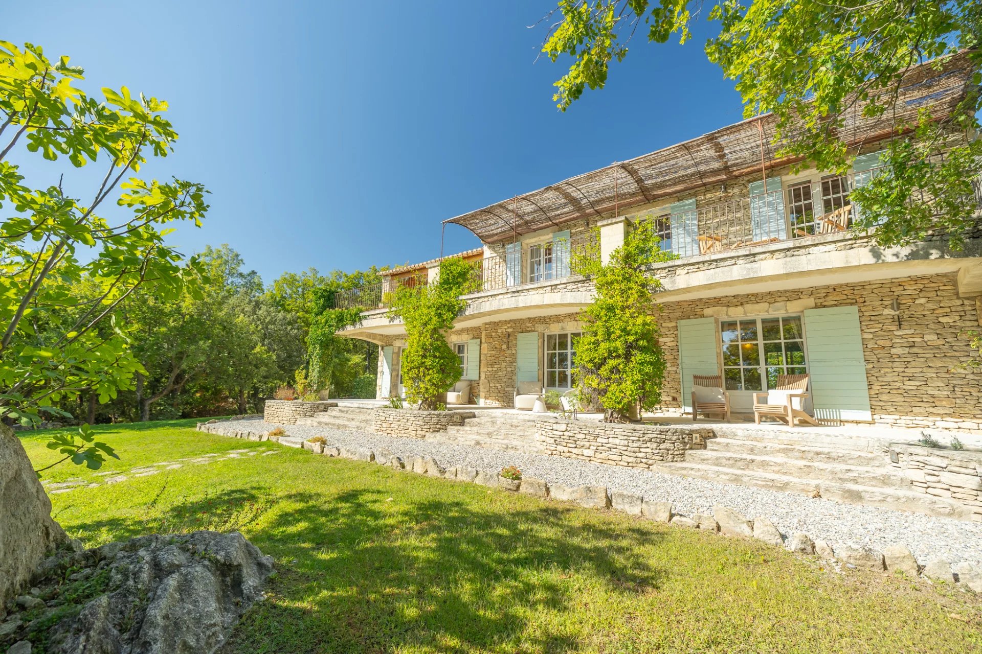 Less than a ten-minute walk from the centre of the iconic village of Gordes, yet in a peaceful location in a privileged natural setting between forest and rocks, lies this magnificent stone house with breathtaking views of the Luberon and its surroundings.