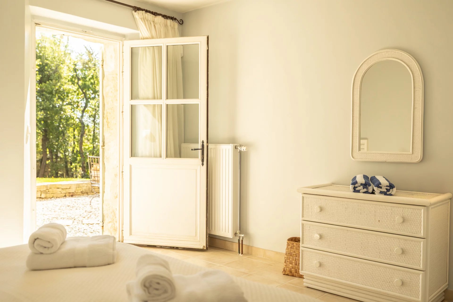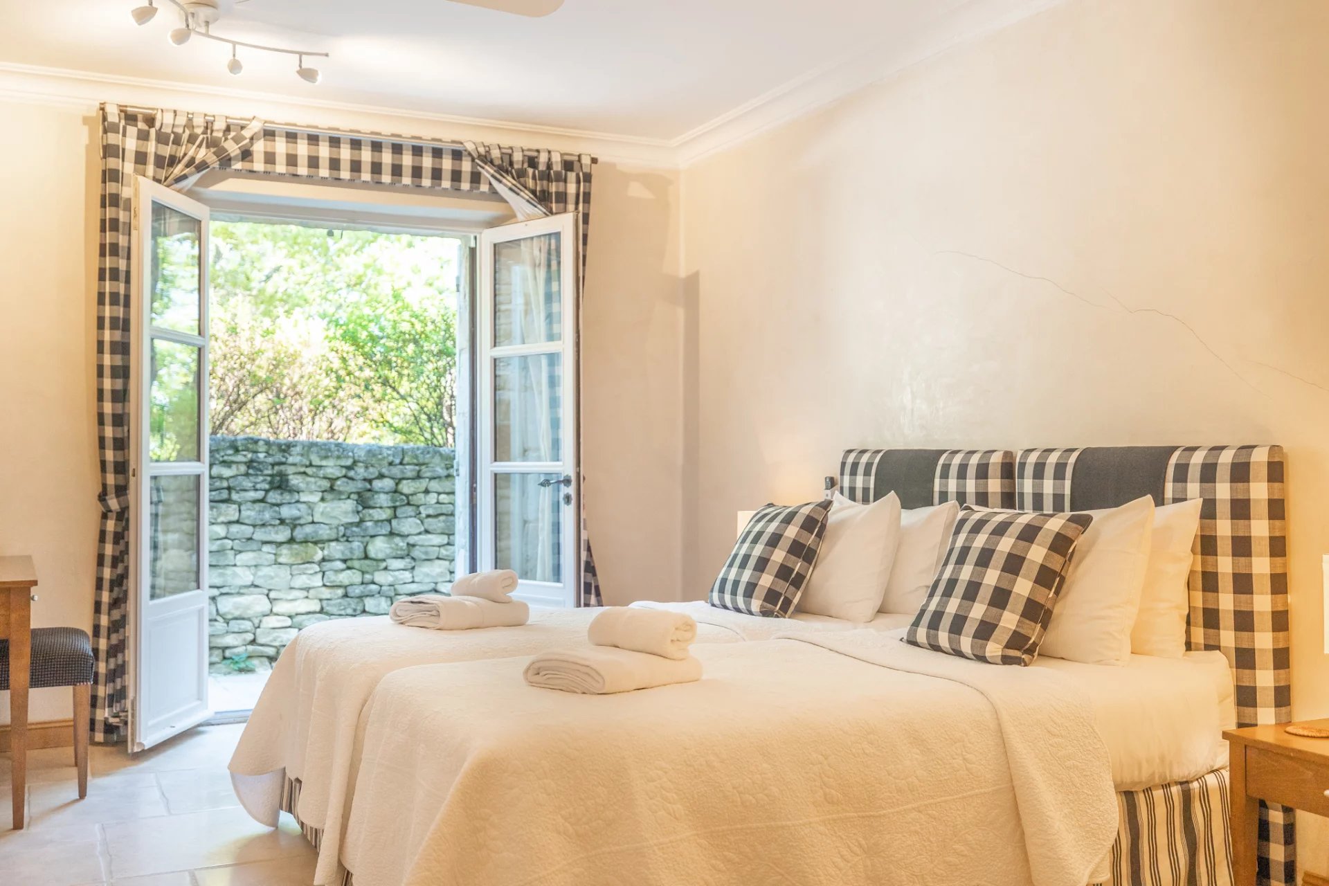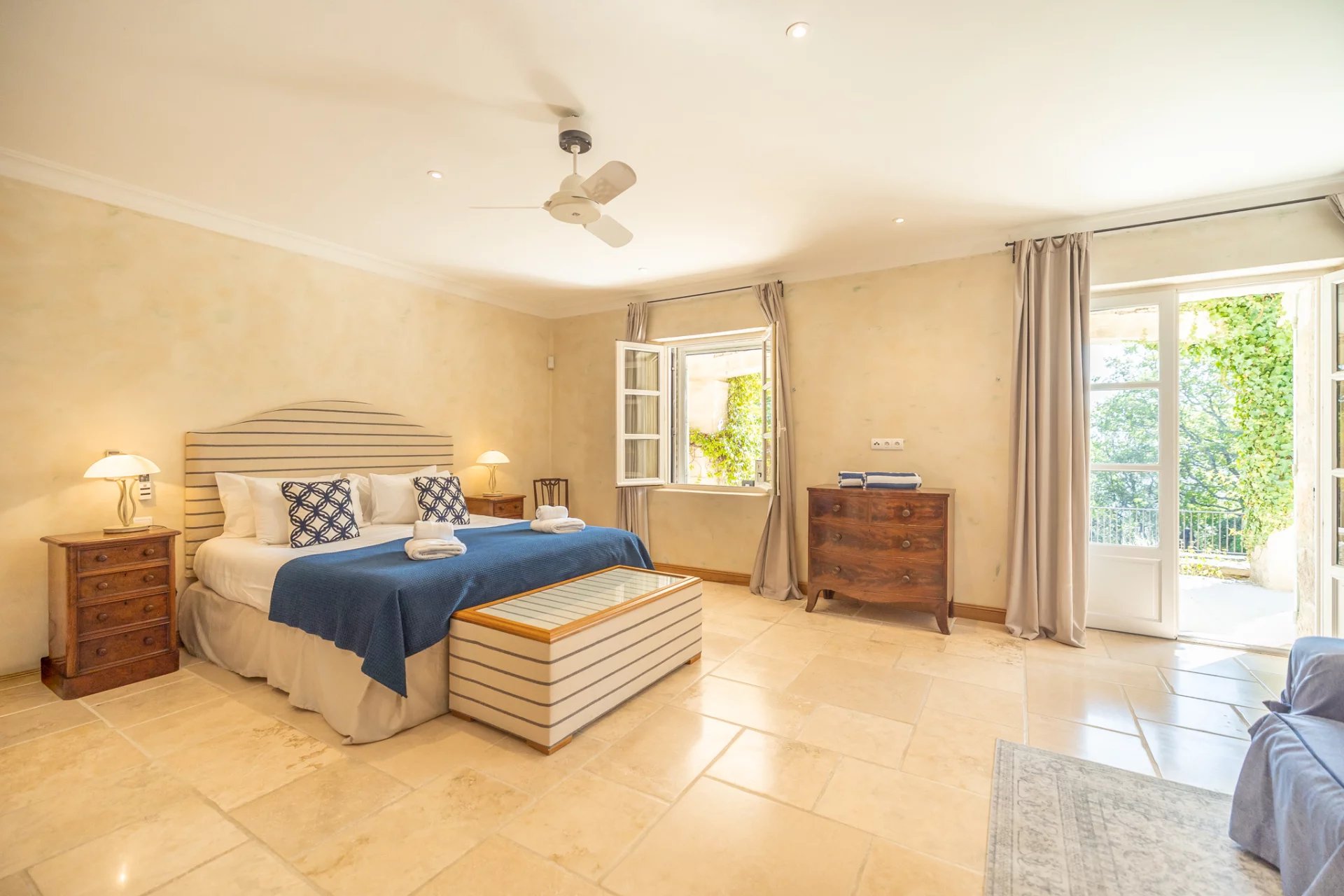 with king-size bed (180x200), or two twin beds, ceiling fan, dressing room, private access to the outside and en suite bathroom with bath and shower, washbasin and toilet.
