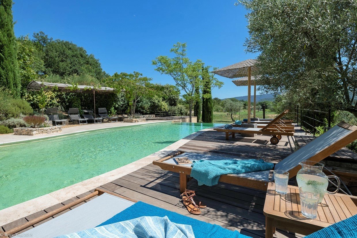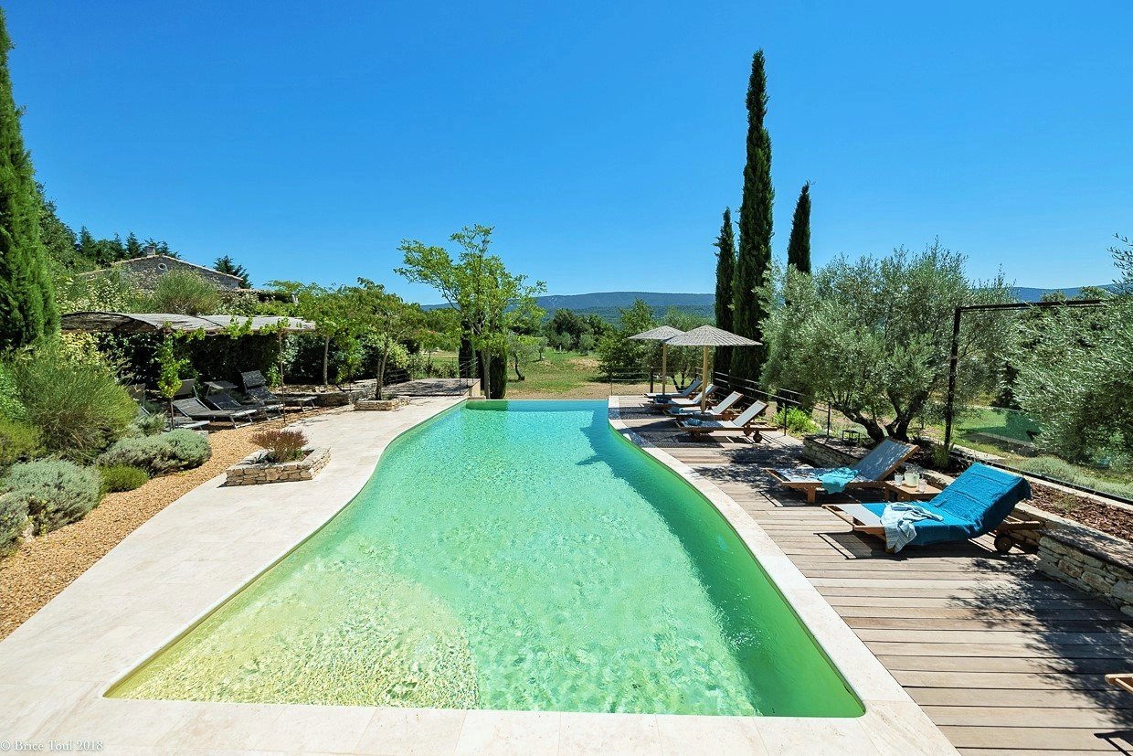 Ideally located a quarter of an hour's walk from the center of the village of Goult, but out of sight, this incredible property, restored with refinement, awaits you for a heavenly vacation. The view of the Luberon is unobstructed from the beautiful garden and its many Mediterranean species. The charm also lies in the many terraces, private or otherwise, and shady corners. The superb free-form infinity pool (15m long) offers panoramic views of the Luberon, and is equipped with a small summer kitchen, outdoor shower, lounge area and plenty of sun loungers.