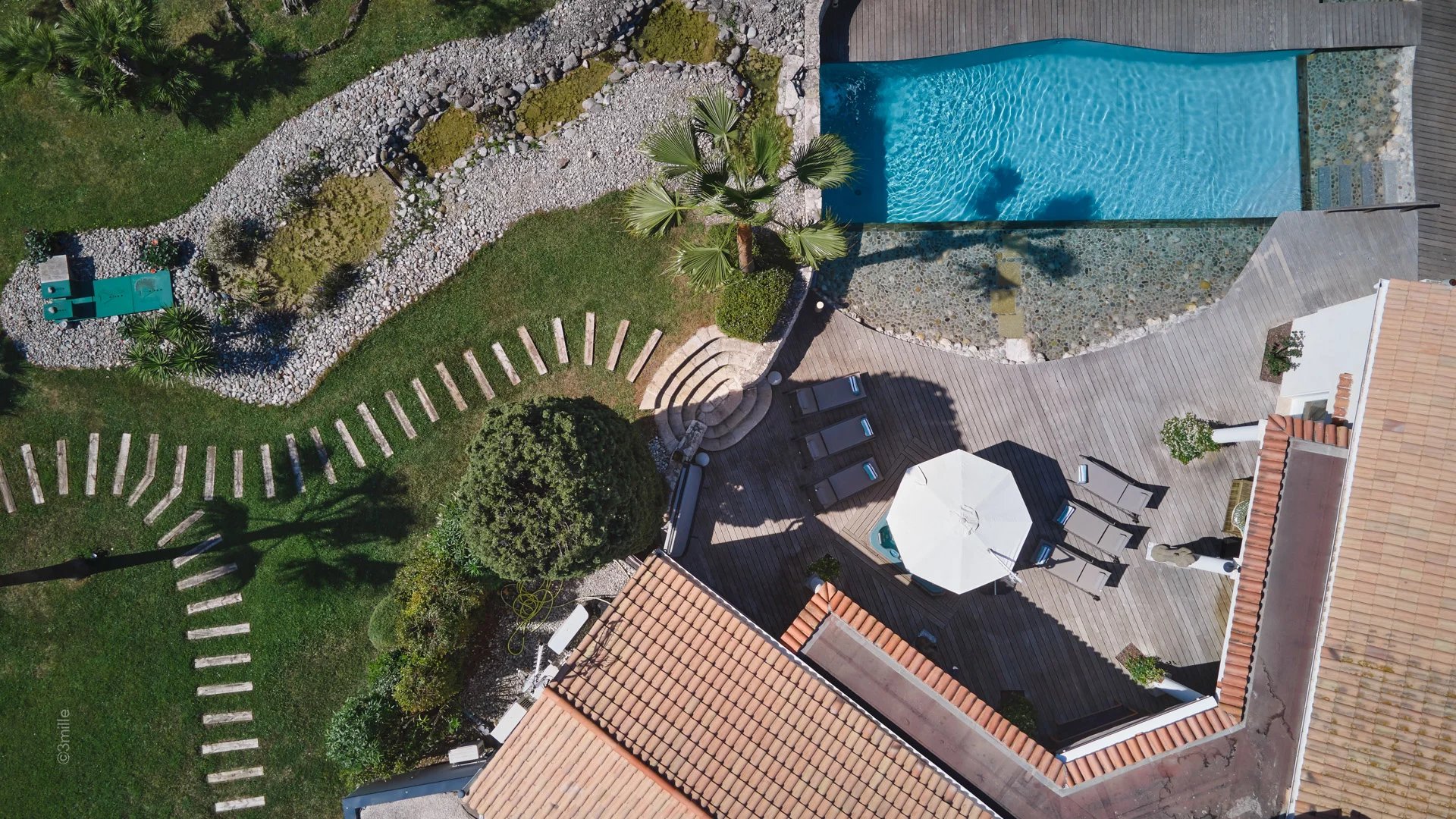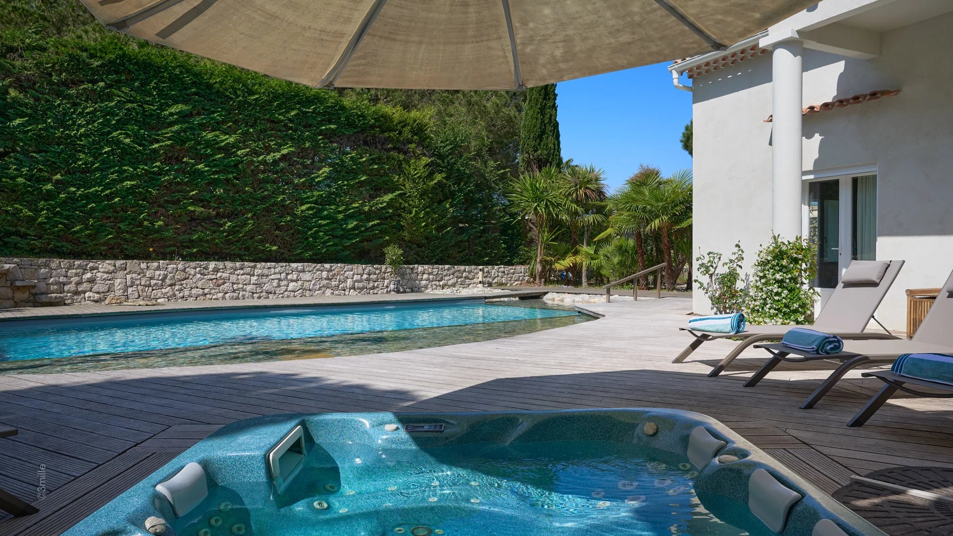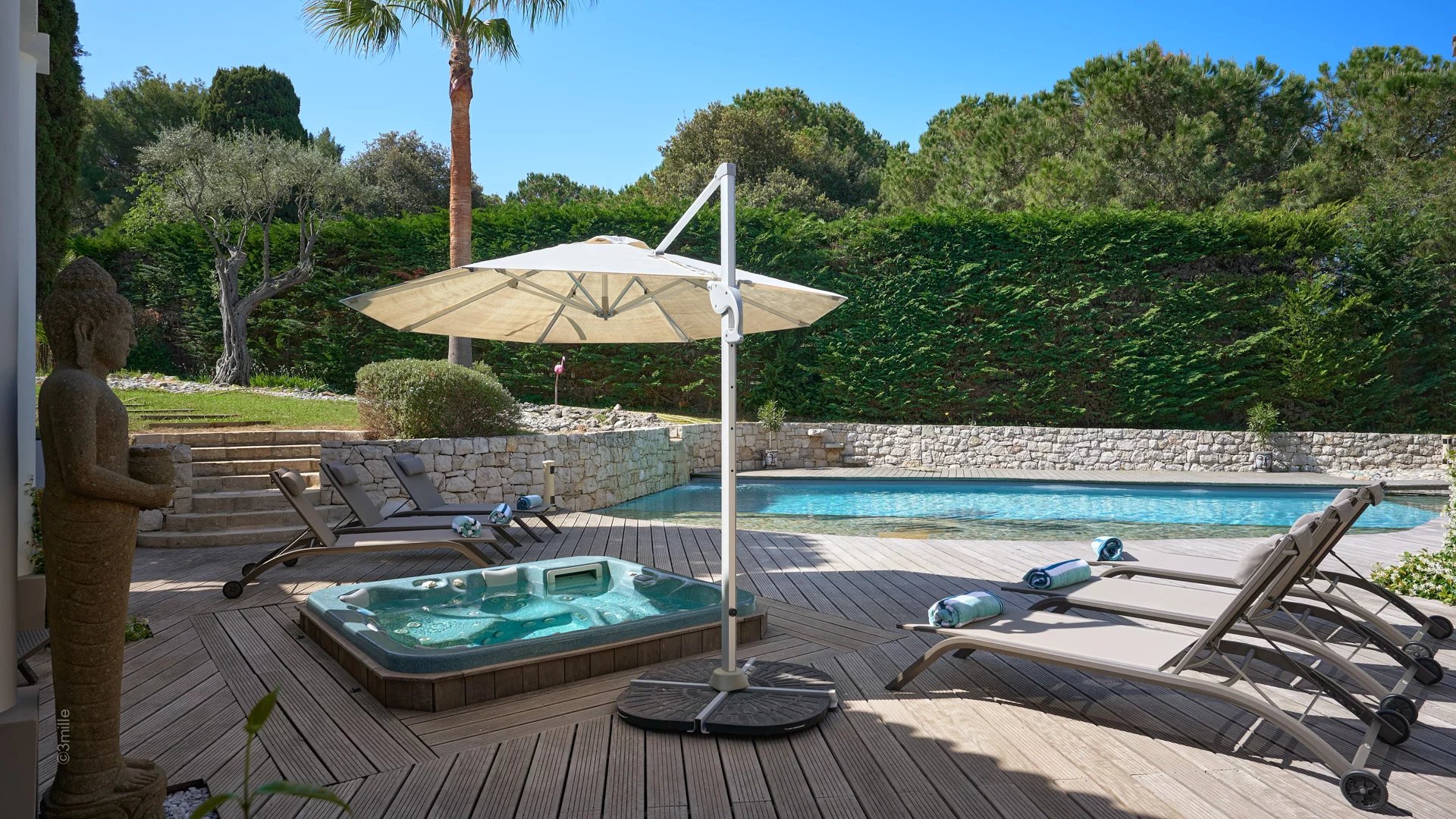 This has been built with natural stones and rocks with a stream, waterfall and a jacuzzi