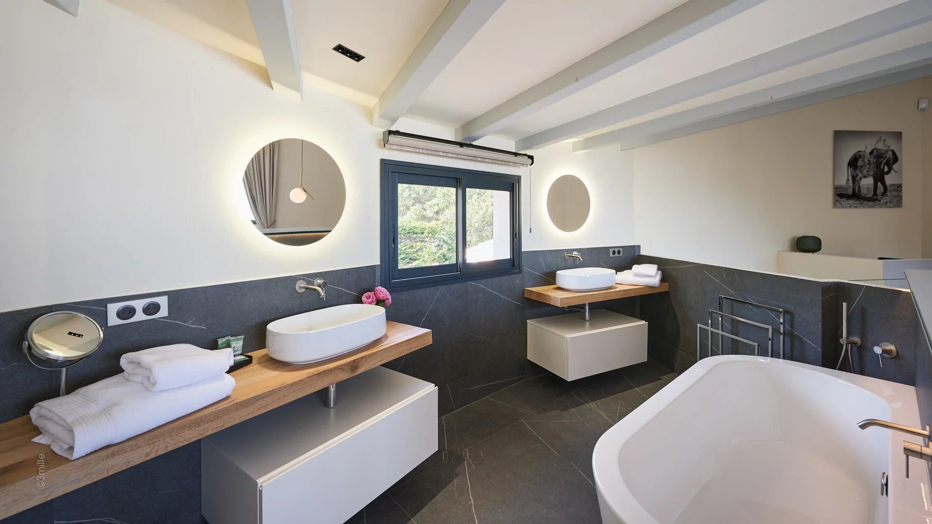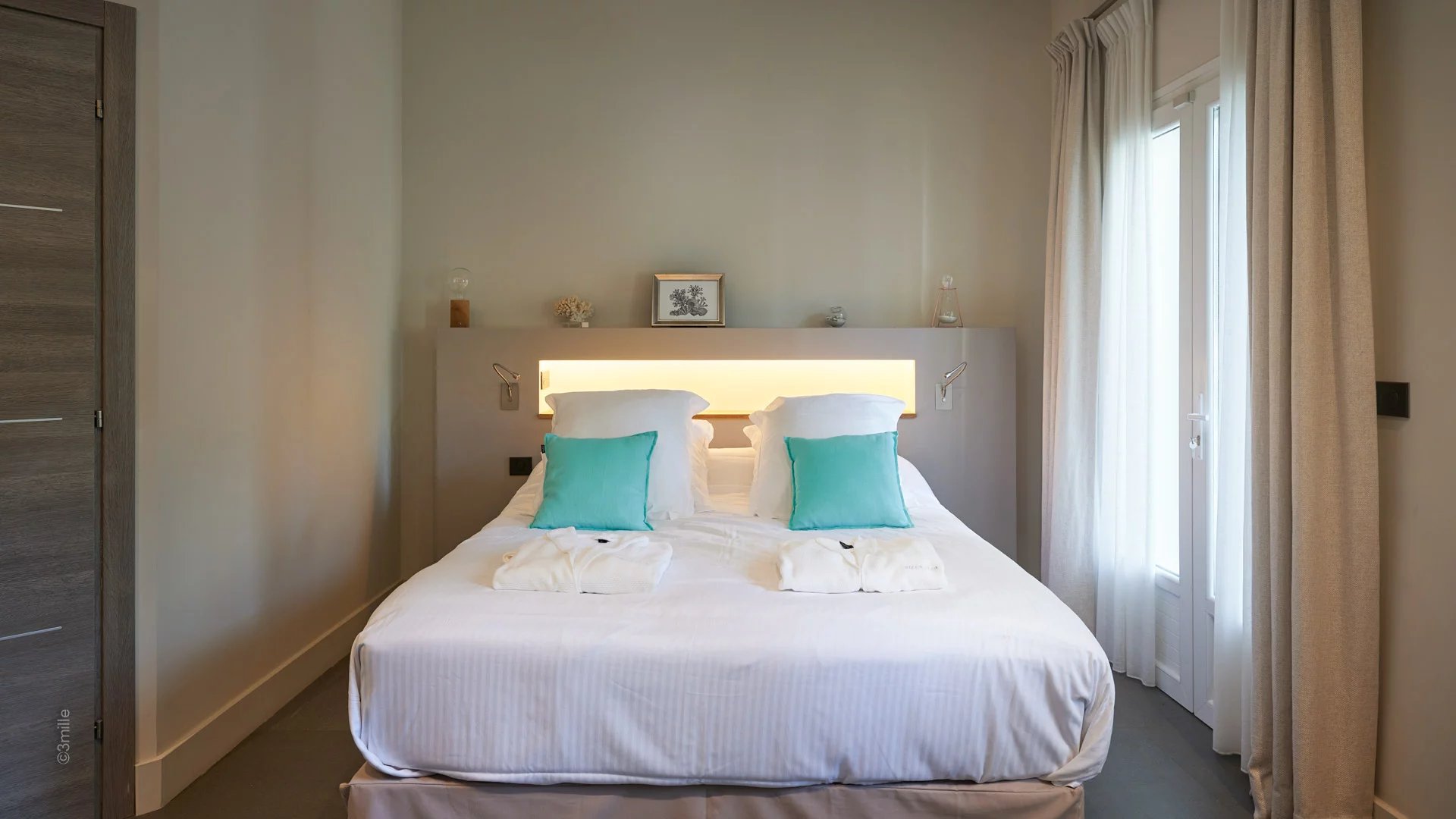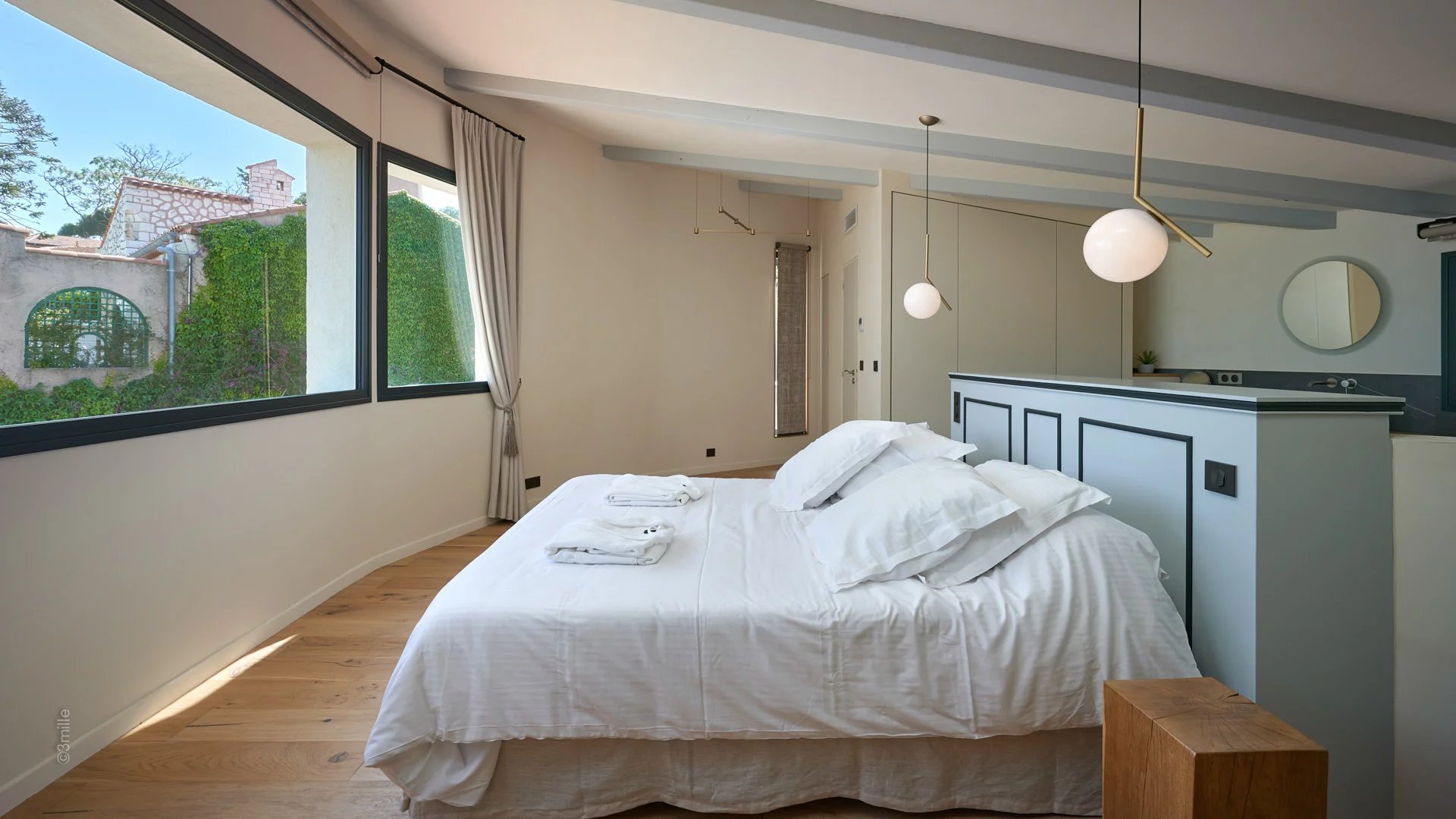 Master bedroom (double bed), view on "La Salis" and the old town of Antibes - Open bathroom /WC