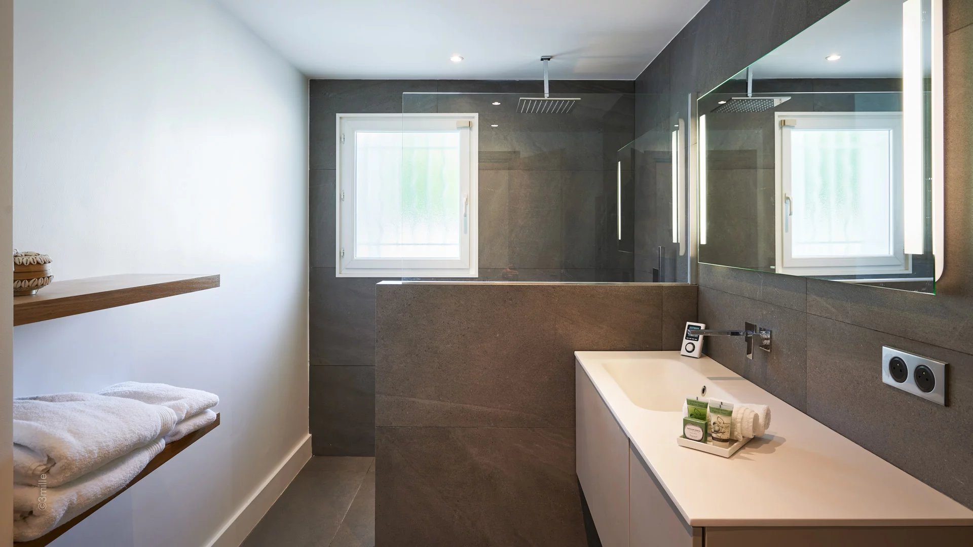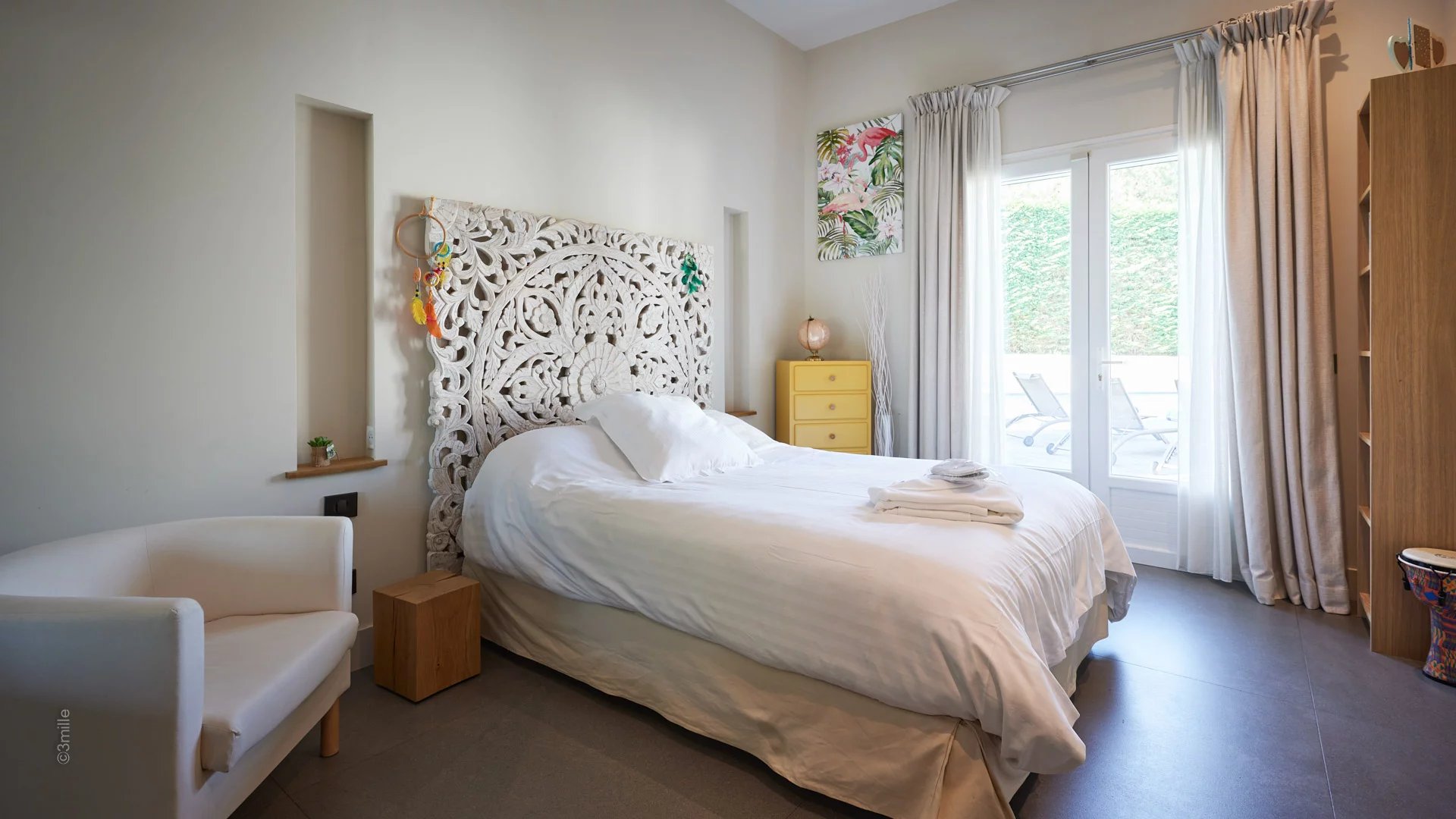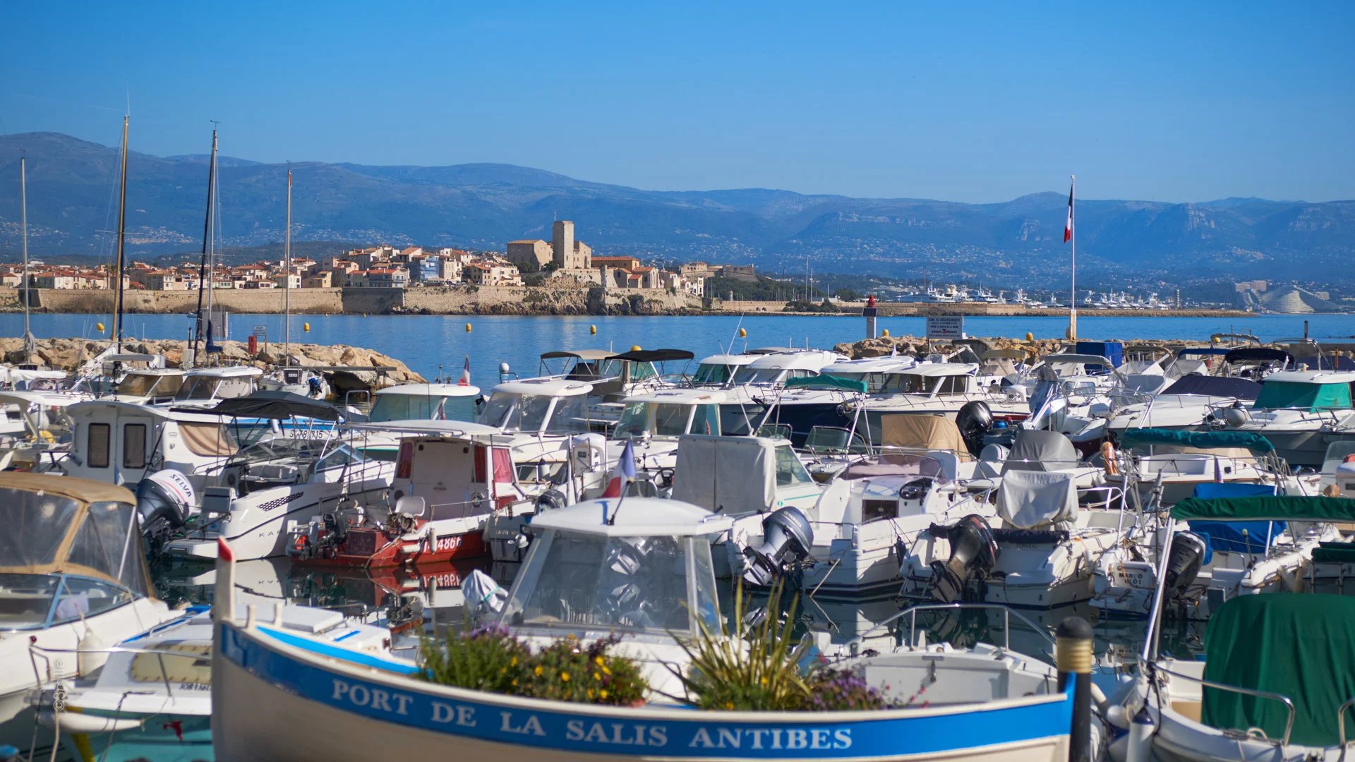 Master bedroom (double bed), view on "La Salis" and the old town of Antibes - Open bathroom /WC
