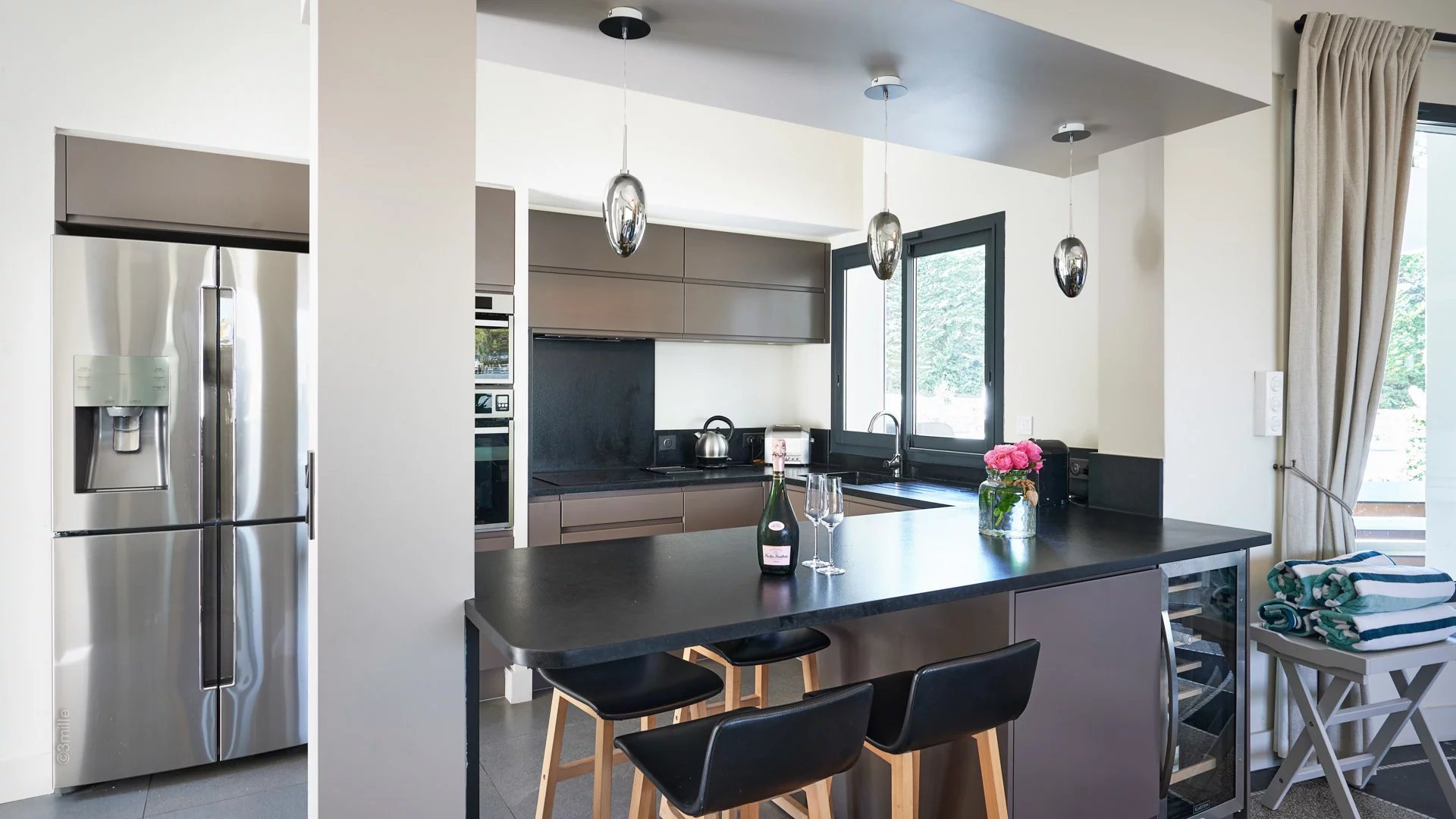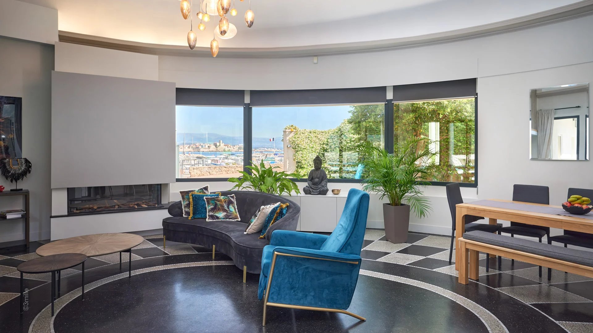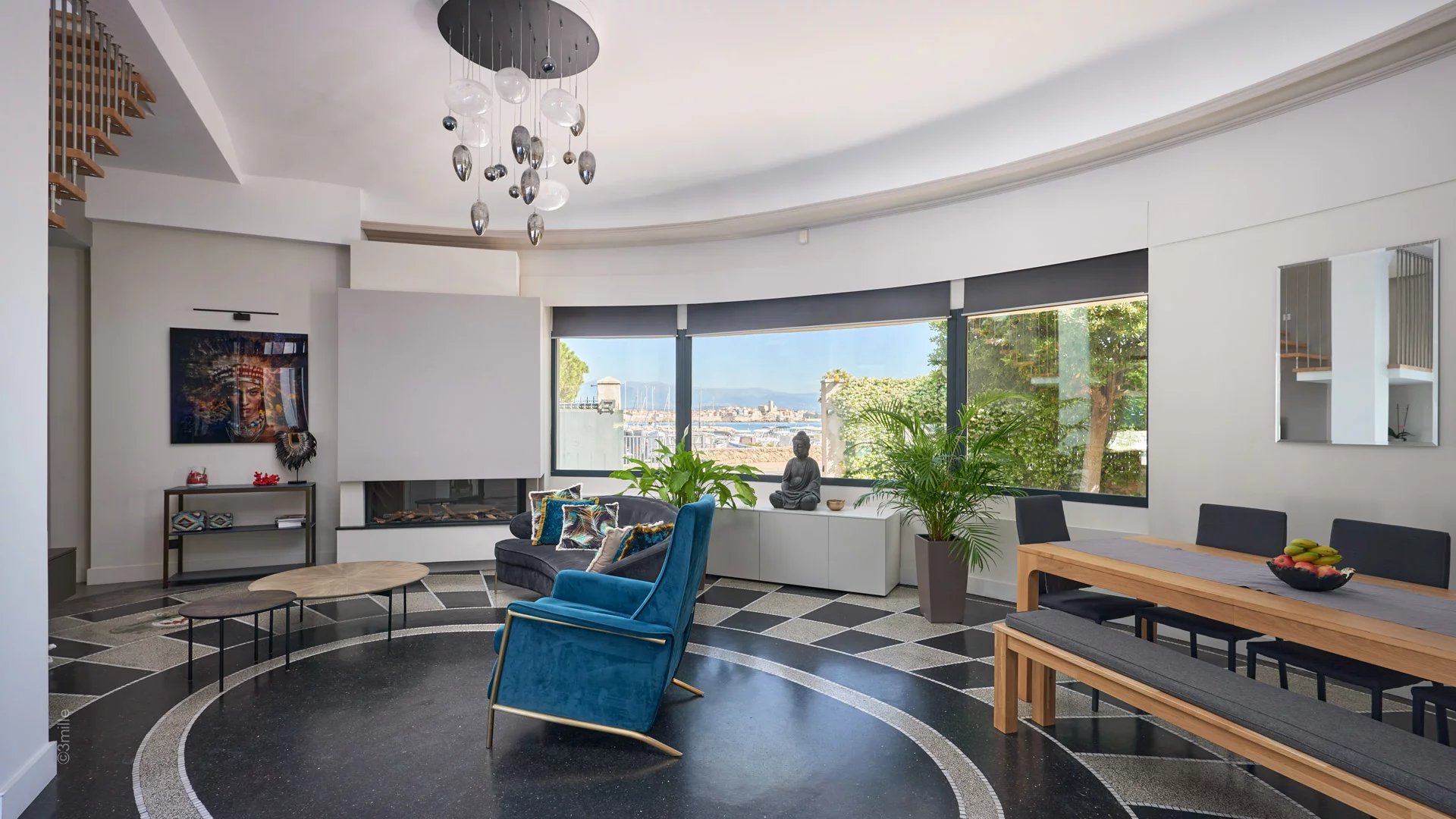 Entrance leading to the circular reception room opening by large bay windows onto the terrace and the garden, and comprising living room, dining area and open plan kitchen