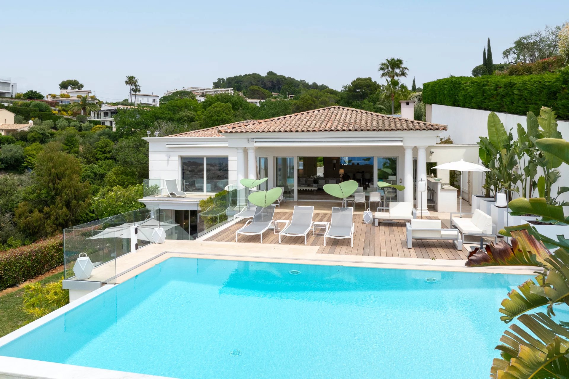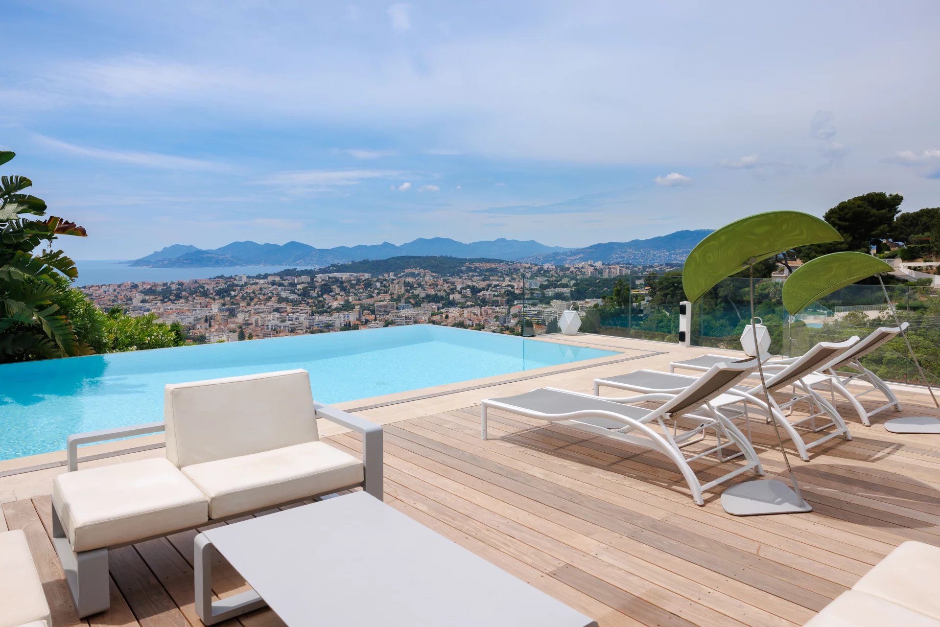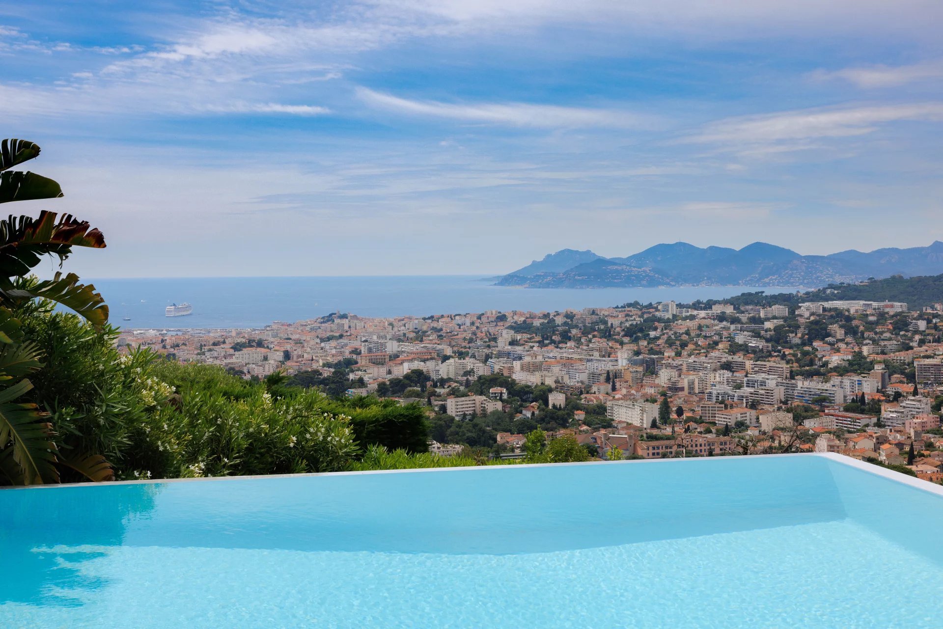 On the hills of Cannes, in a private domain, the villa enjoys a nice view over the Bay of Cannes and the "massif de l'Estérel".