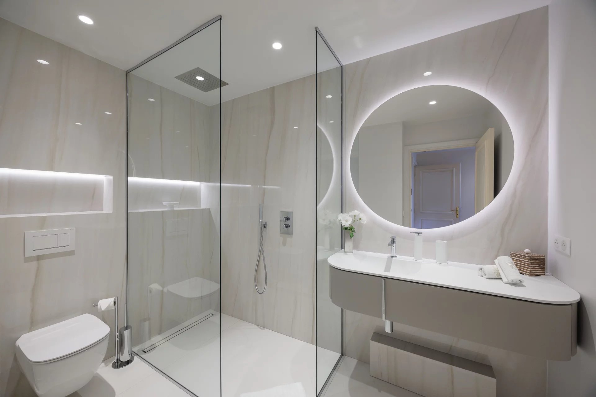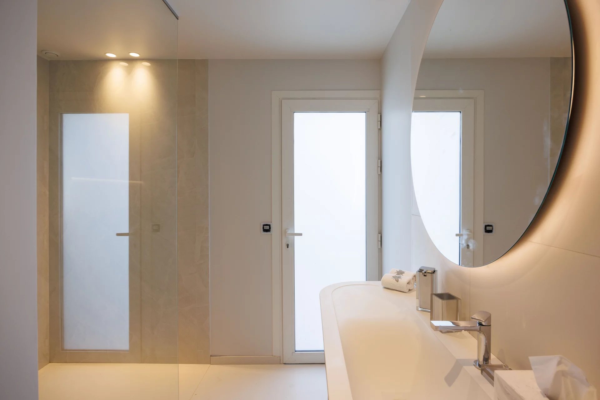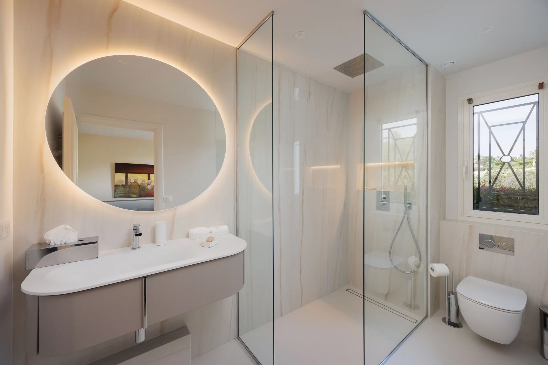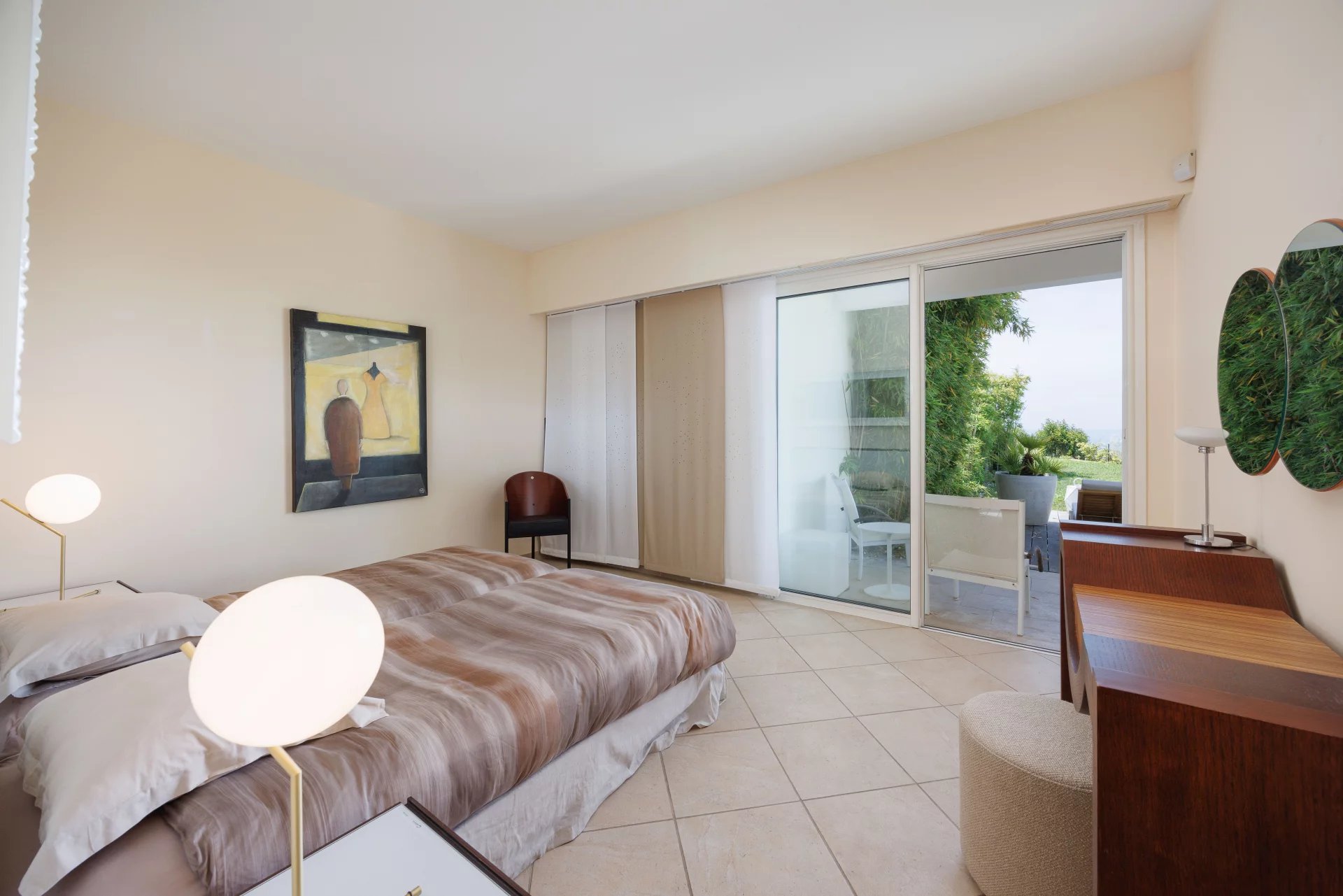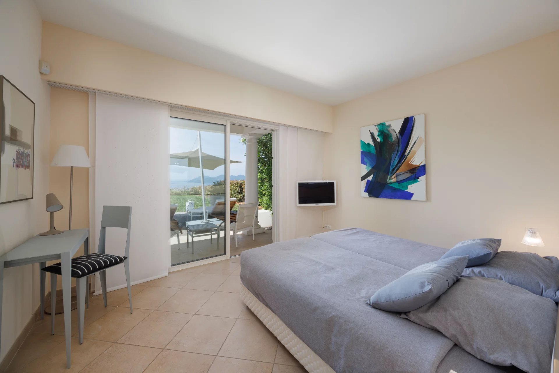 Master bedroom with king size bed, study enjoying terrace overlooking the garden and the Bay. Ensuite bathroom / shower / WC