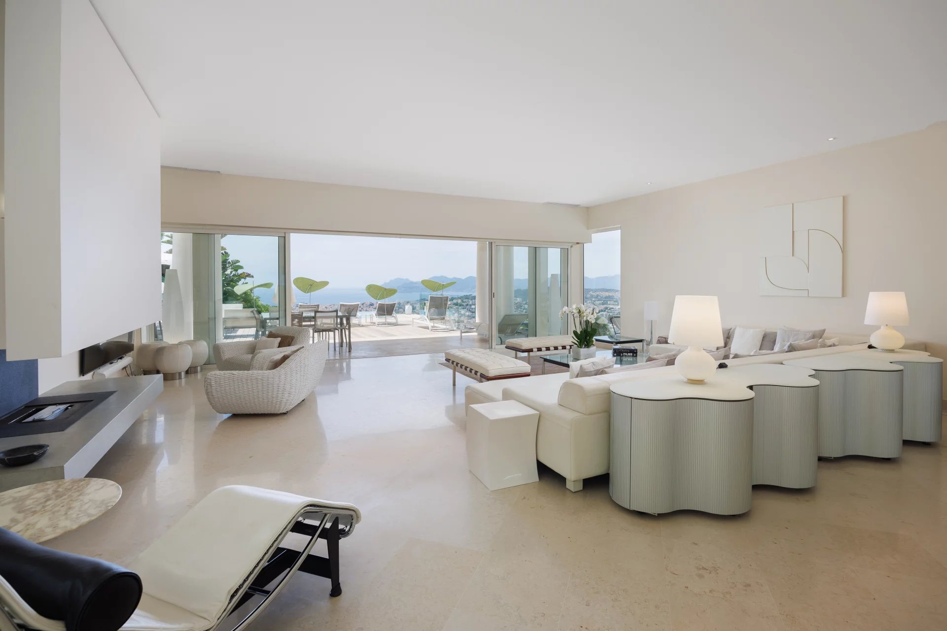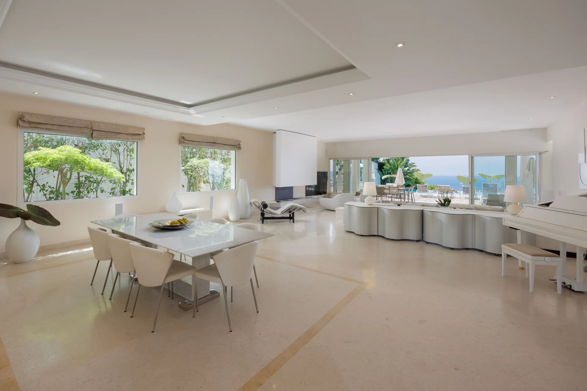 Large living / dining area (100 sq.m) with fireplace and piano, opening onto the terrace and the swimming-pool, sea view