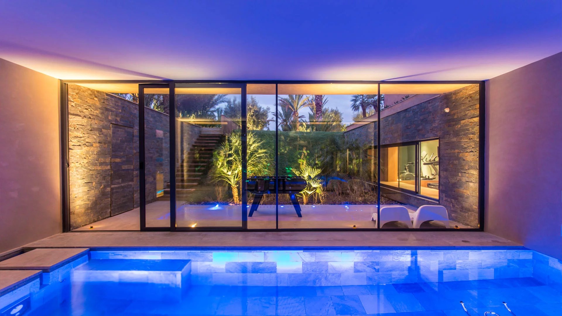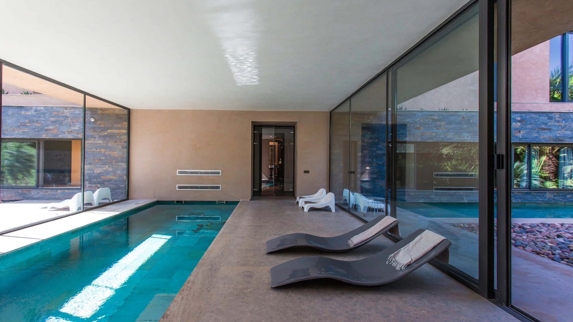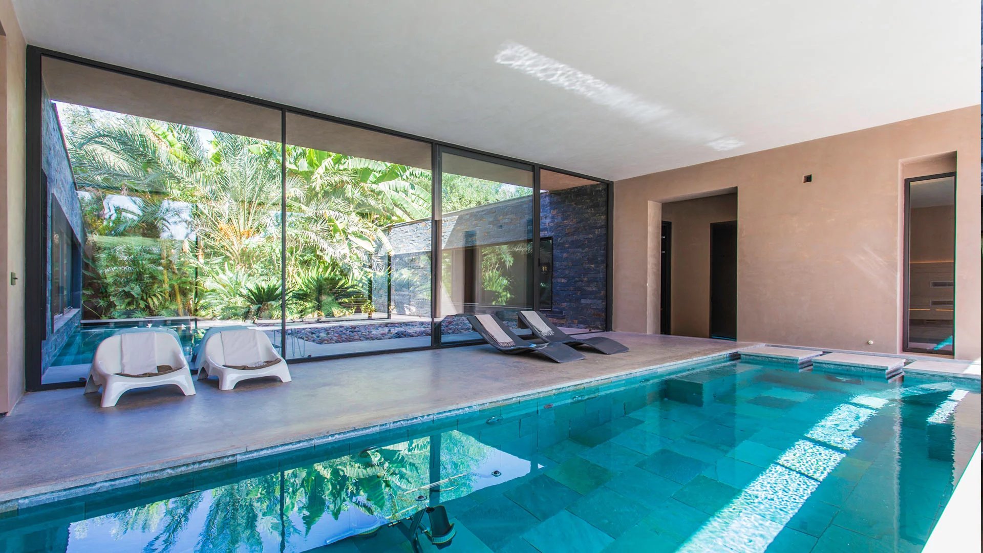 But the hidden charm of this incredible villa lies particularly in its lower floor, with a large private spa, accessible from the outside. In this haven of relaxation, you'll find an indoor pool, hammam, sauna, hair and nail salon and gym.