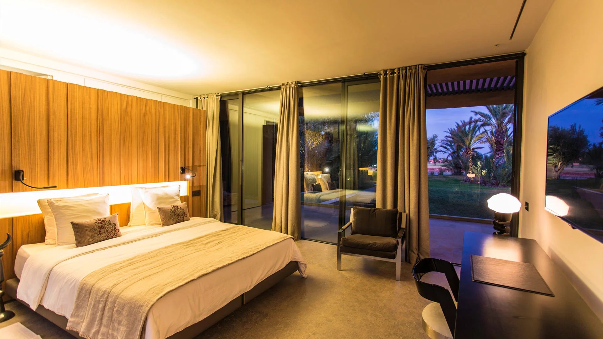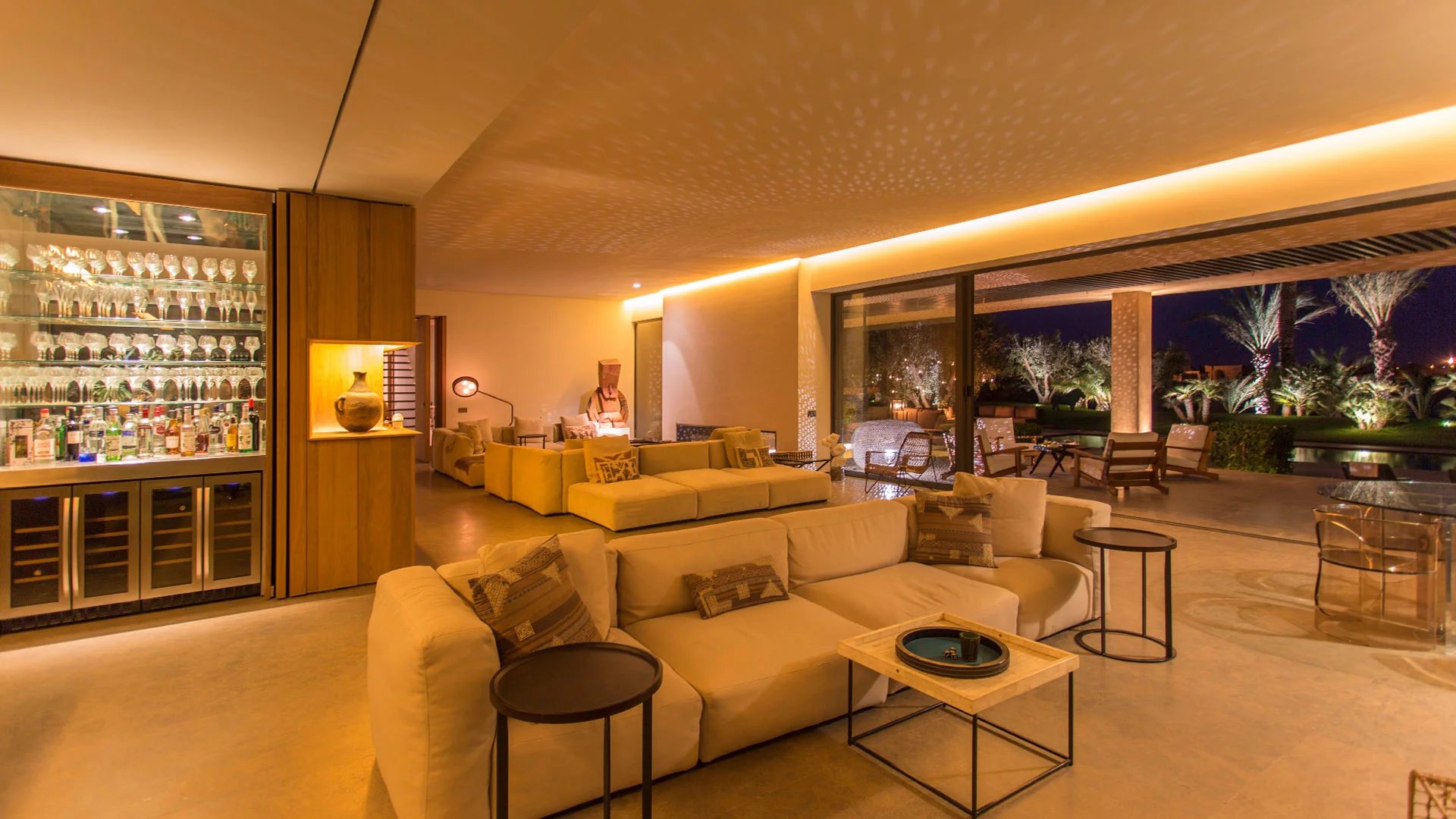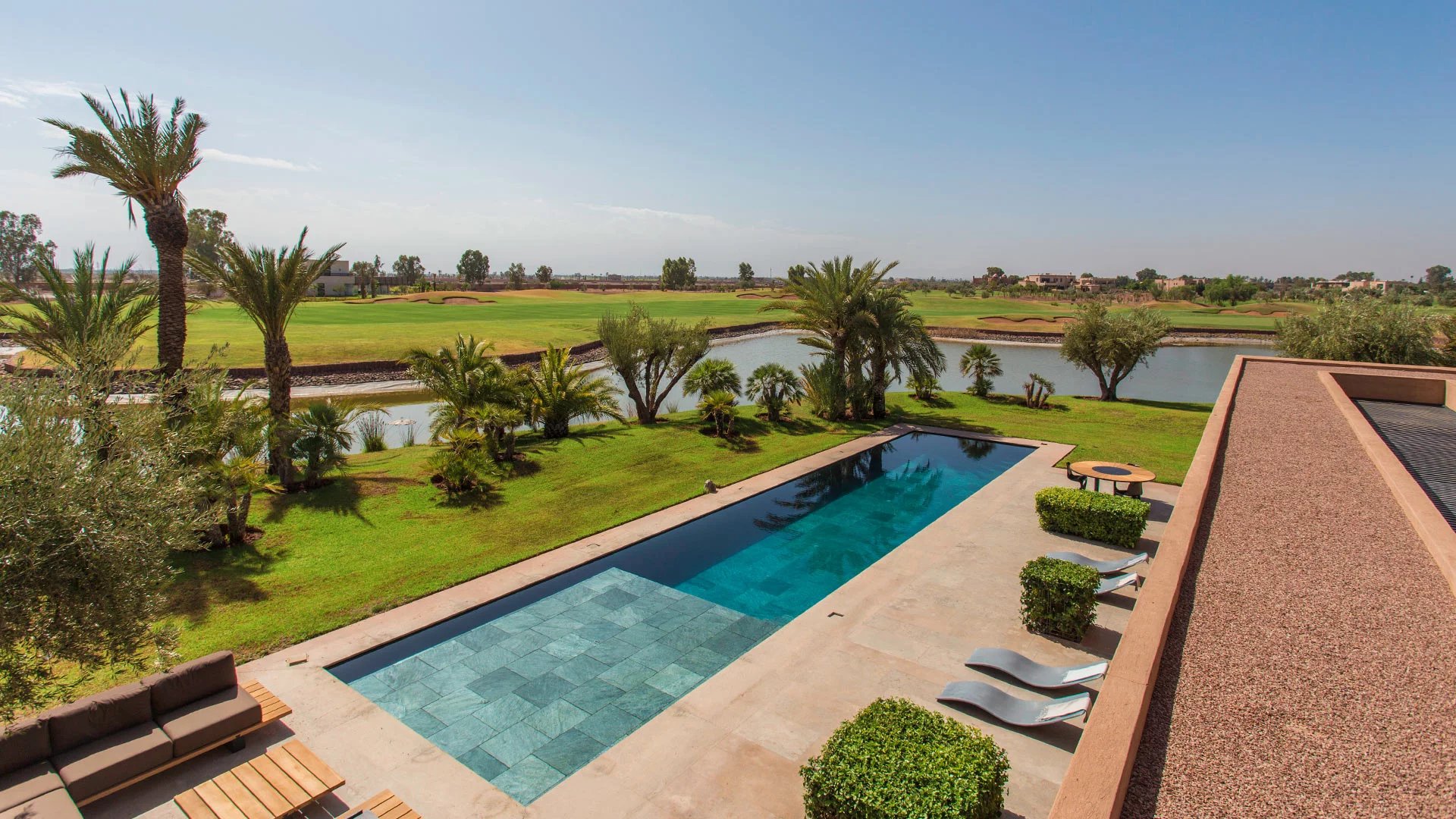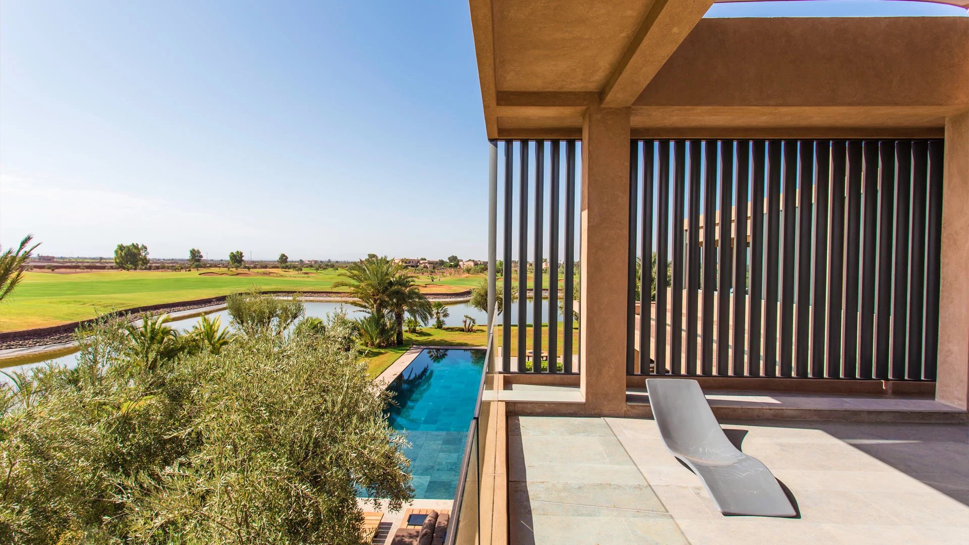 With its 6 bedrooms and 6 bathrooms, it can accommodate up to 16 people for an ideal Moroccan stay. An elevator provides access to the villa's various floors. The main floor, where you enter the villa, features a double living room with fireplace, opening onto a terrace and a beautiful heated swimming pool with sparkling blue tiles and a 180° view of the Atlas Mountains. Then there's a cocktail bar, a kitchen, a dining area, a lounge area on the covered terrace with armchairs and sofas, and 2 bedrooms with king-size beds overlooking the golf course, with en suite bathrooms and large private terraces. On the upper floor, you'll find 3 king-size bedrooms with private terraces and en-suite bathrooms.