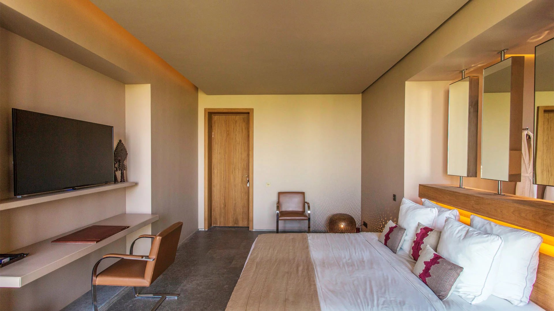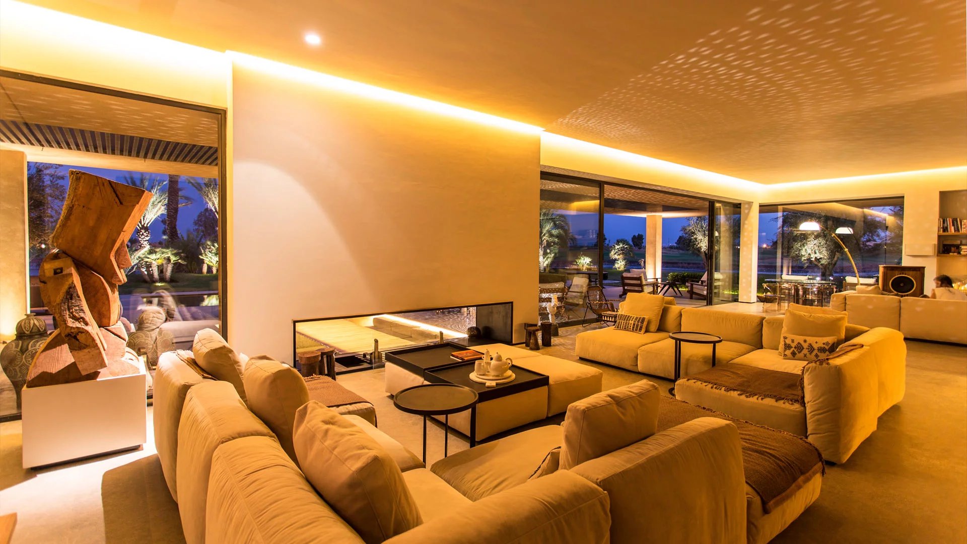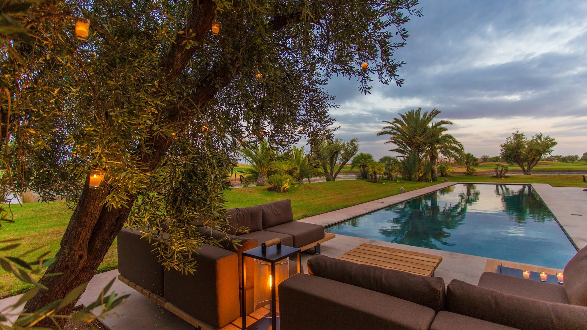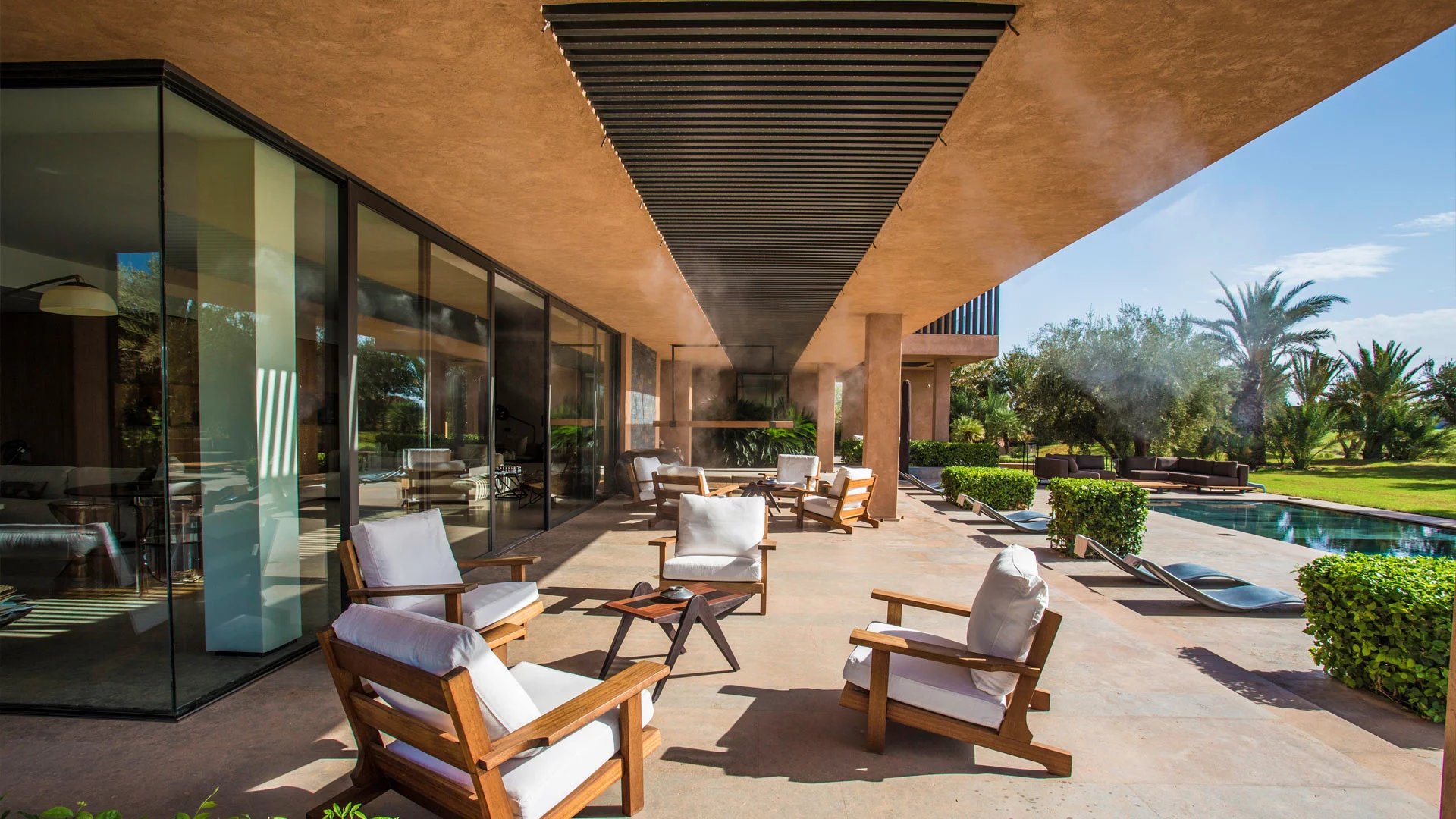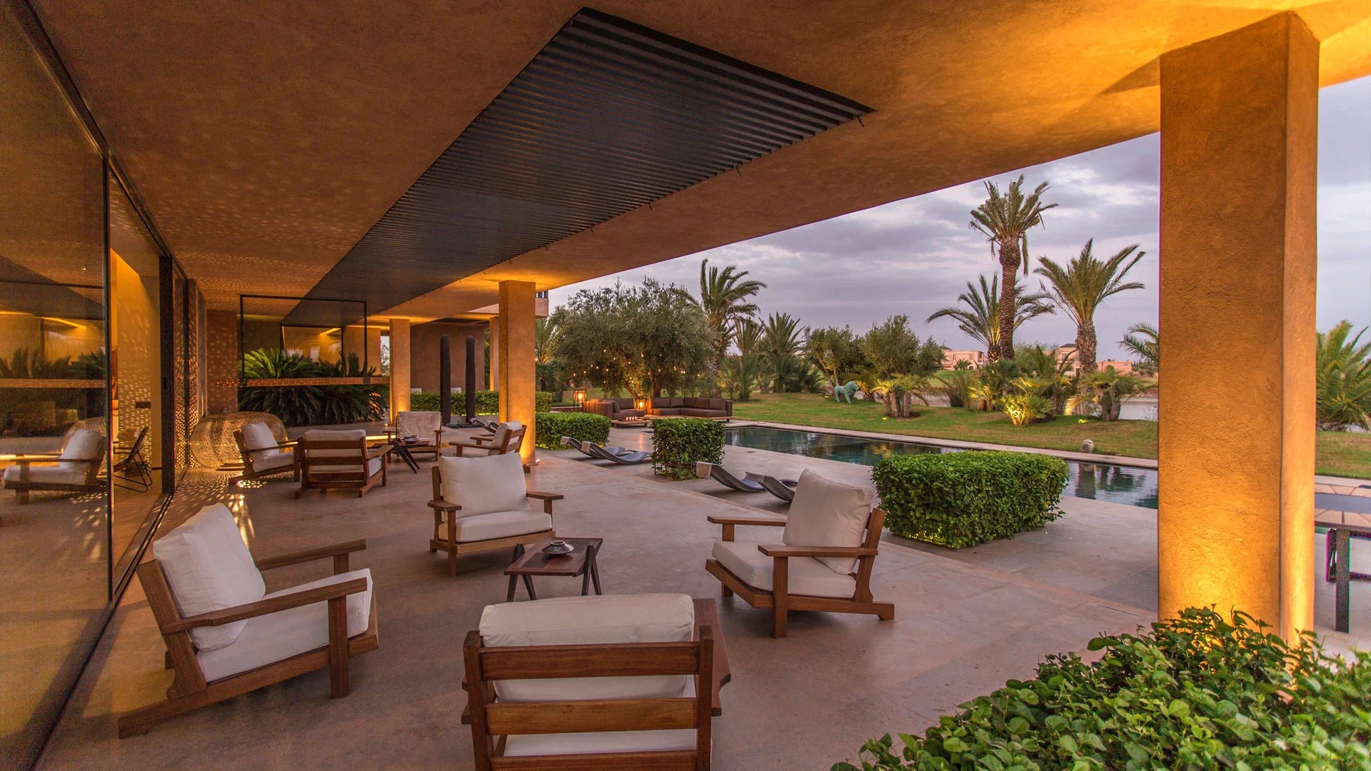 With its 6 bedrooms and 6 bathrooms, it can accommodate up to 16 people for an ideal Moroccan stay. An elevator provides access to the villa's various floors. The main floor, where you enter the villa, features a double living room with fireplace, opening onto a terrace and a beautiful heated swimming pool with sparkling blue tiles and a 180° view of the Atlas Mountains. Then there's a cocktail bar, a kitchen, a dining area, a lounge area on the covered terrace with armchairs and sofas, and 2 bedrooms with king-size beds overlooking the golf course, with en suite bathrooms and large private terraces. On the upper floor, you'll find 3 king-size bedrooms with private terraces and en-suite bathrooms.
