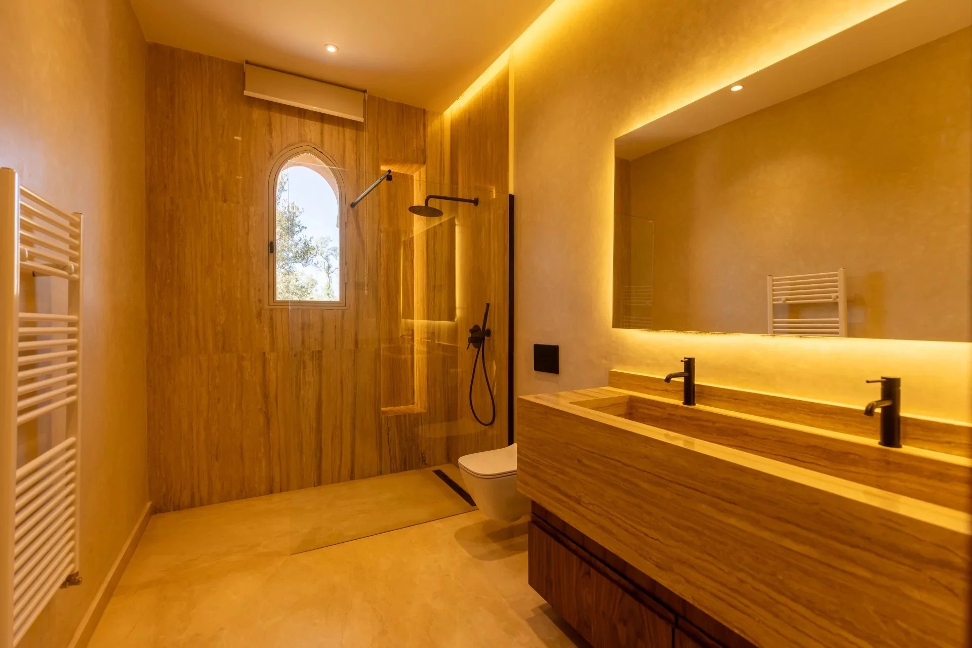 Designed with a modern and refined style, the villa showcases clean architecture, high-end materials, and elegant finishes. The bright living areas are enhanced by large bay windows, filling the space with natural light and offering lovely views of the garden and swimming pool. The main living room is tastefully furnished with designer pieces, creating a warm yet sophisticated atmosphere.