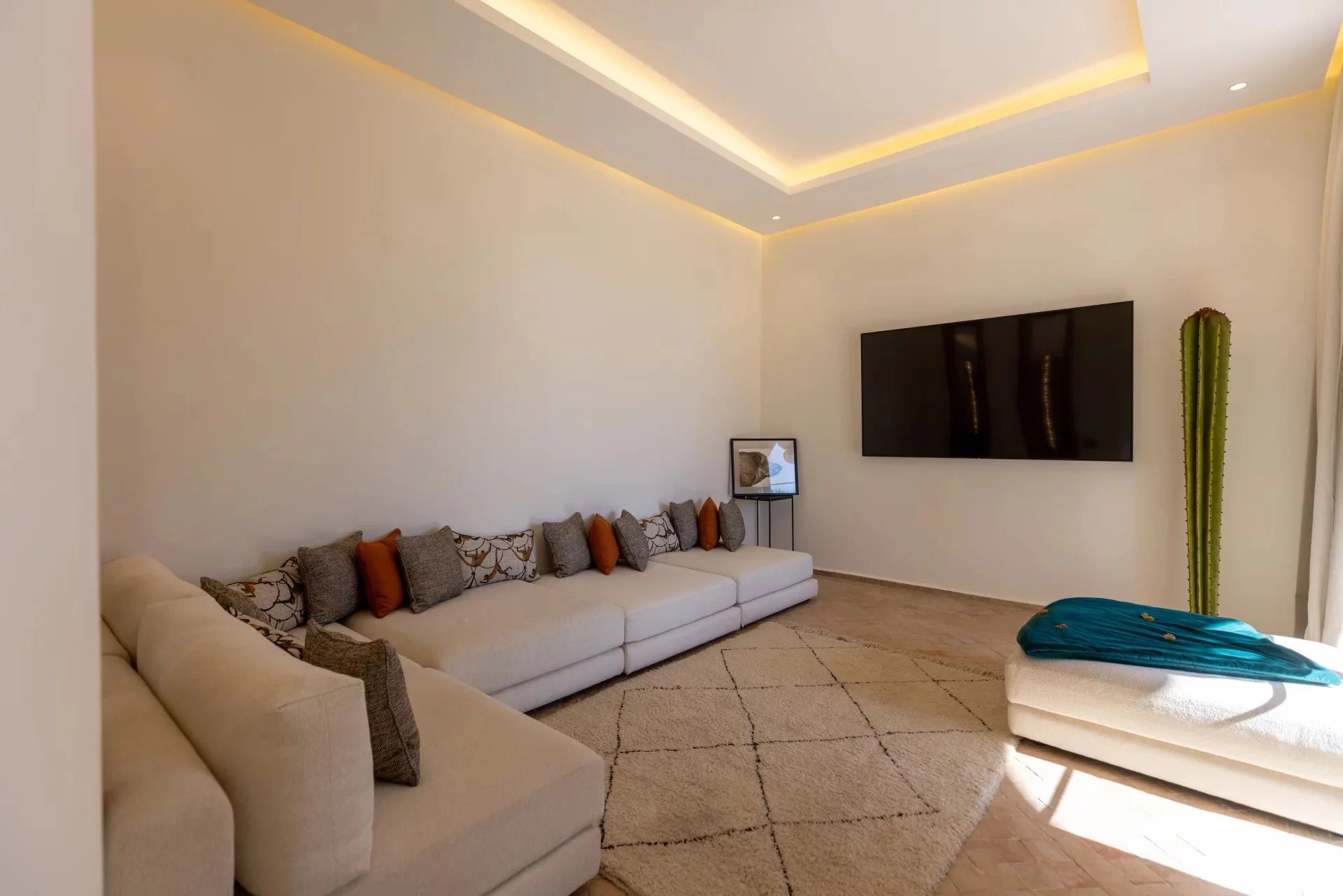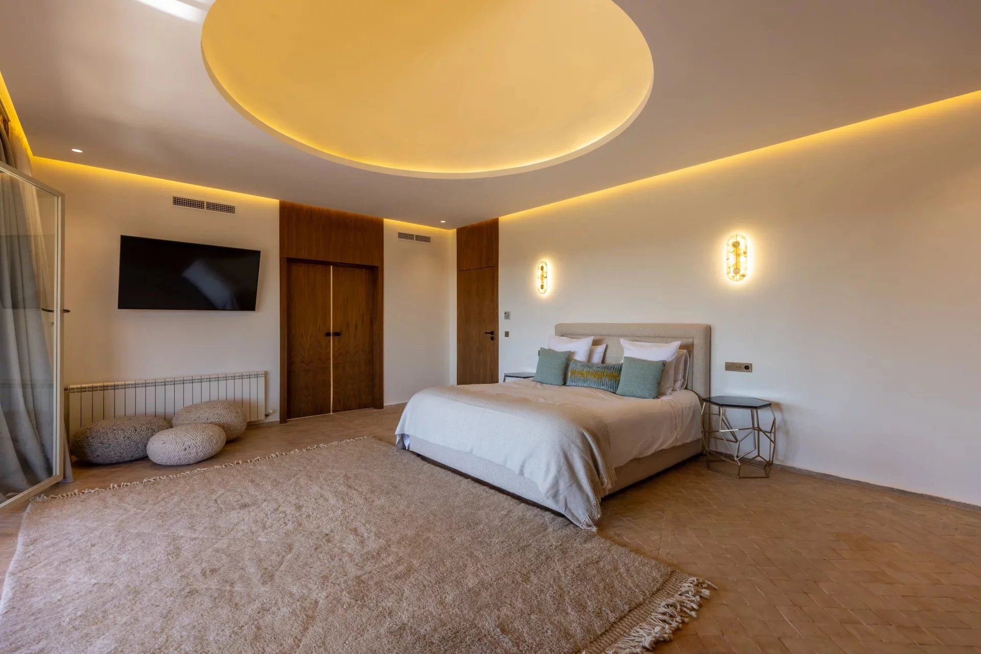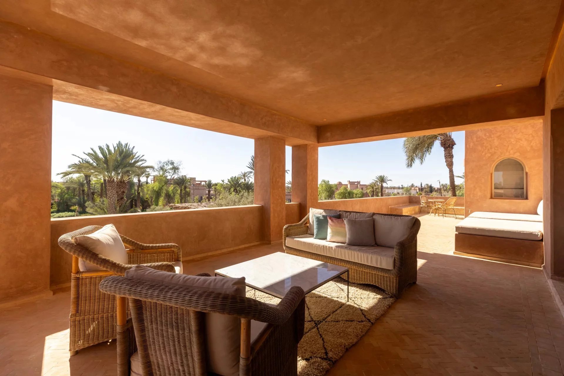 Outside, the property opens onto a large terrace with comfortable lounge areas, surrounded by palm and olive trees, creating a calm and relaxing setting under the Moroccan sun. A heated swimming pool allows guests to enjoy the villa all year round.