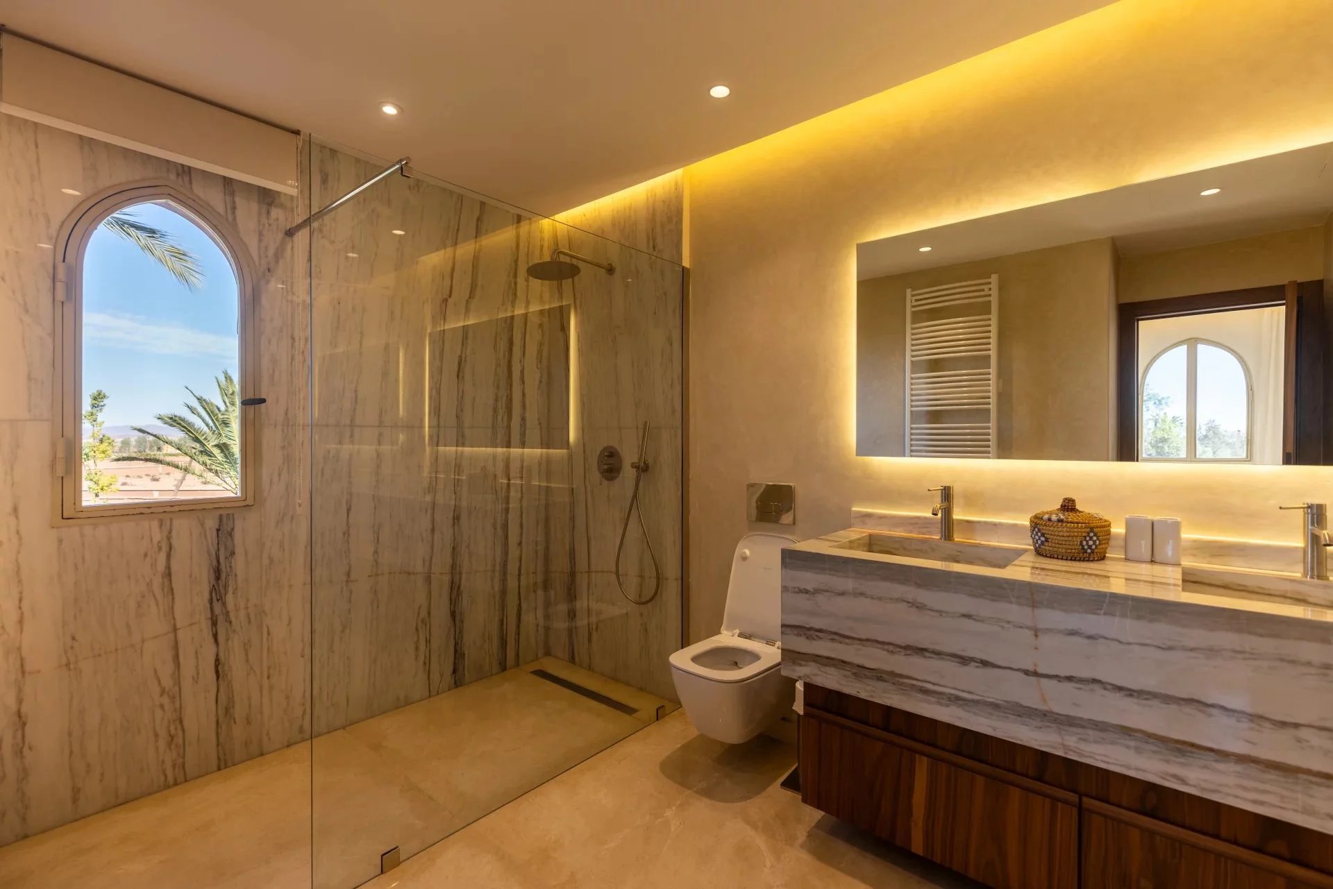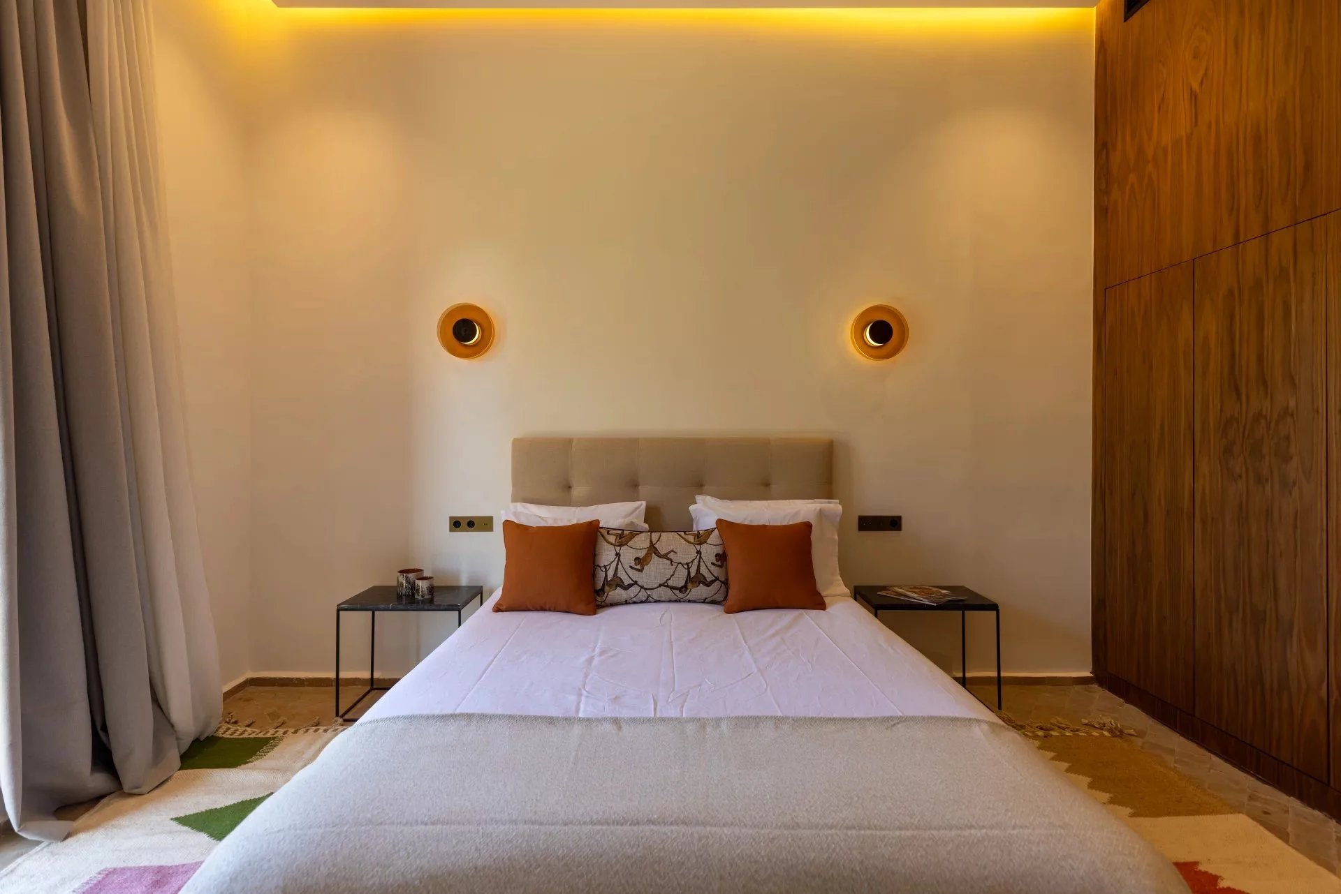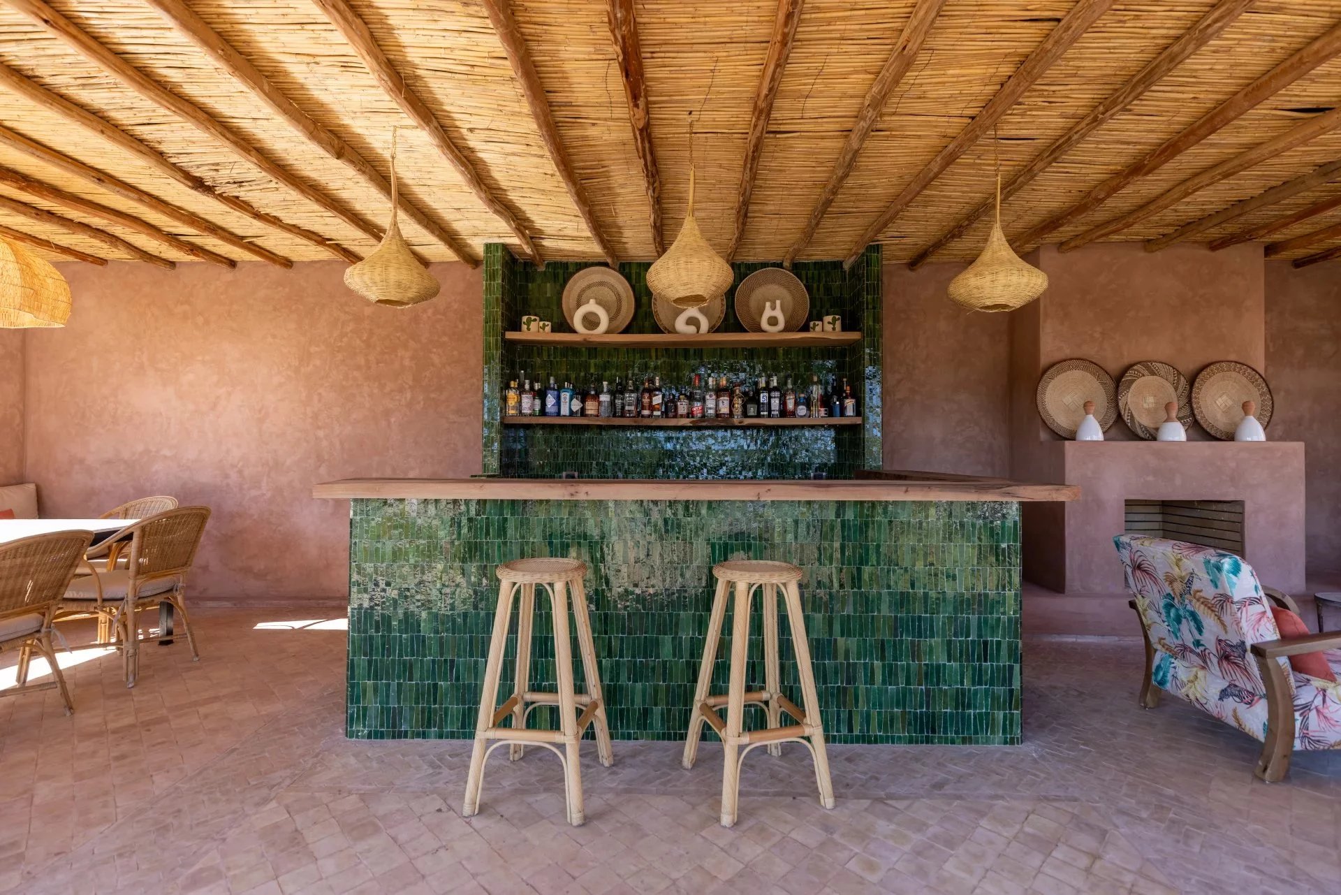 Outside, the property opens onto a large terrace with comfortable lounge areas, surrounded by palm and olive trees, creating a calm and relaxing setting under the Moroccan sun. A heated swimming pool allows guests to enjoy the villa all year round.