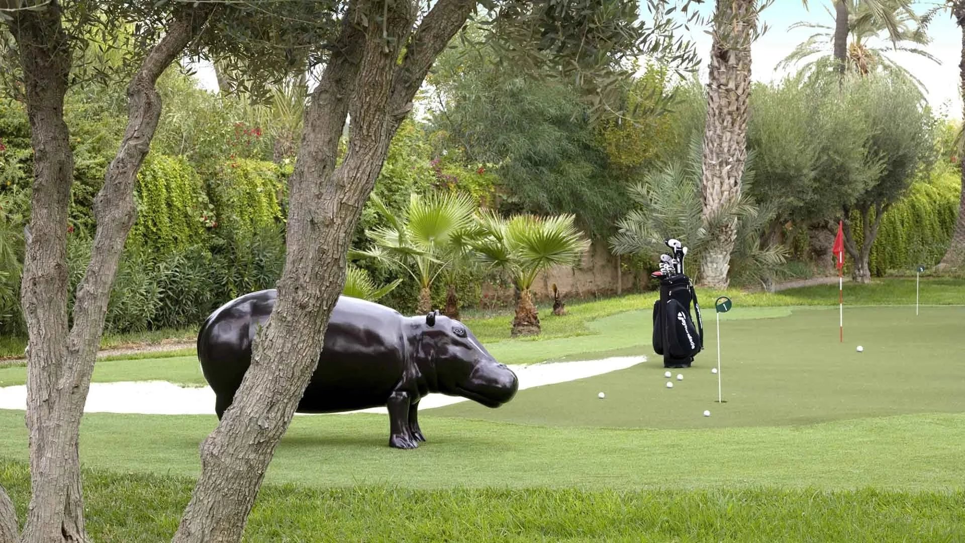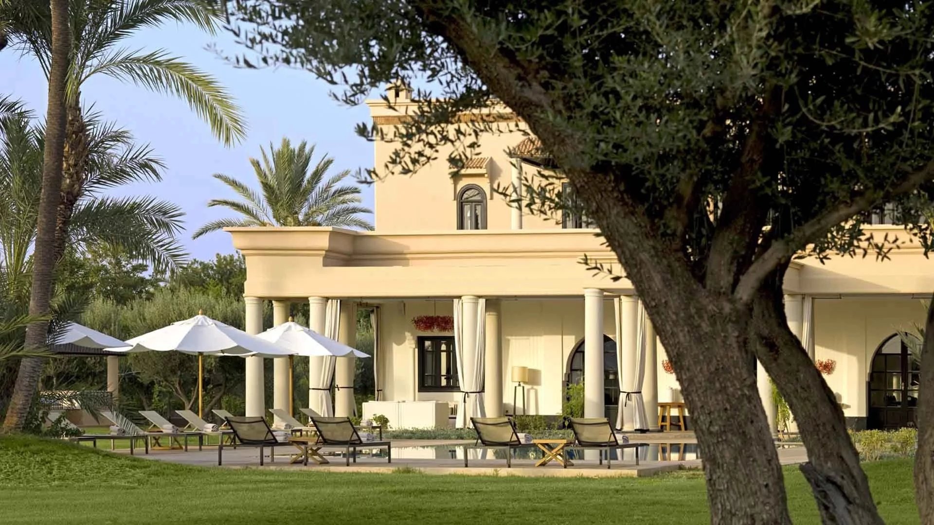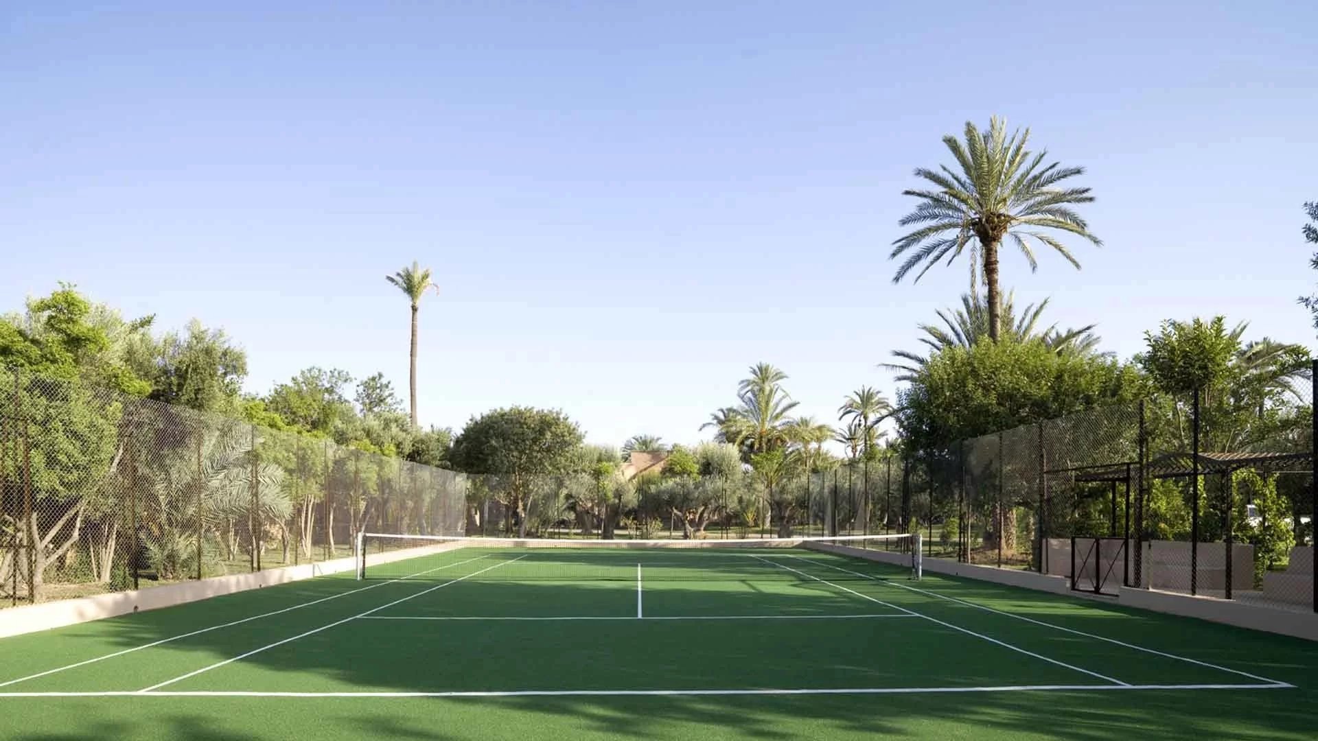 Surrounded by olive trees and a rose garden, the property features premium amenities including a heated swimming pool, tennis court, putting green, and a dedicated wellness pavilion, making it a true peaceful retreat near Marrakech.