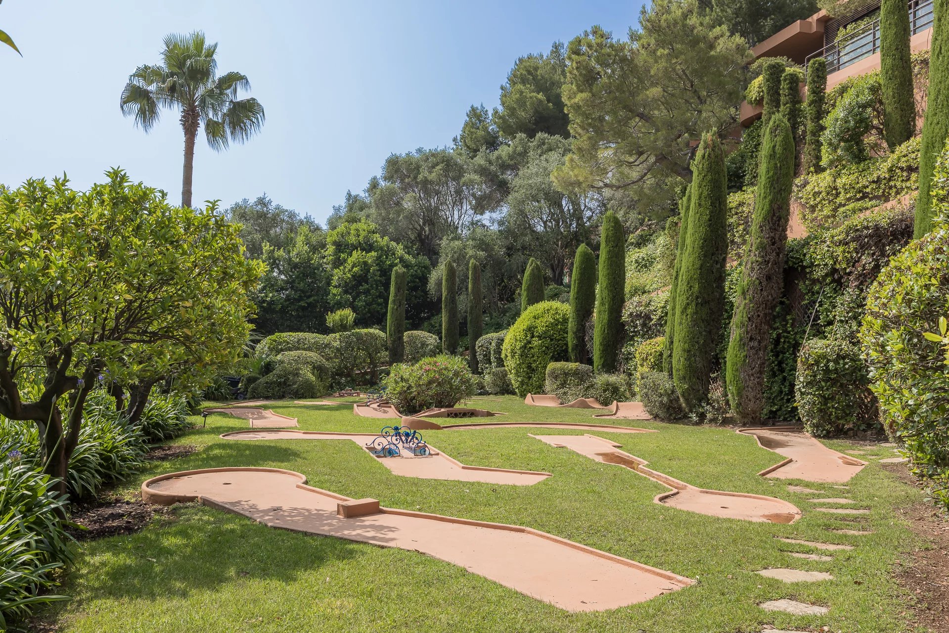 The Belle Époque guest house provides six additional bedrooms over three levels, ideal for extended family or private staff. A landscaped mini-golf completes the estate.