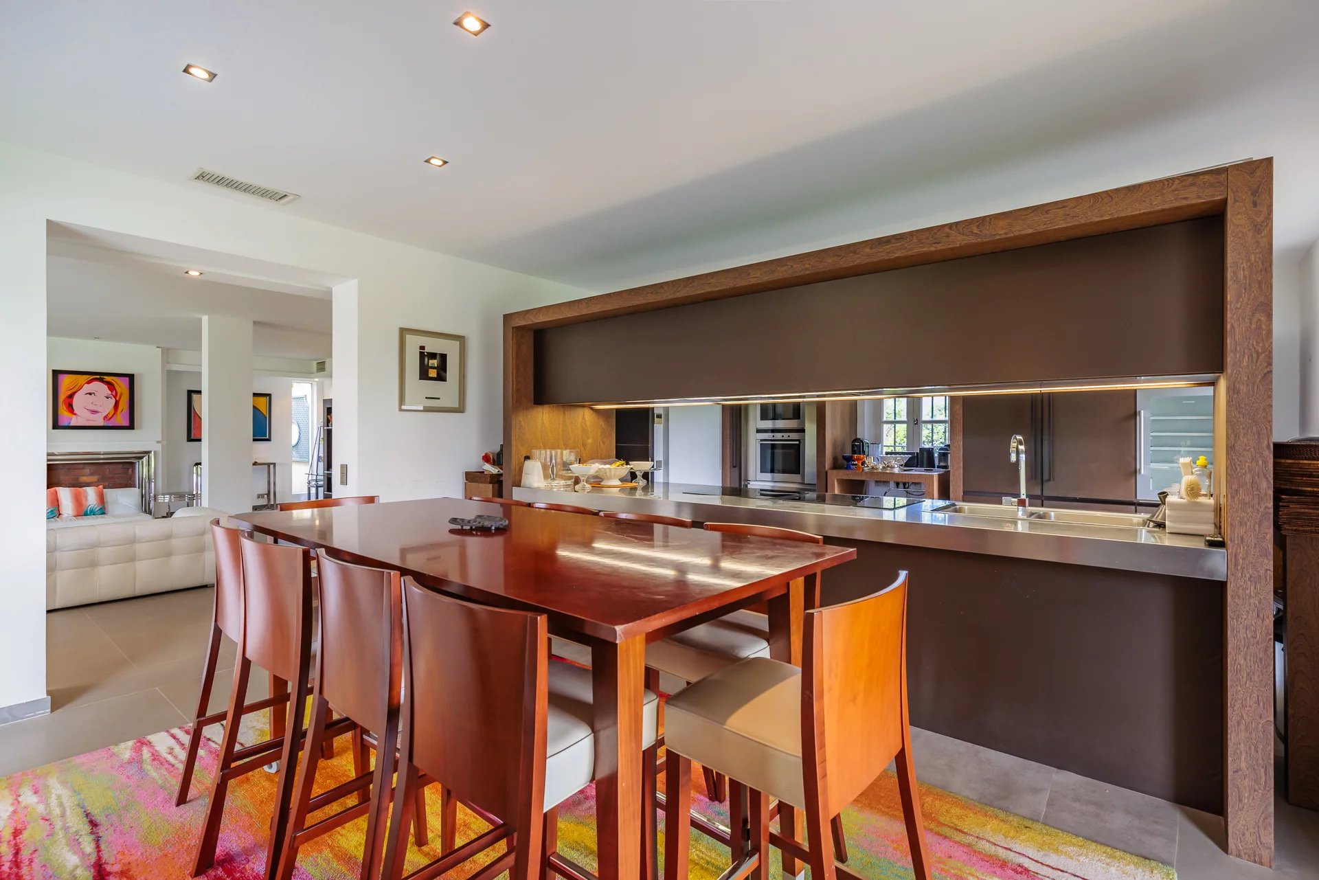 The ground floor comprises a bright living room, dining room and fully-equipped kitchen, plus 2 en suite bedrooms. Upstairs are 4 en suite bedrooms, including a master bedroom with a terrace overlooking the sea.
