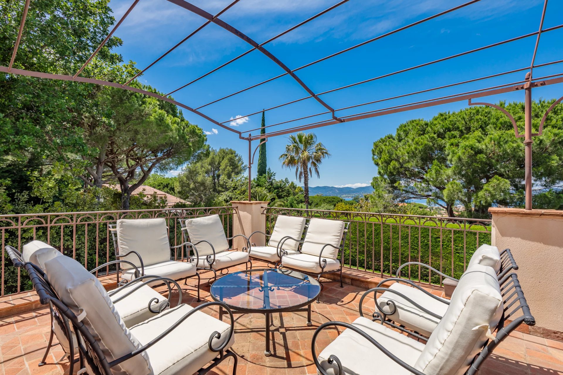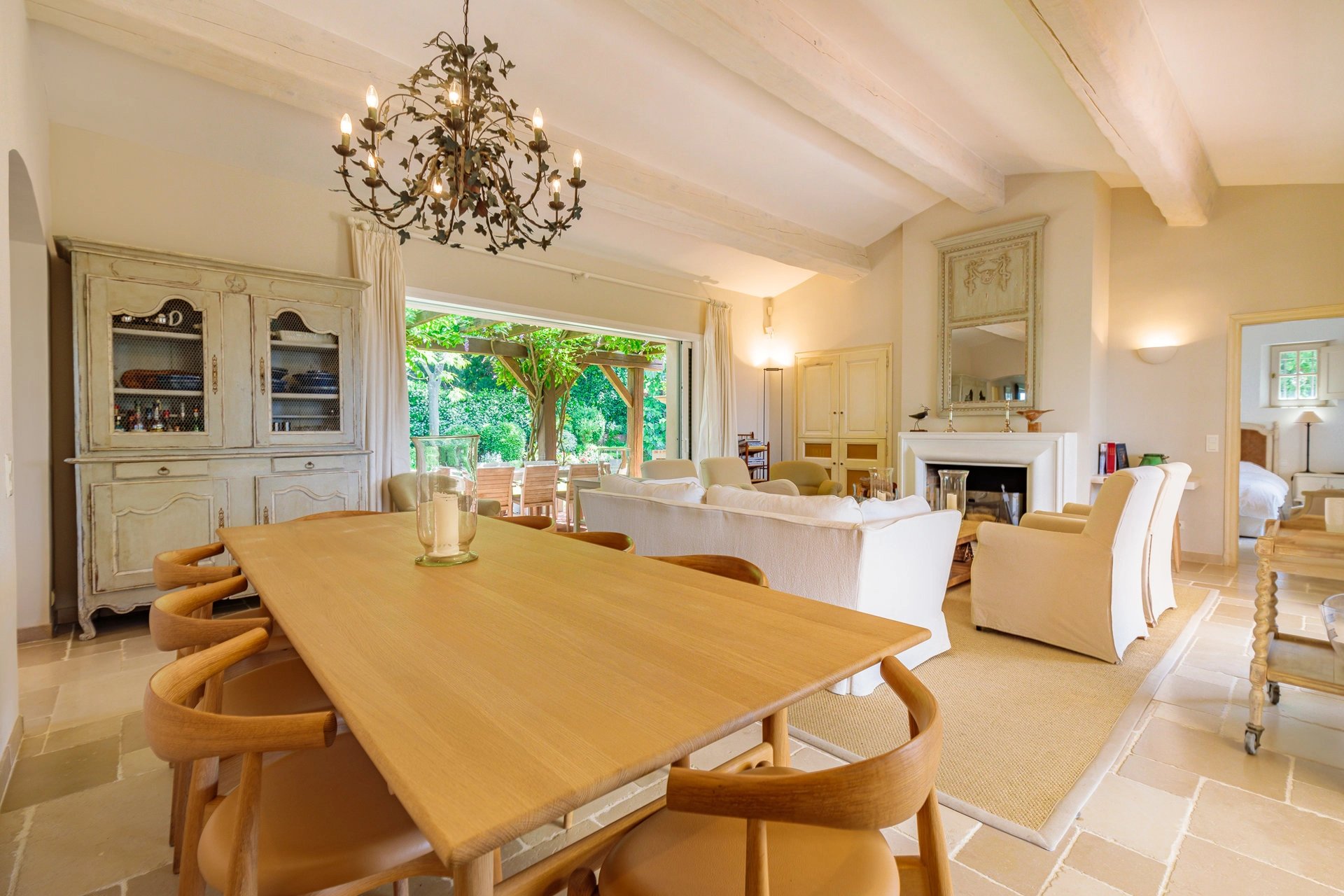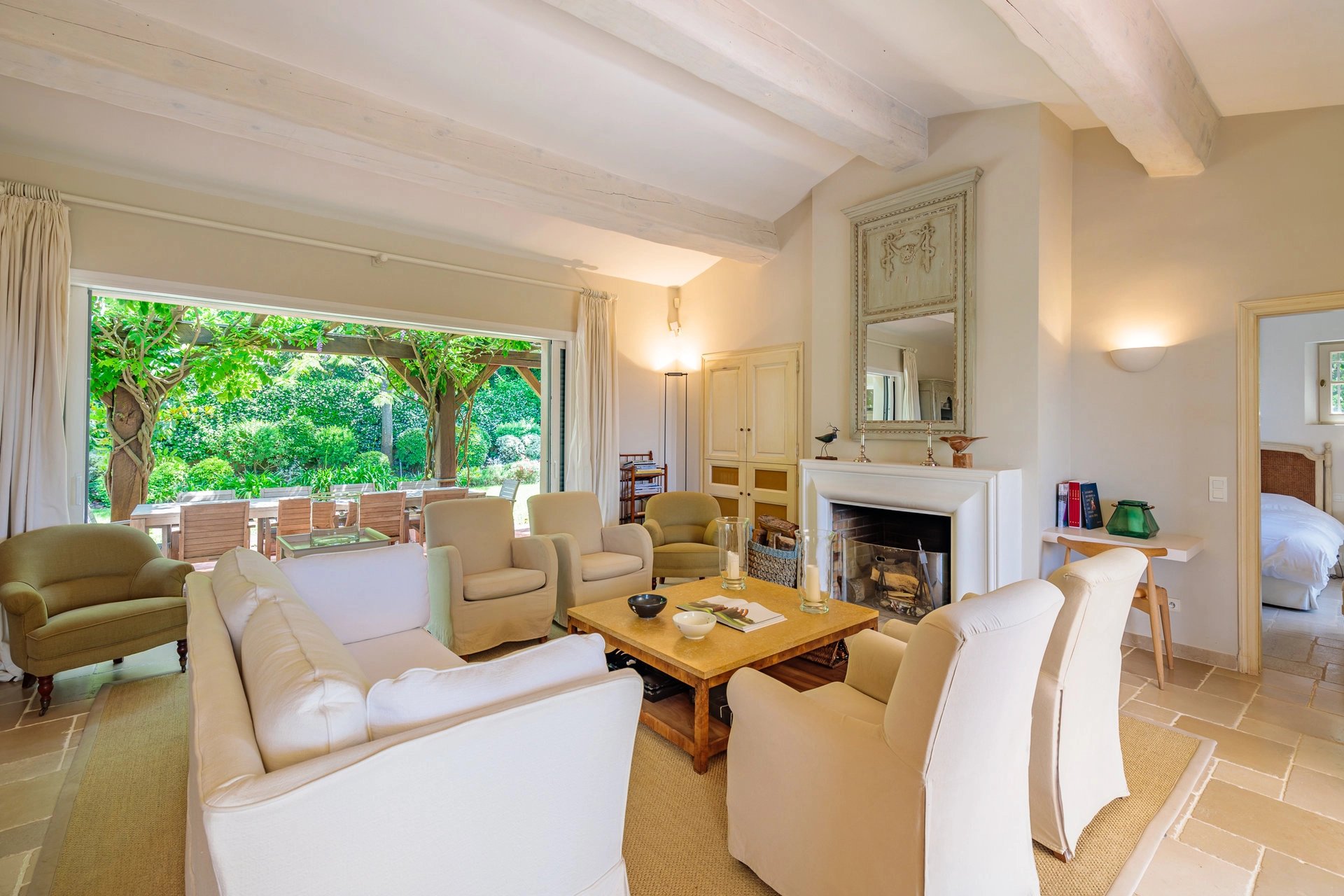 The living room opens onto a large pool side terrace facing the sea and a second shaded garden side.