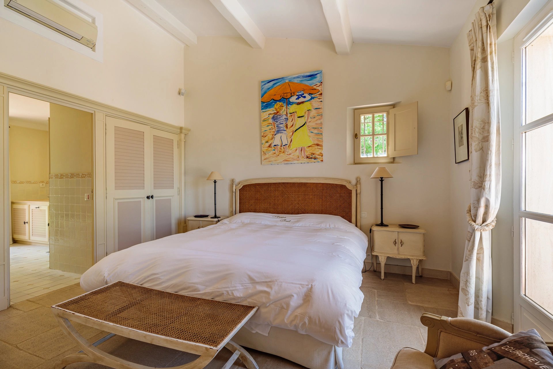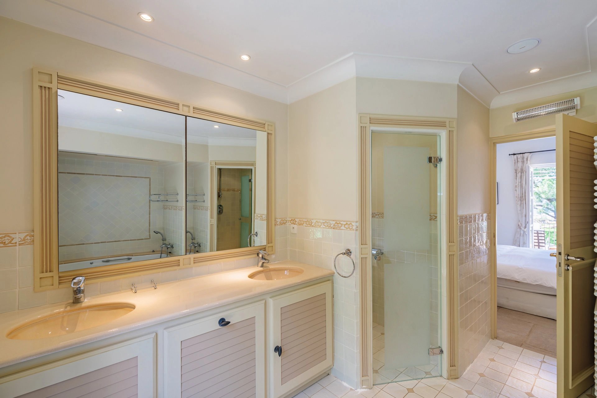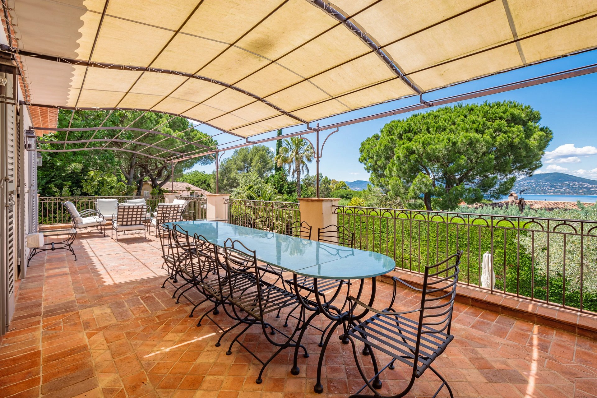 The living room opens onto a large pool side terrace facing the sea and a second shaded garden side.
