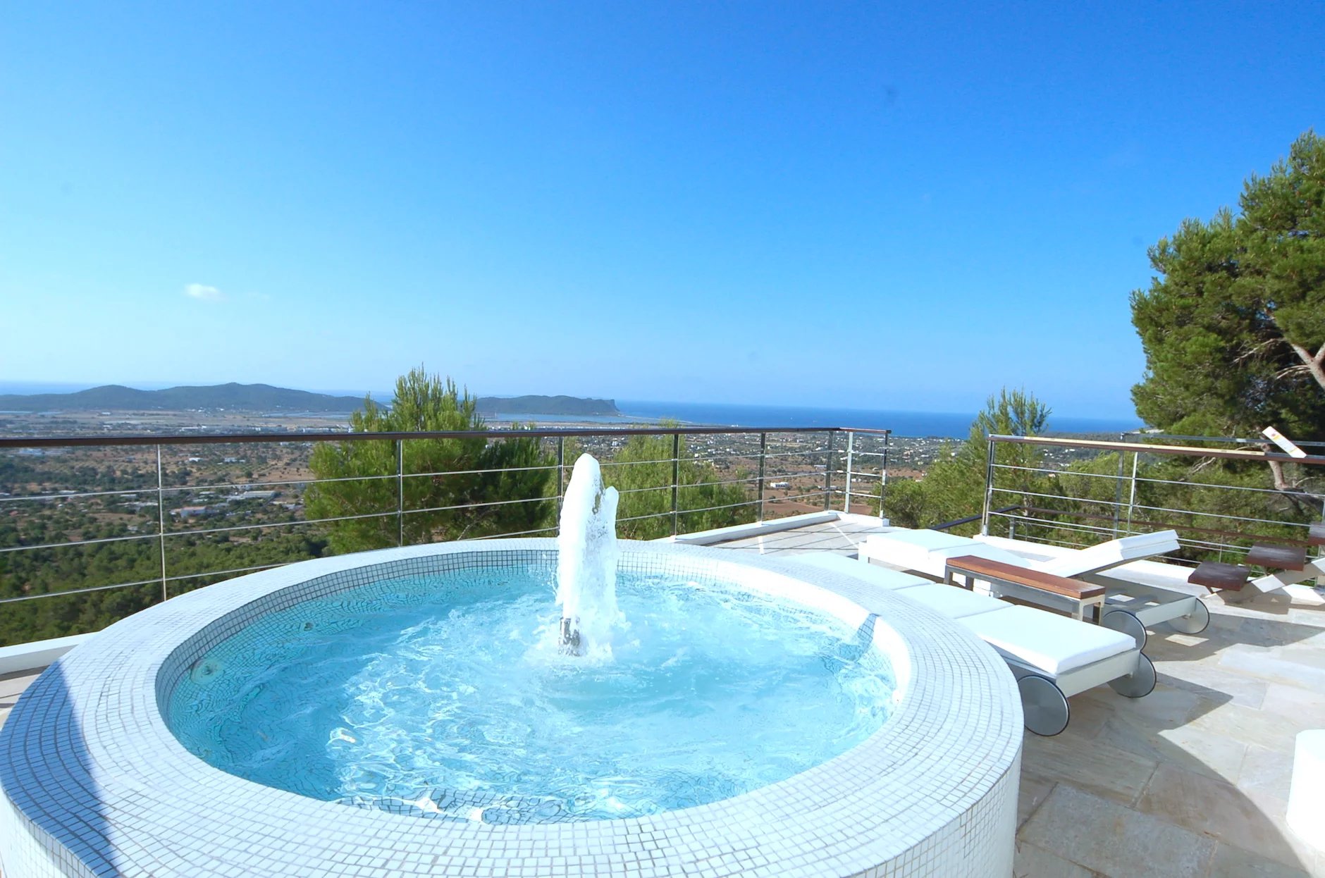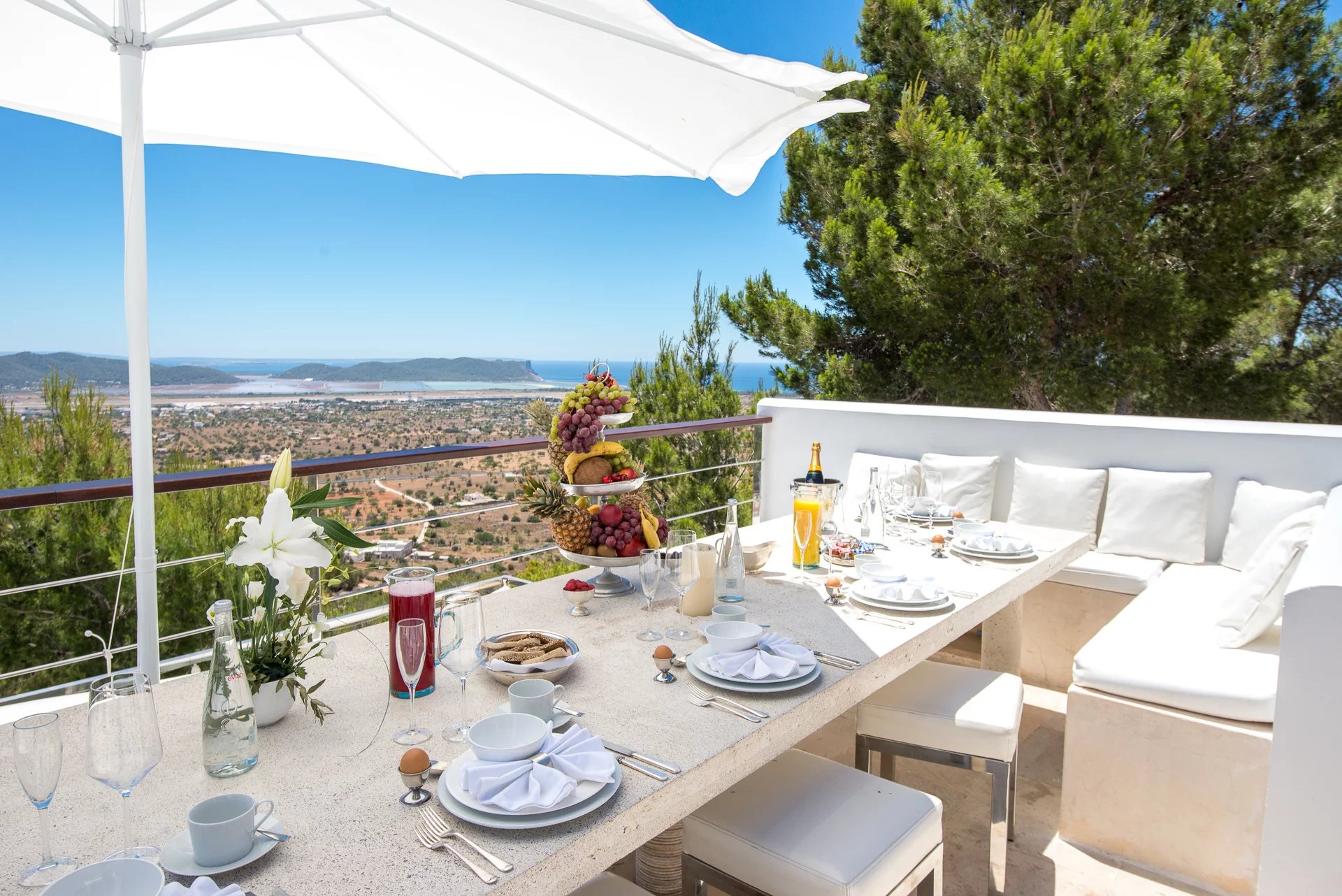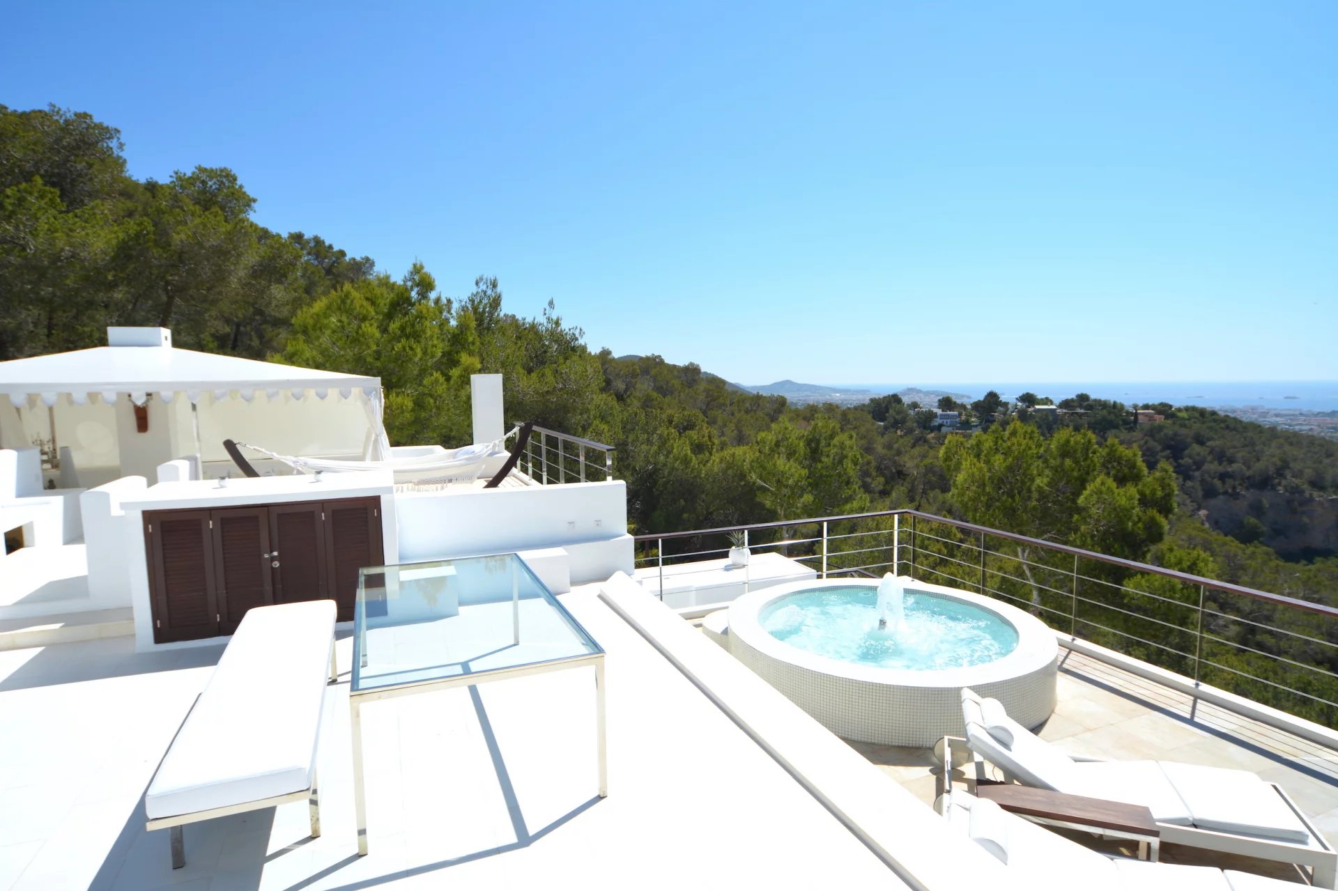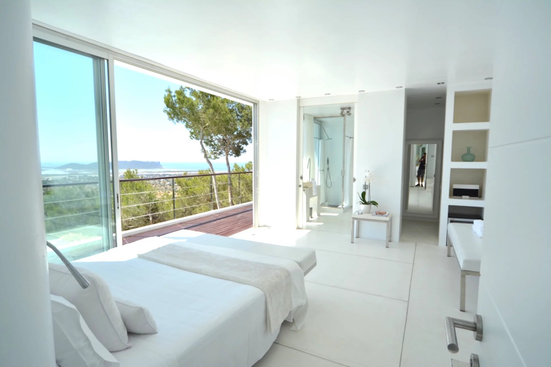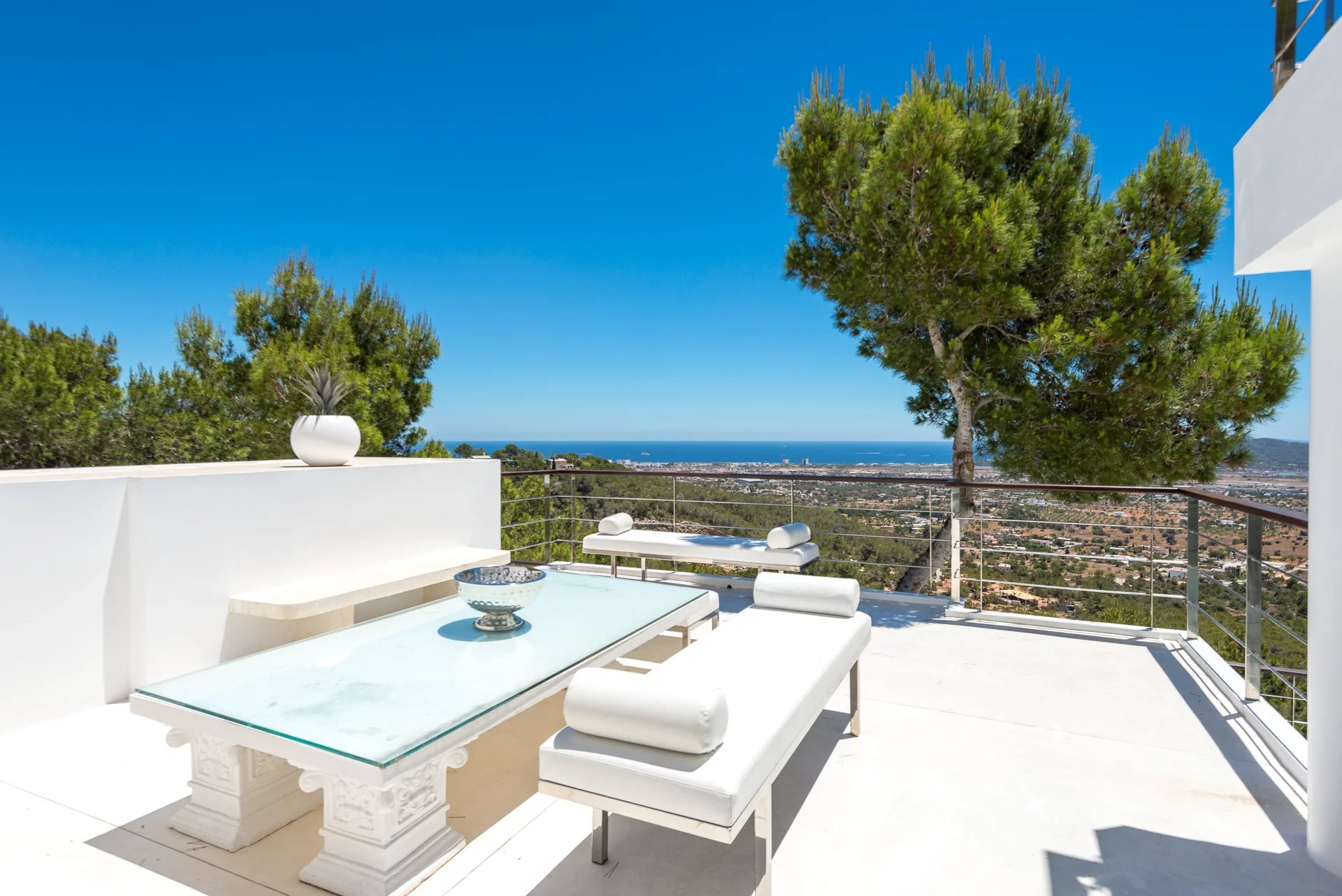 This fantastic ultra-modern style villa is located just 6km from Ibiza town and has spectacular 180º panoramic views (from the old town of Ibiza to the beaches of Salinas, Es Codolar and the island of Formentera).
