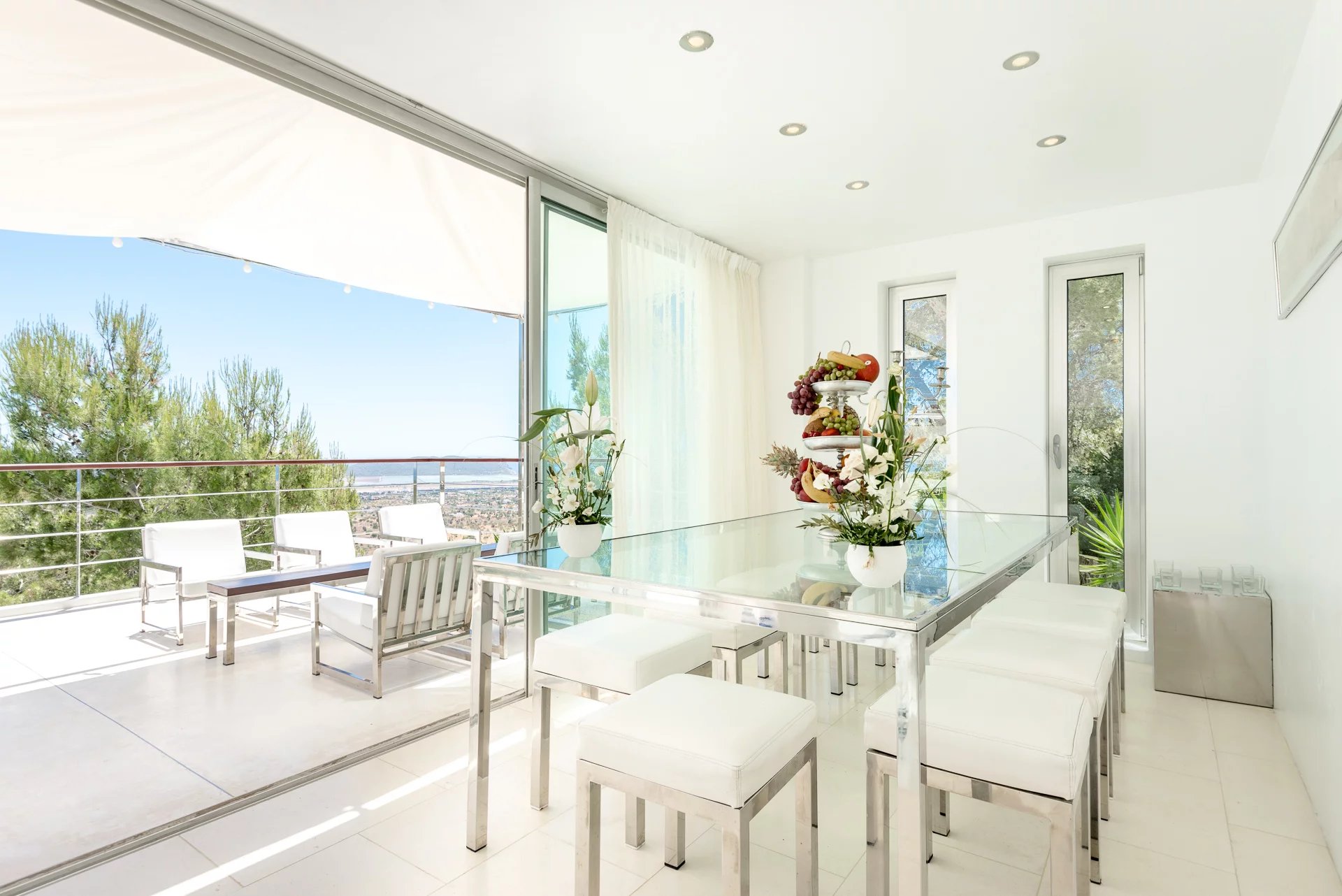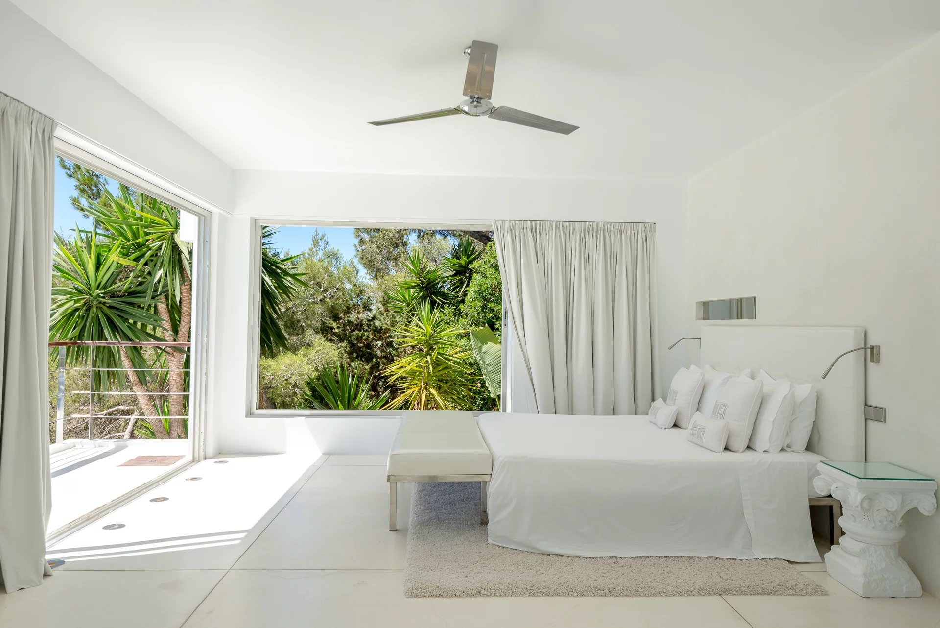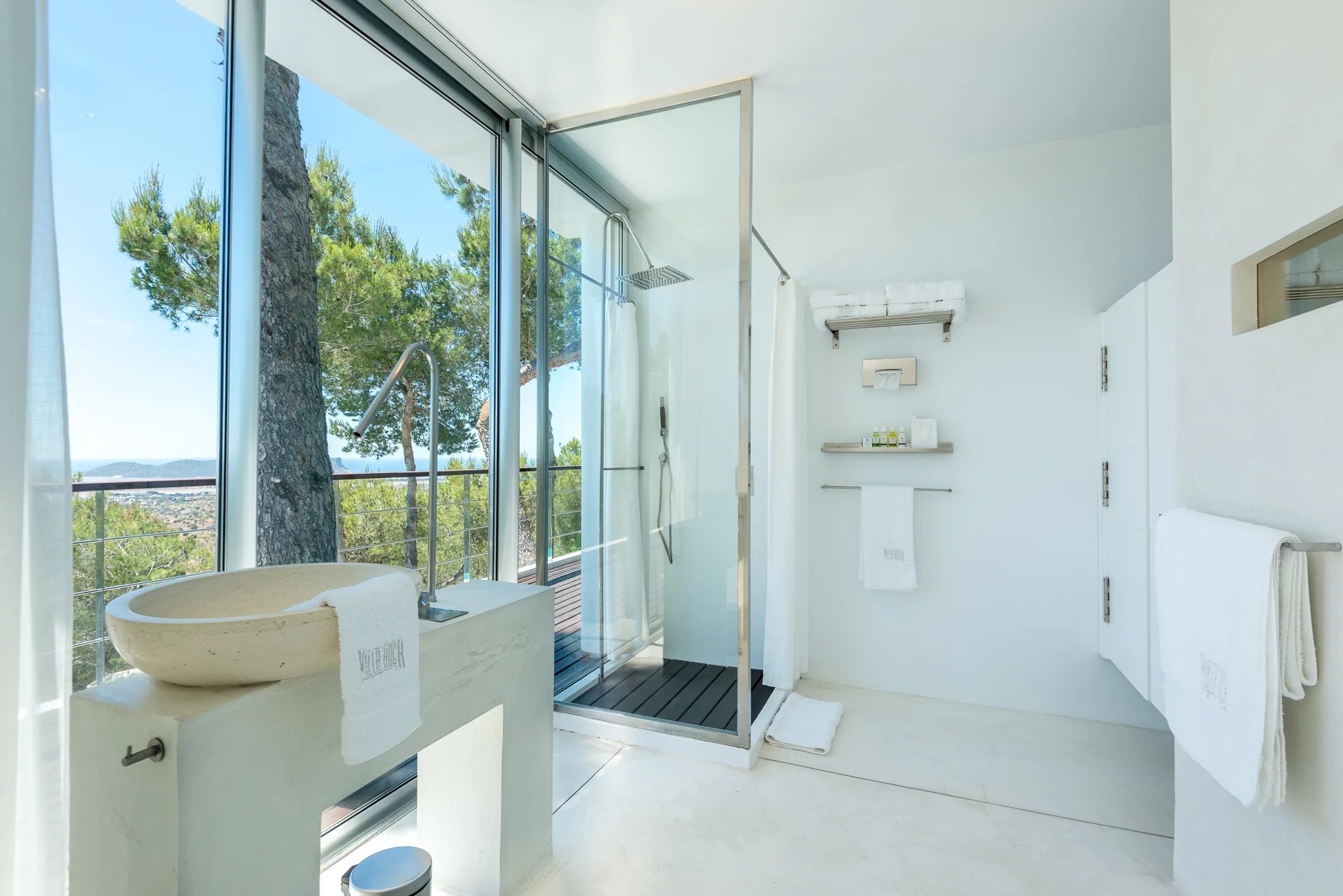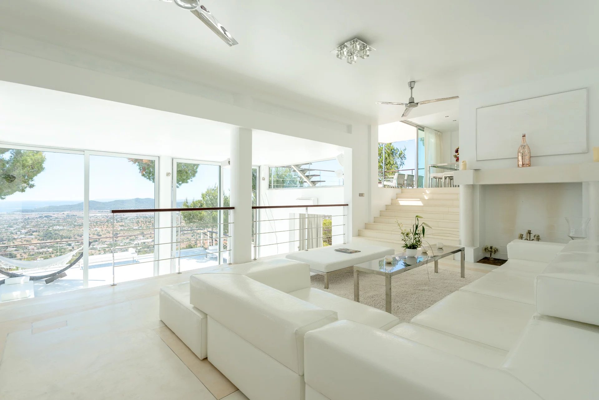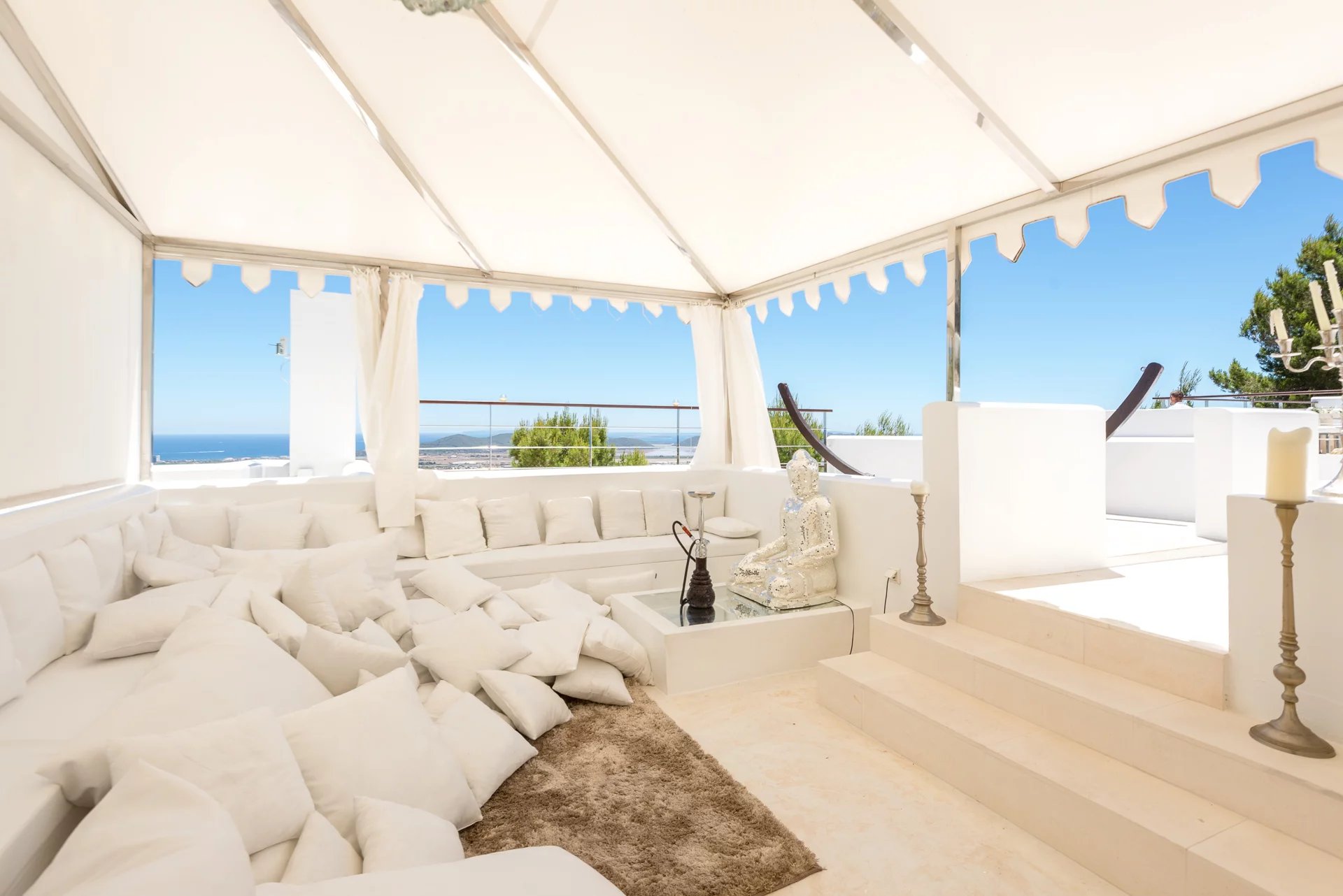 This fantastic ultra-modern style villa is located just 6km from Ibiza town and has spectacular 180º panoramic views (from the old town of Ibiza to the beaches of Salinas, Es Codolar and the island of Formentera).