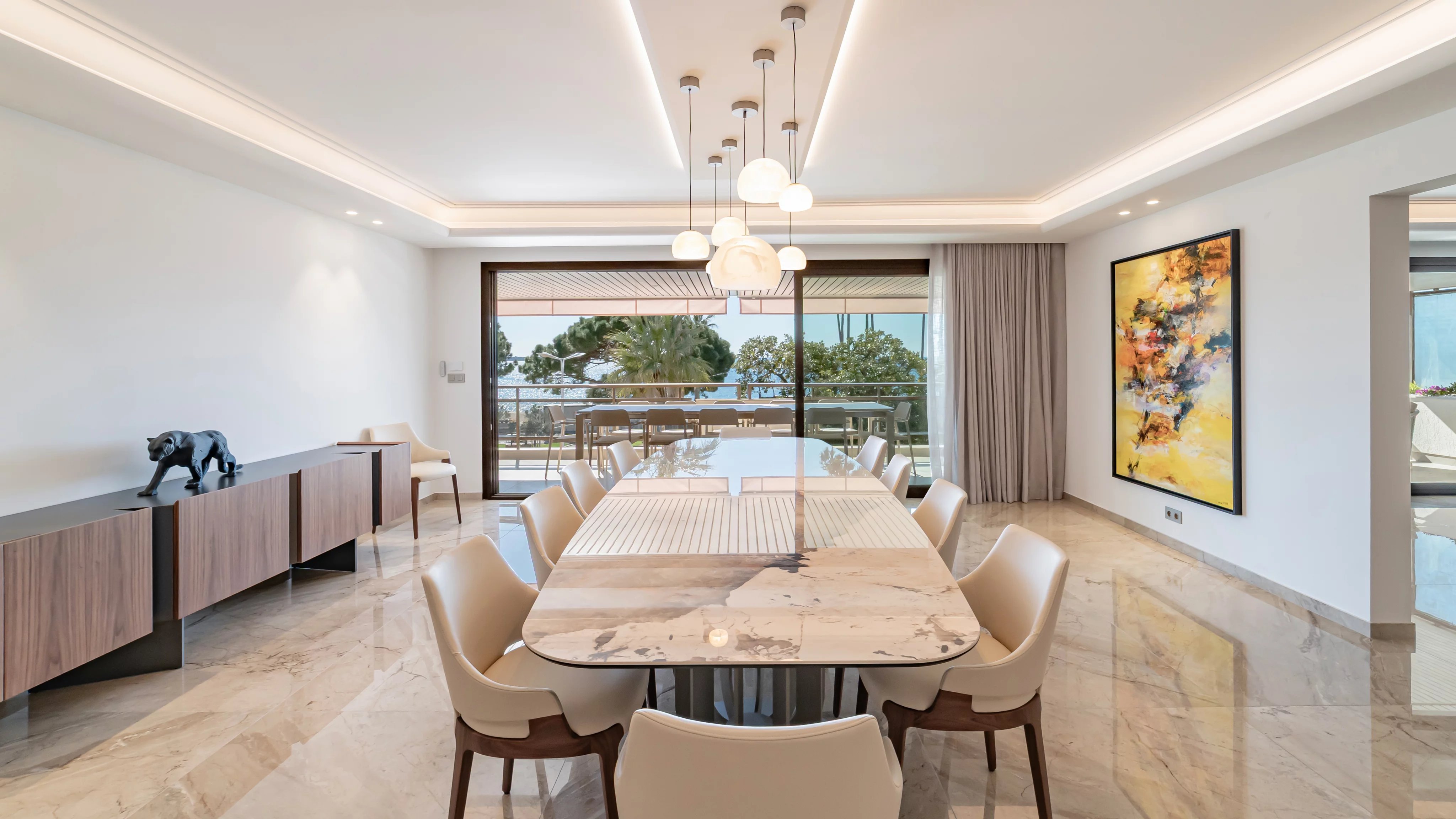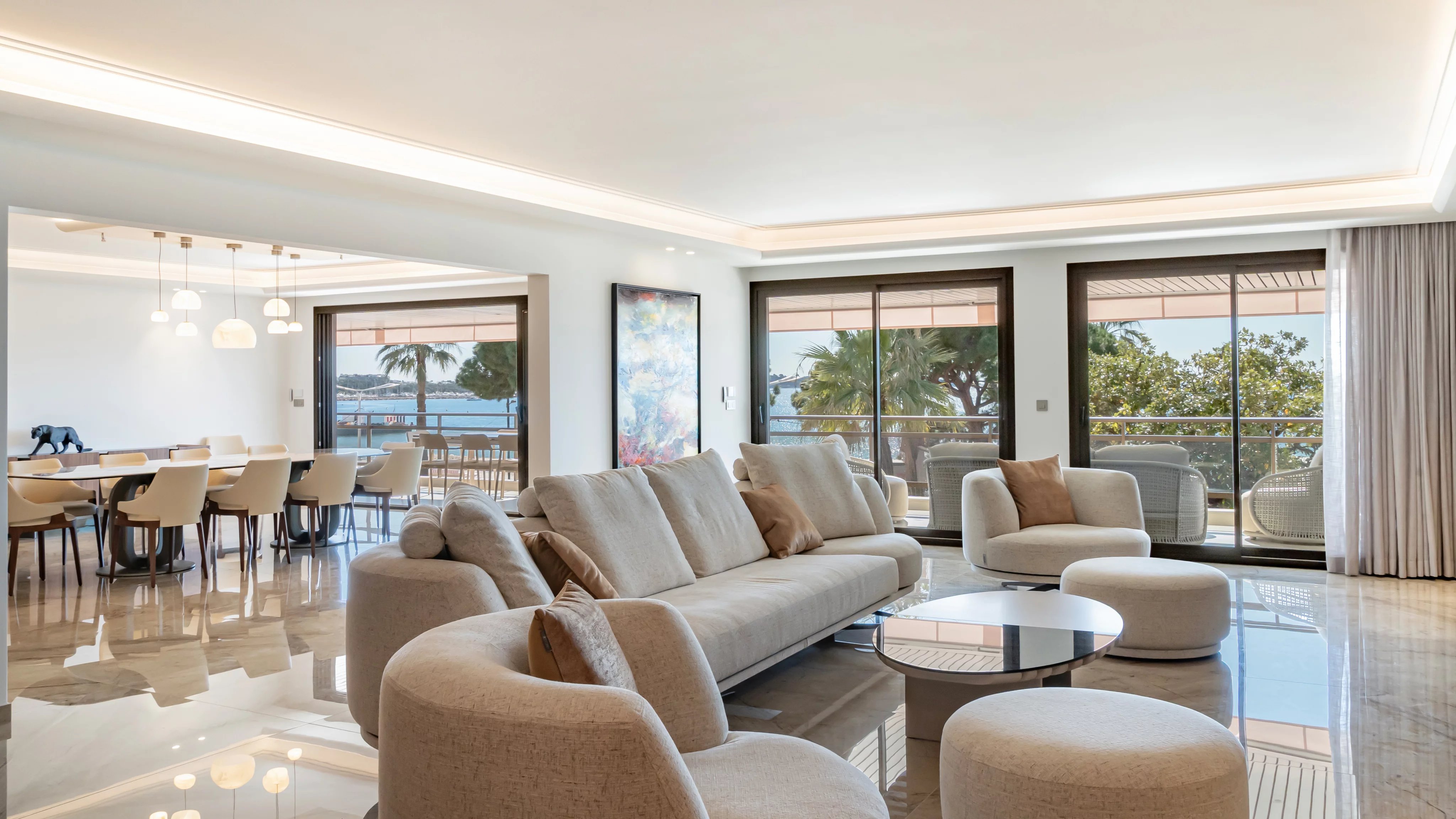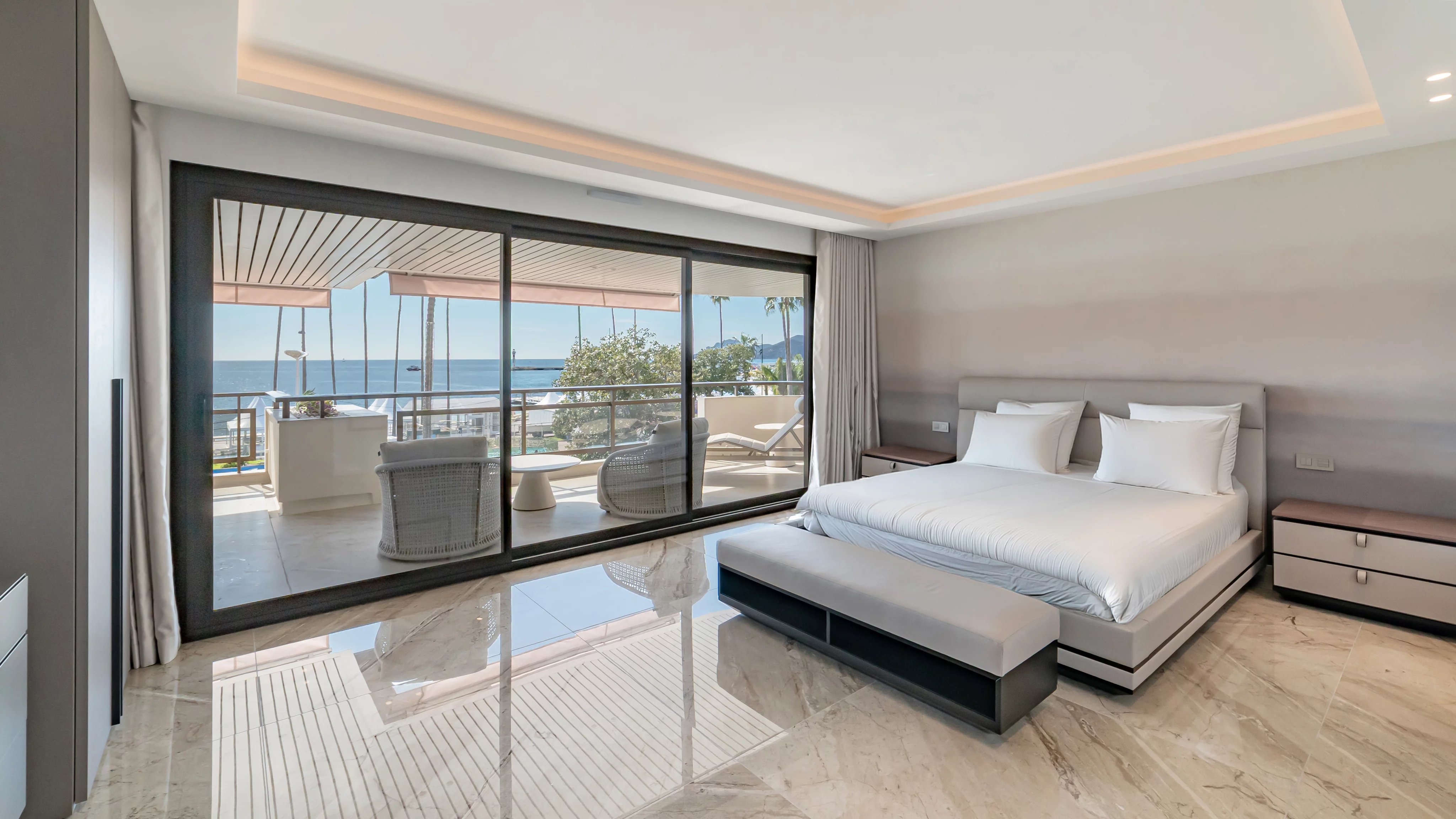 La terrasse, véritable signature du bien, s’impose comme un espace de vie à part entière, offrant une vue spectaculaire et dégagée sur la mer, la Croisette et la baie de Cannes, un cadre idéal pour recevoir ou profiter pleinement des plus beaux événements de Cannes.