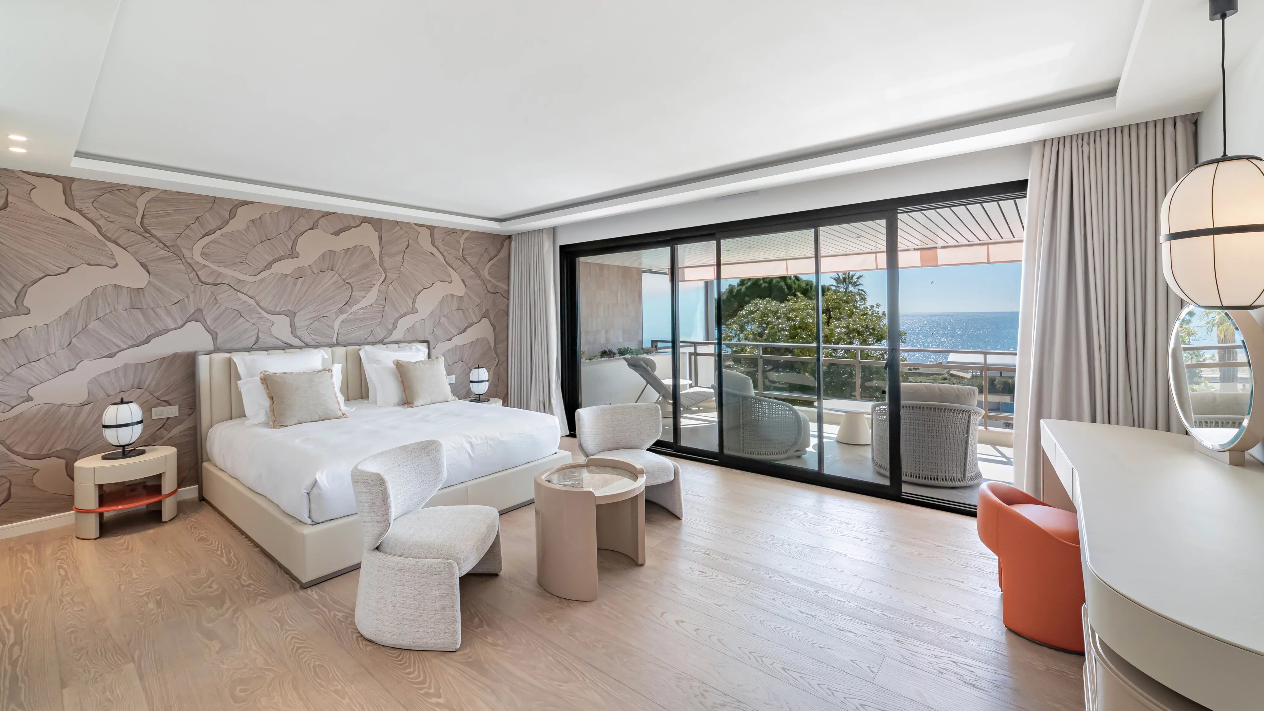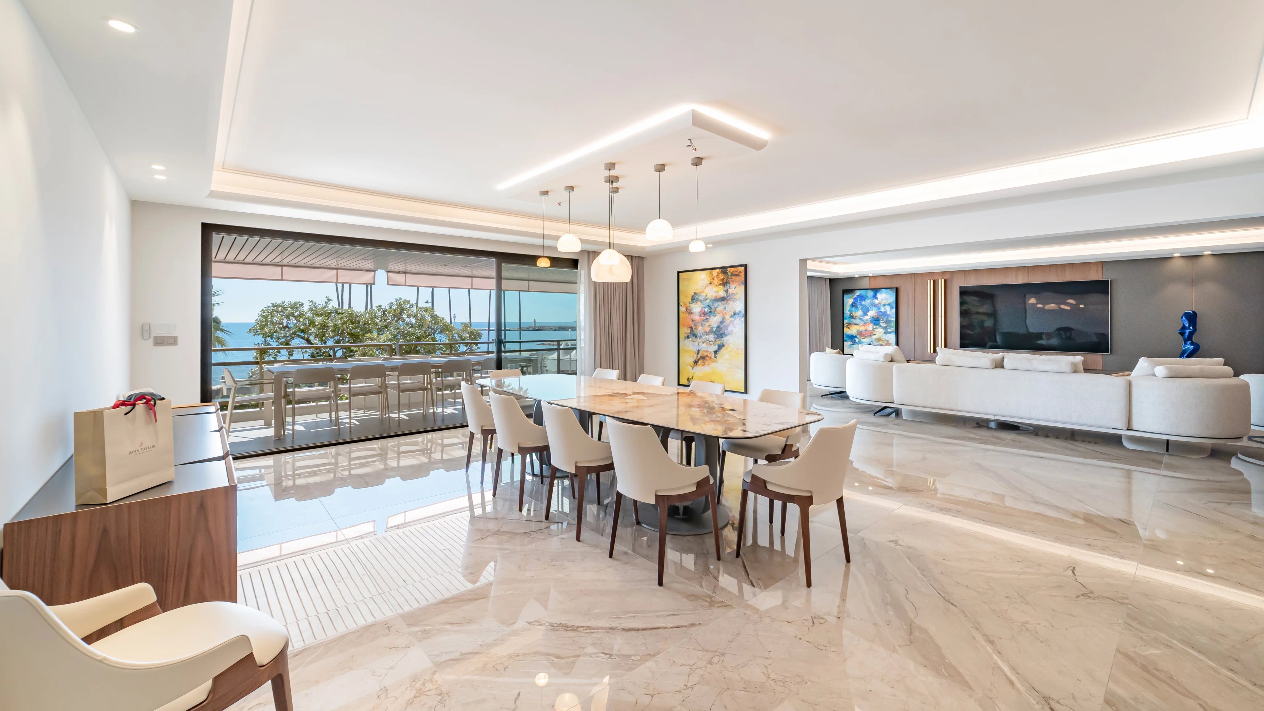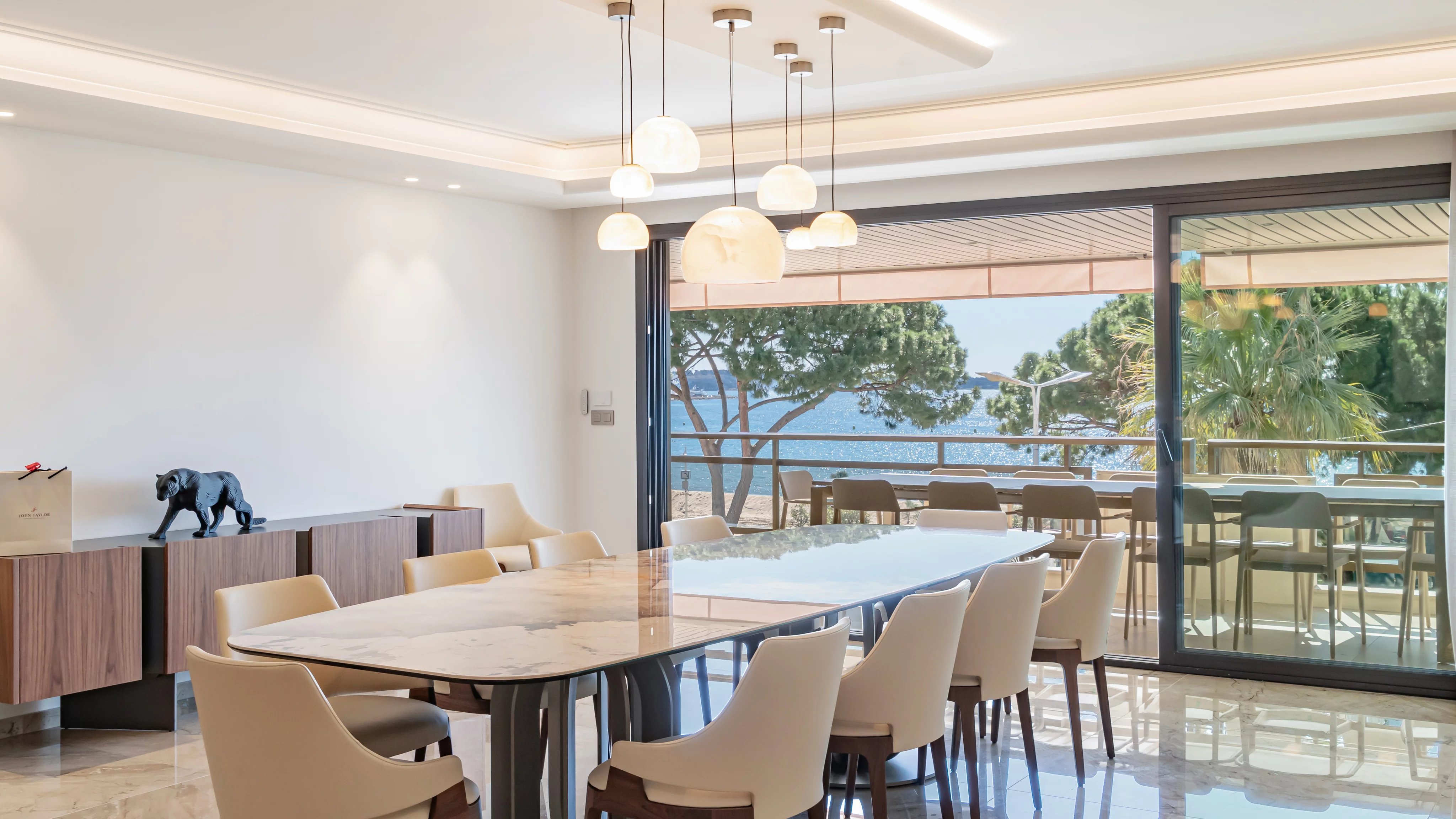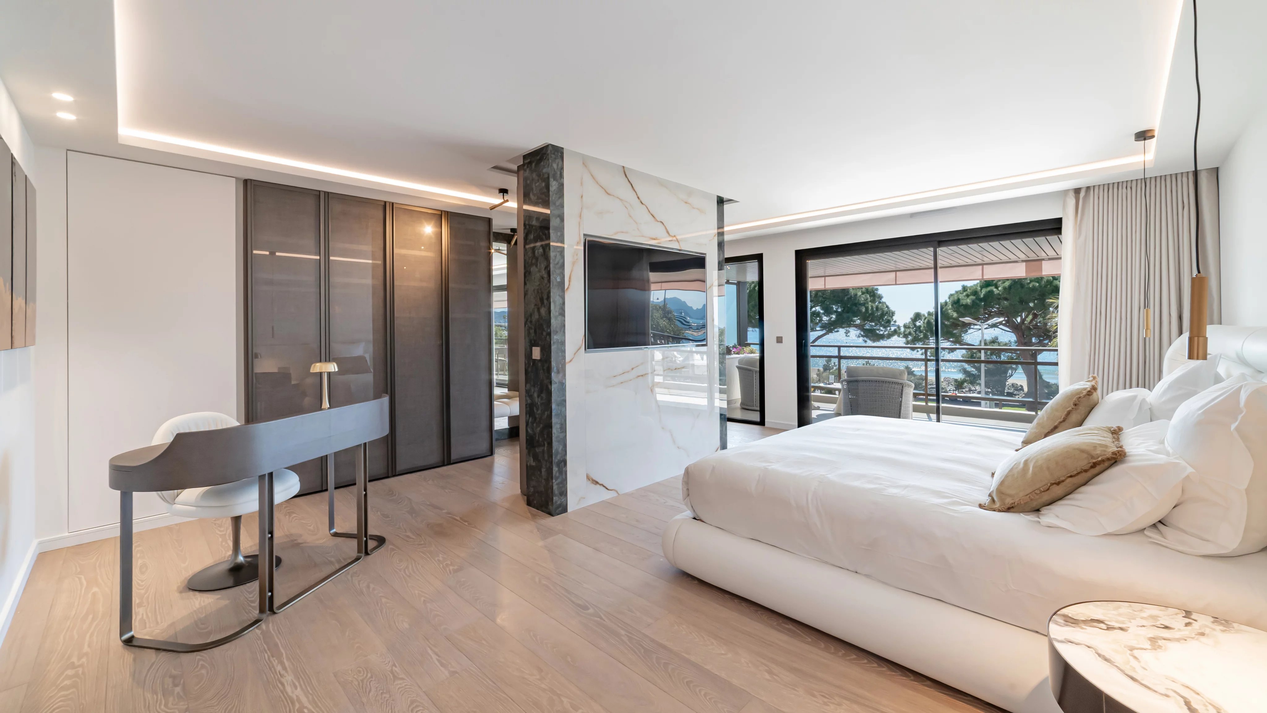 La terrasse, véritable signature du bien, s’impose comme un espace de vie à part entière, offrant une vue spectaculaire et dégagée sur la mer, la Croisette et la baie de Cannes, un cadre idéal pour recevoir ou profiter pleinement des plus beaux événements de Cannes.