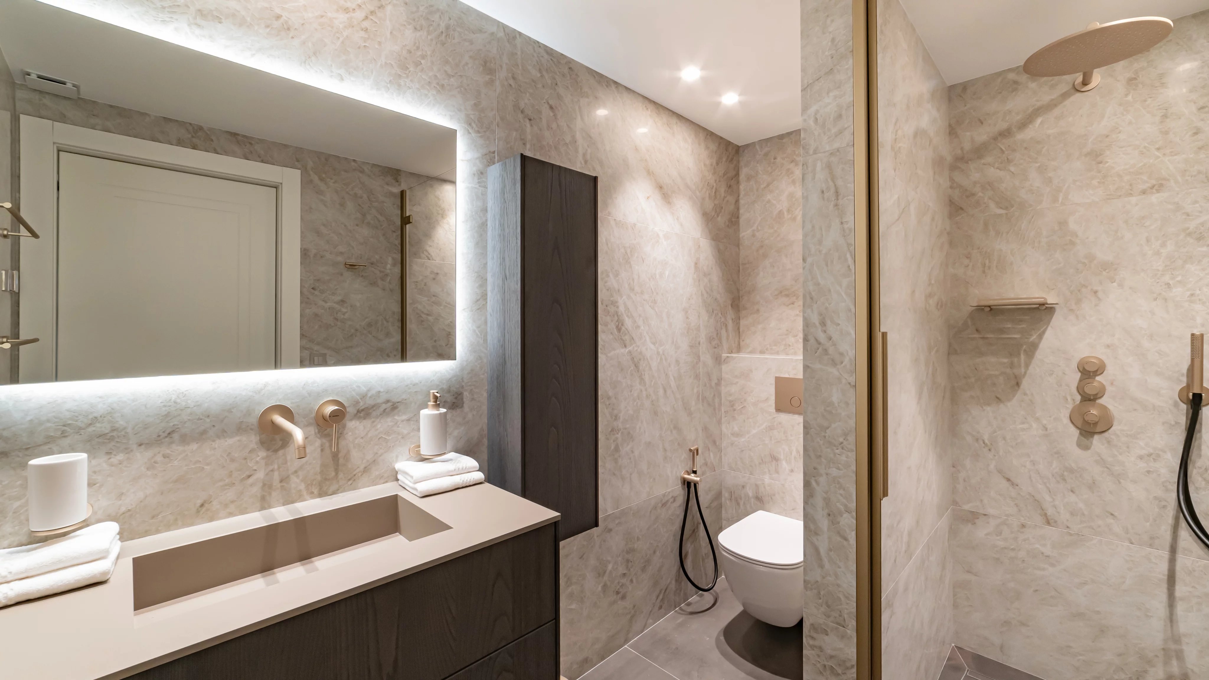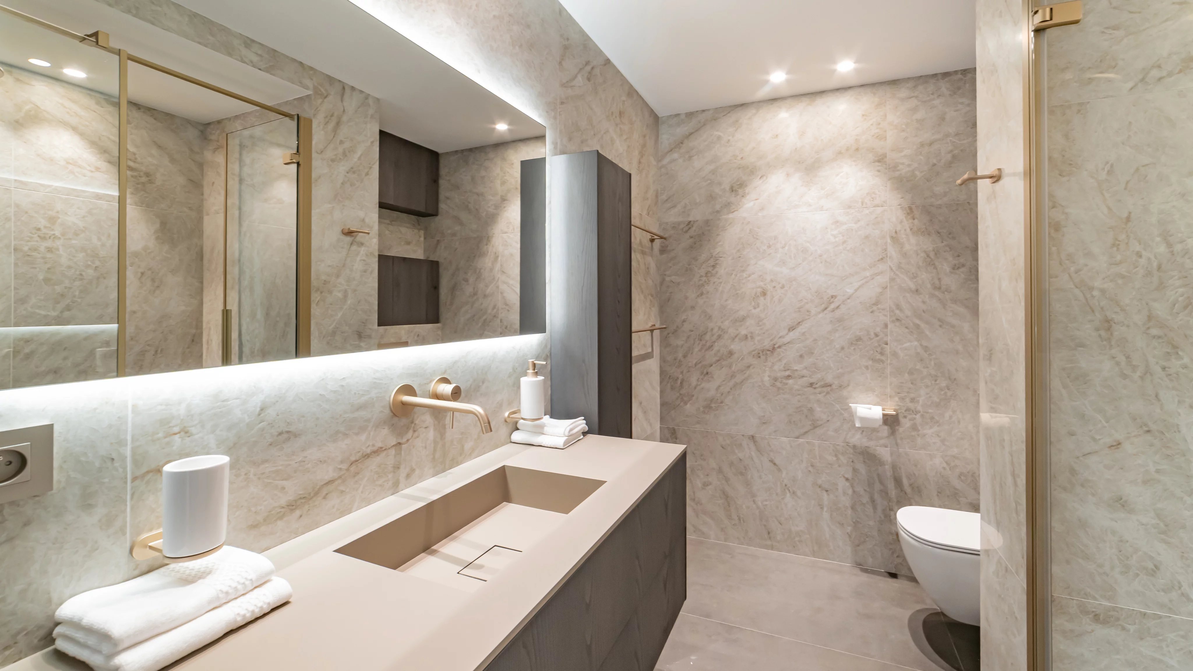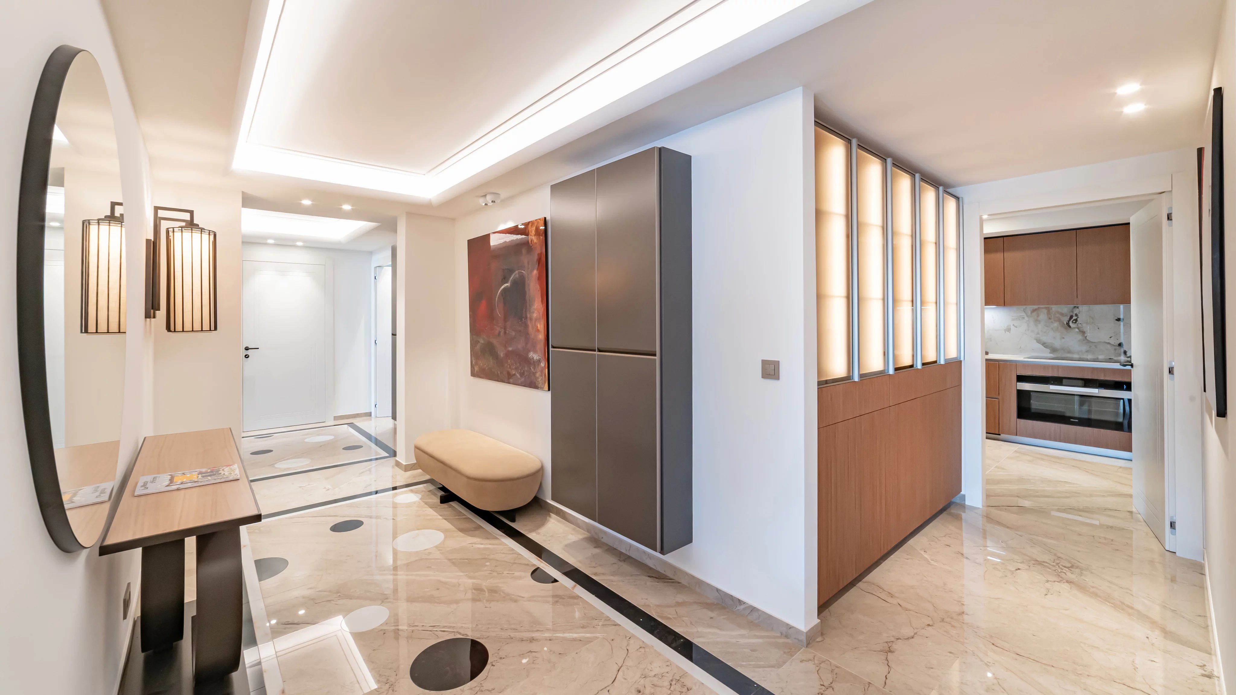 Une entrée élégante avec vestiaire et toilettes invités.