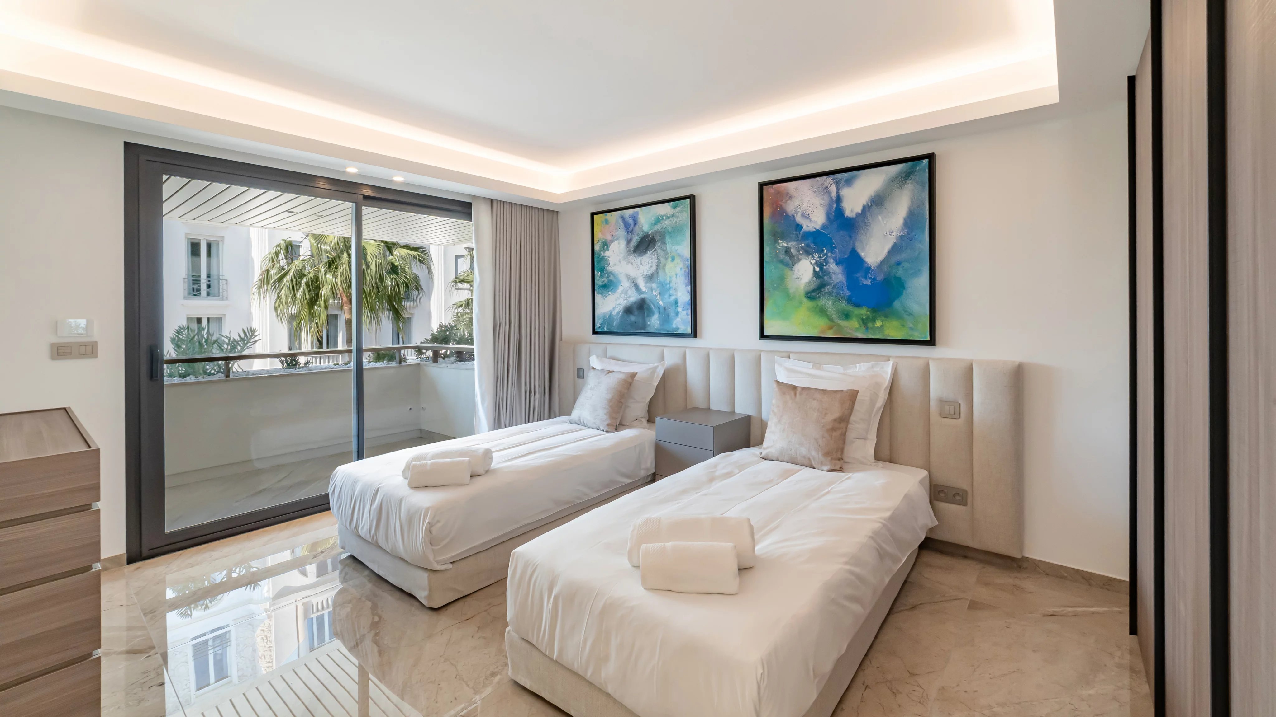 Deux suites principales avec salles de douches en suite avec toilettes, bénéficiant d’un accès direct à la terrasse côté mer.