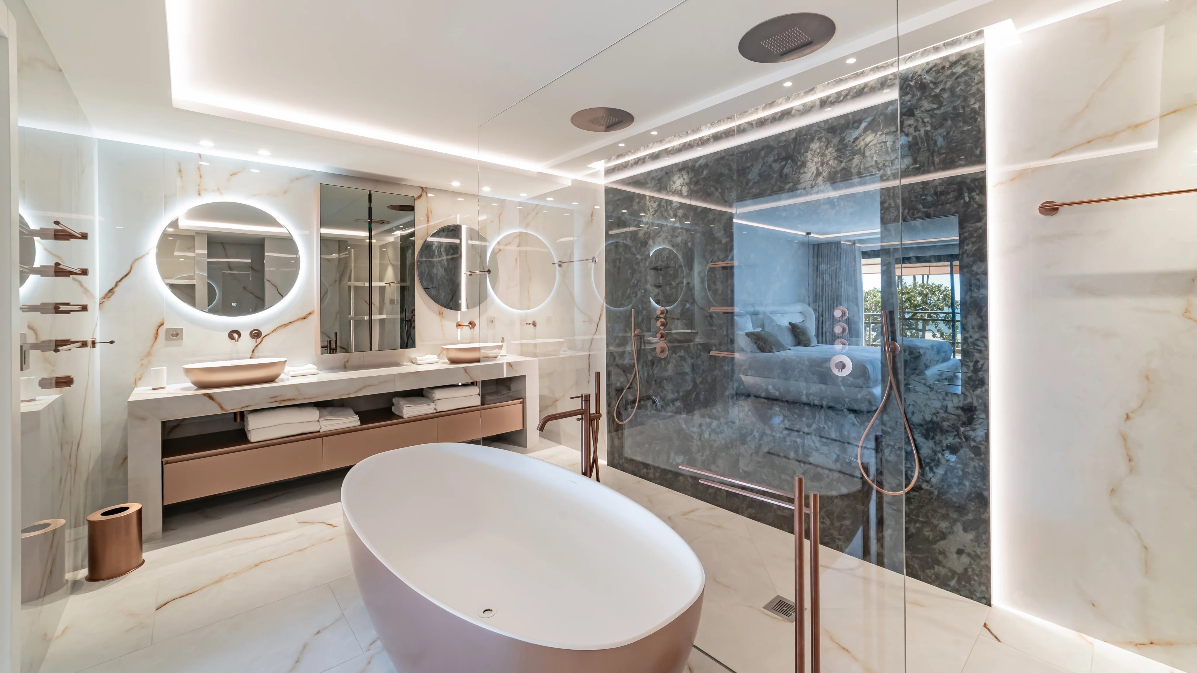 Une chambre de maitre avec salle de bains en suite avec baignoire et douche et toilette ouvert sur la terrasse vue mer.