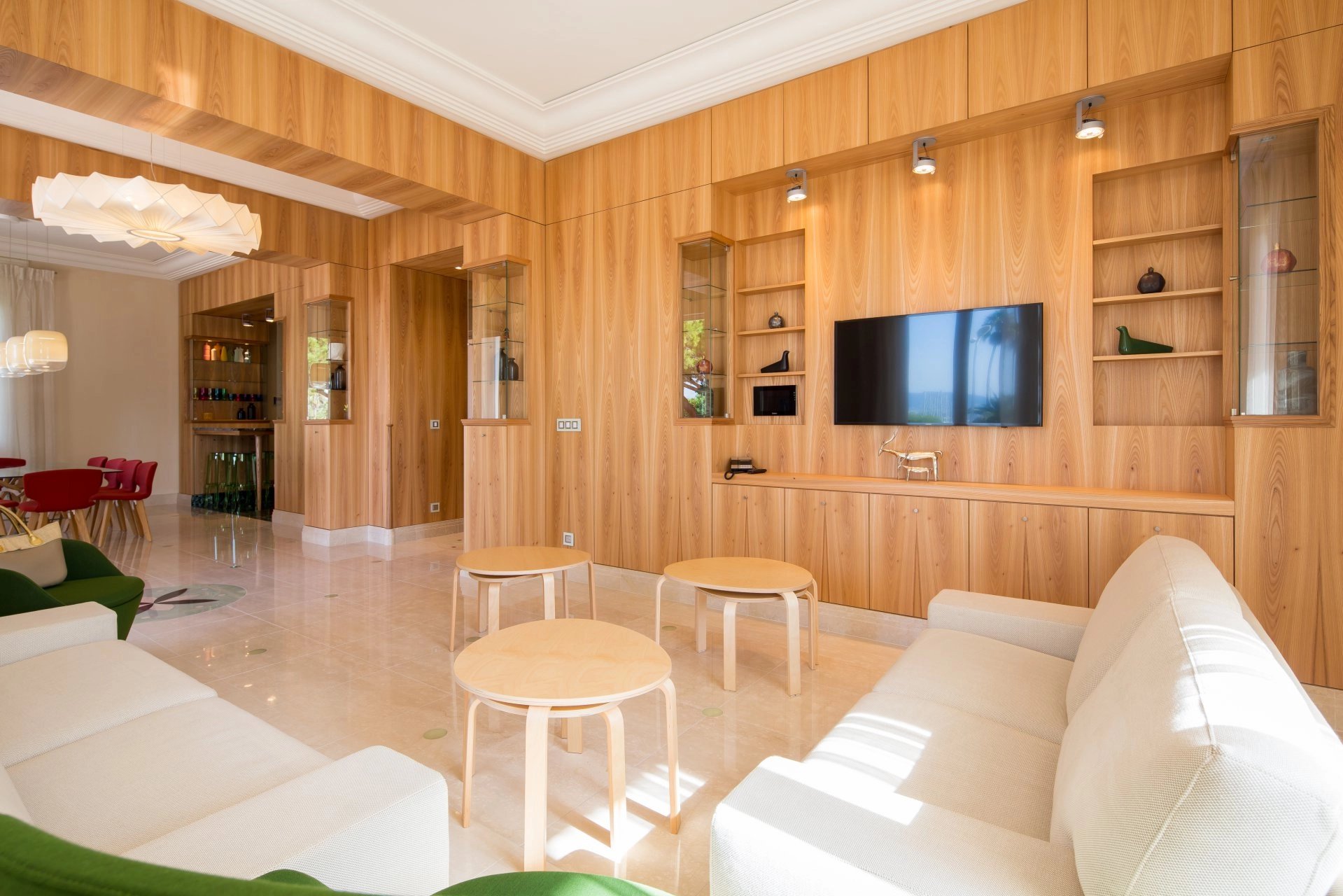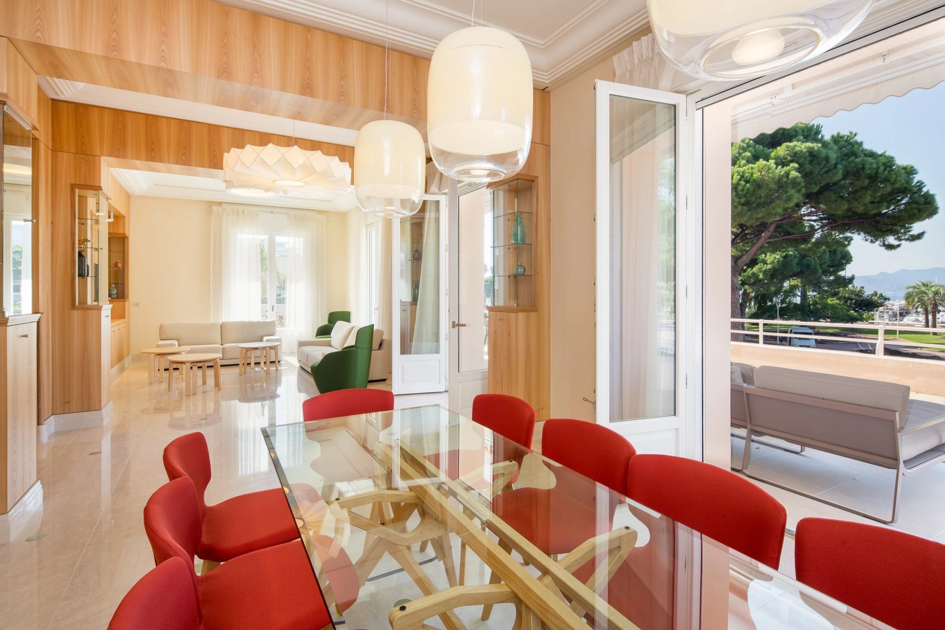 Réception s’ouvrant sur la terrasse et comprenant salon, salle à manger et cuisine équipée américaine