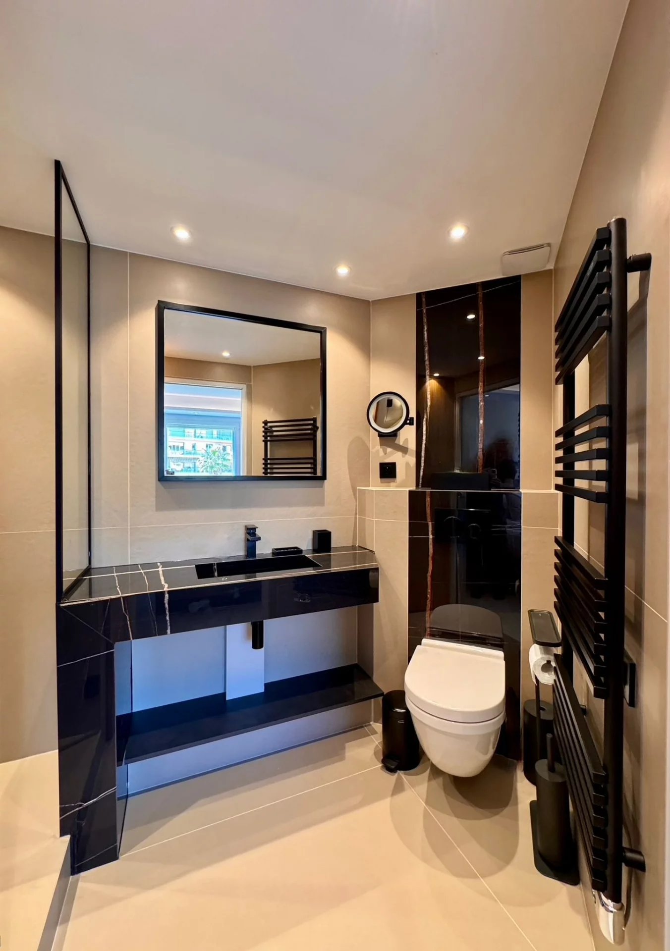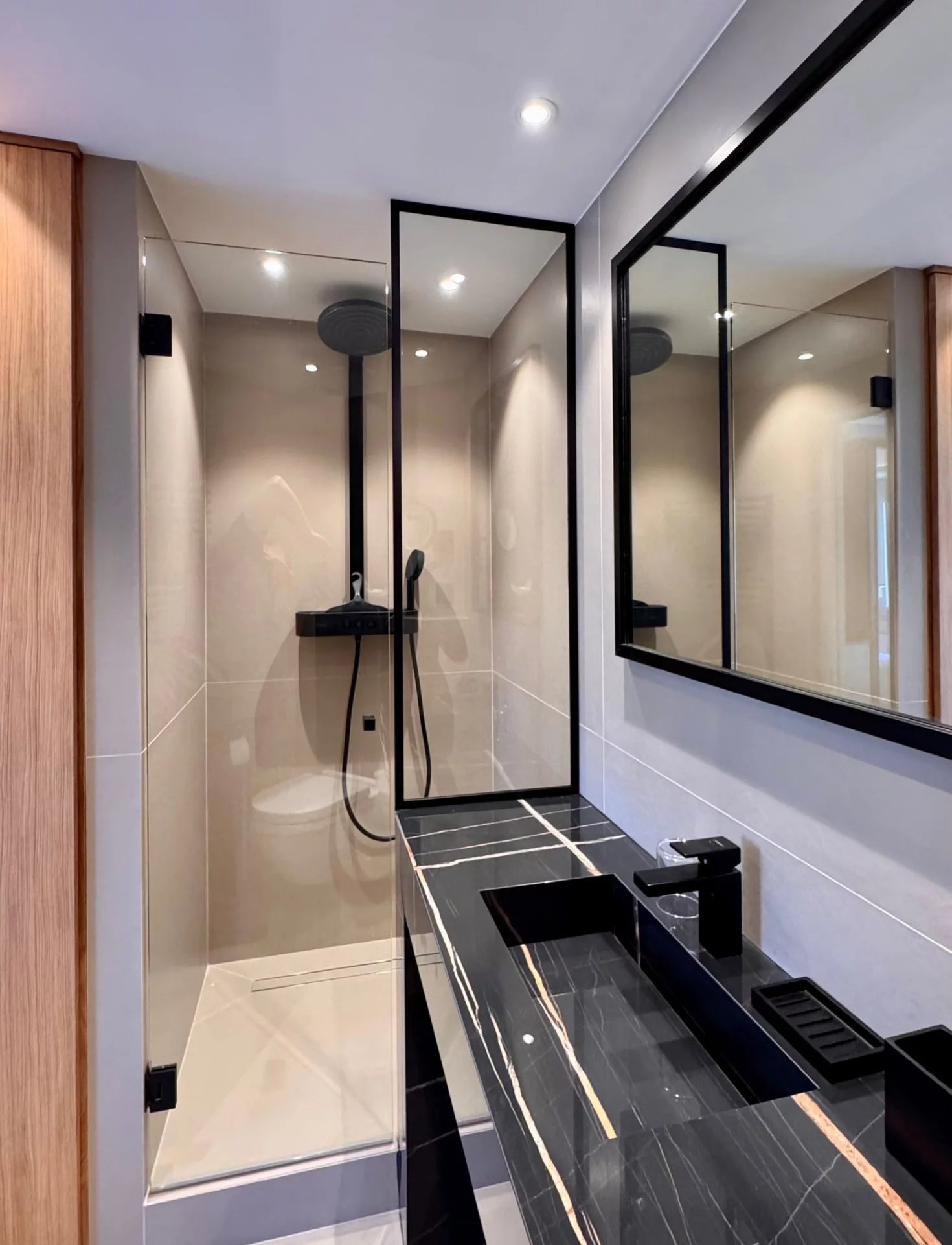 Côté nuit, l’appartement dispose de deux chambres en suite, chacune avec sa salle d’eau, garantissant confort et intimité.