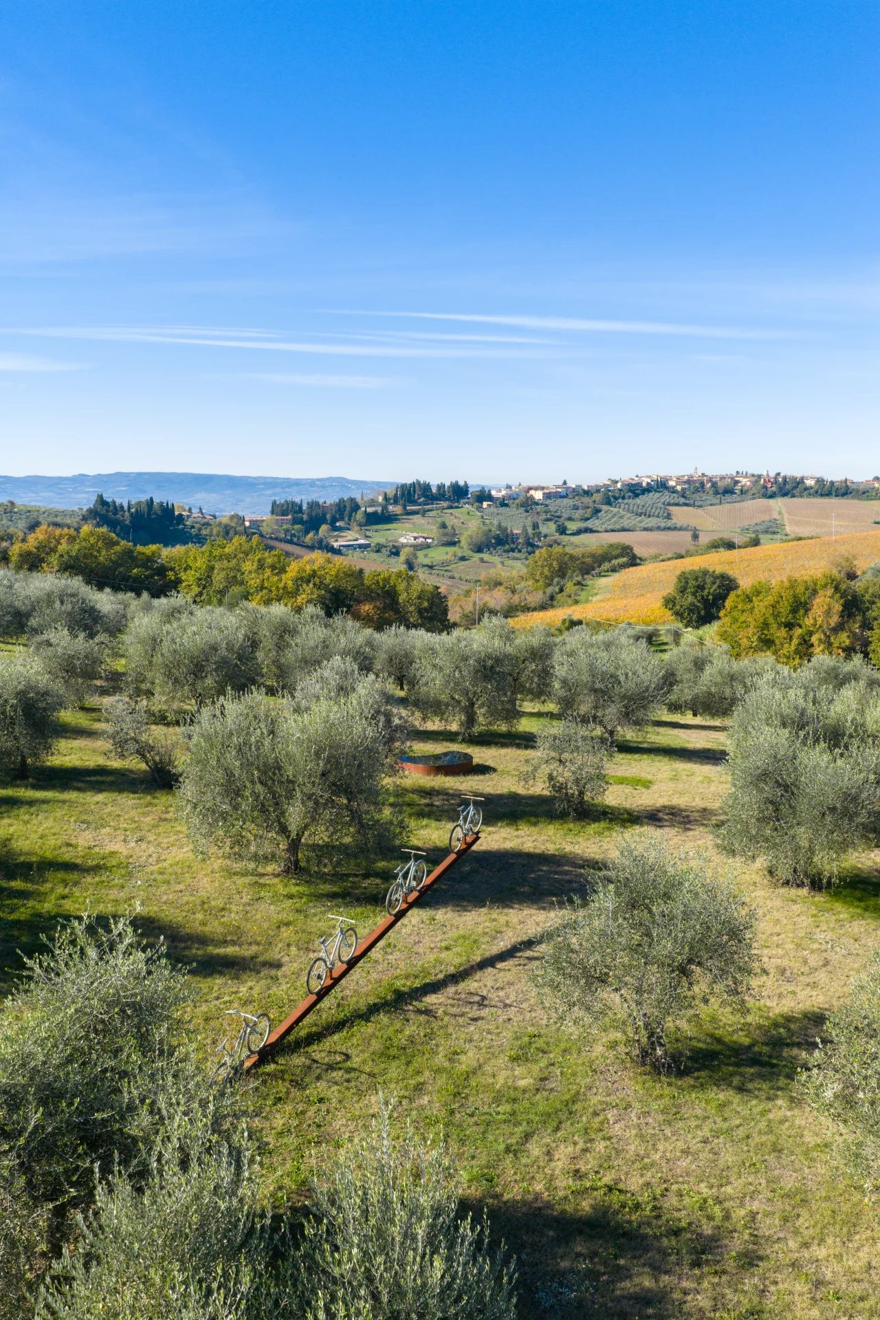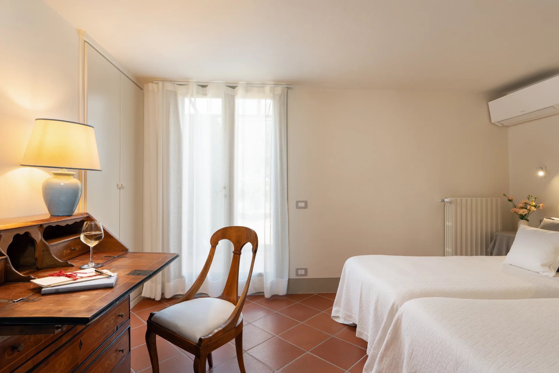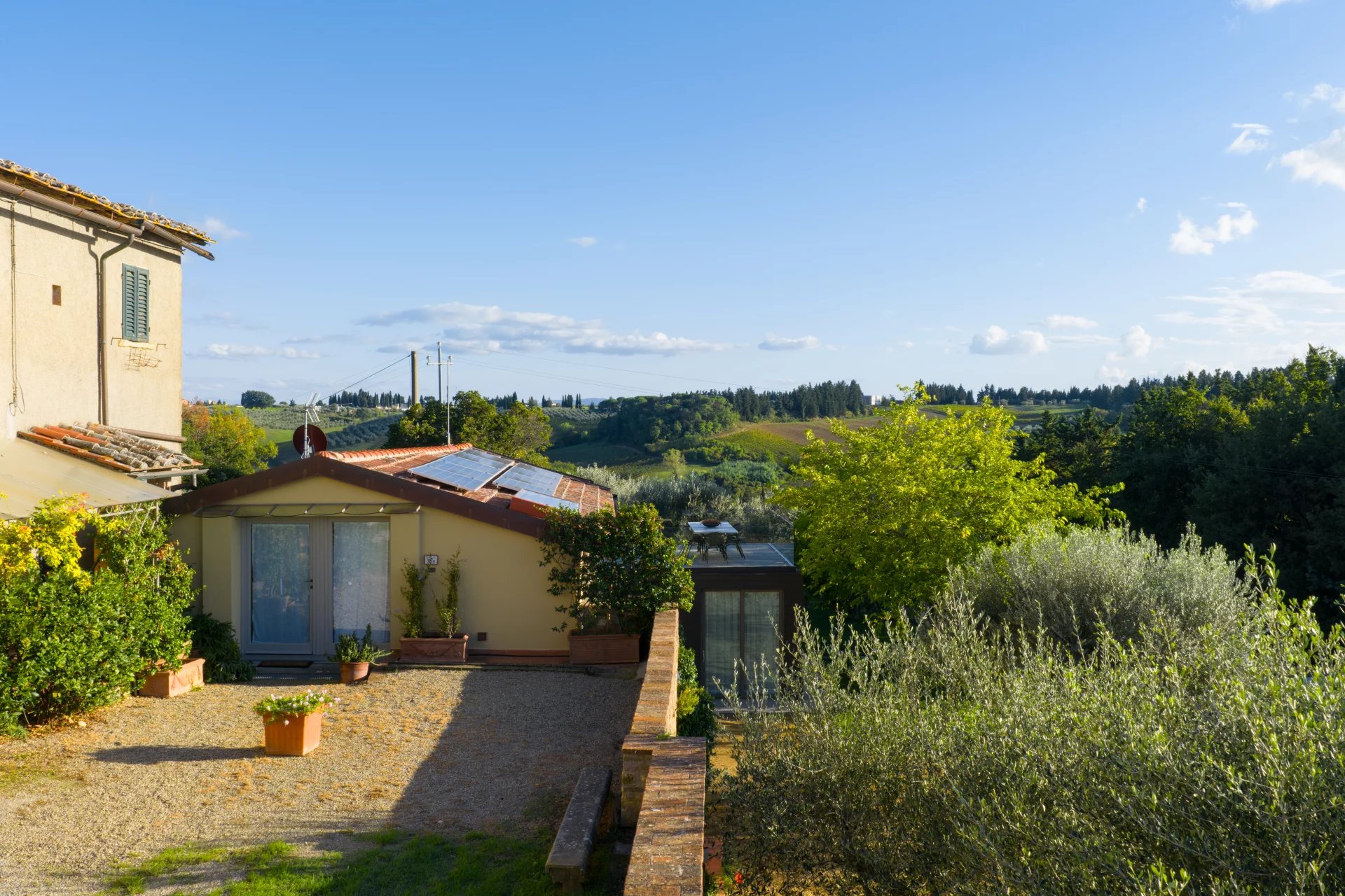 La propriété dispose de quatre chambres doubles, chacune avec sa salle de bain privative, ainsi que d’une spacieuse véranda, d’une grande terrasse et d’une piscine panoramique offrant une vue imprenable sur les vignobles, les oliveraies et les collines bordées de cyprès.