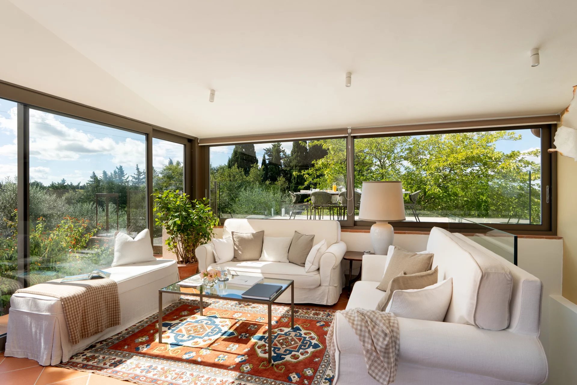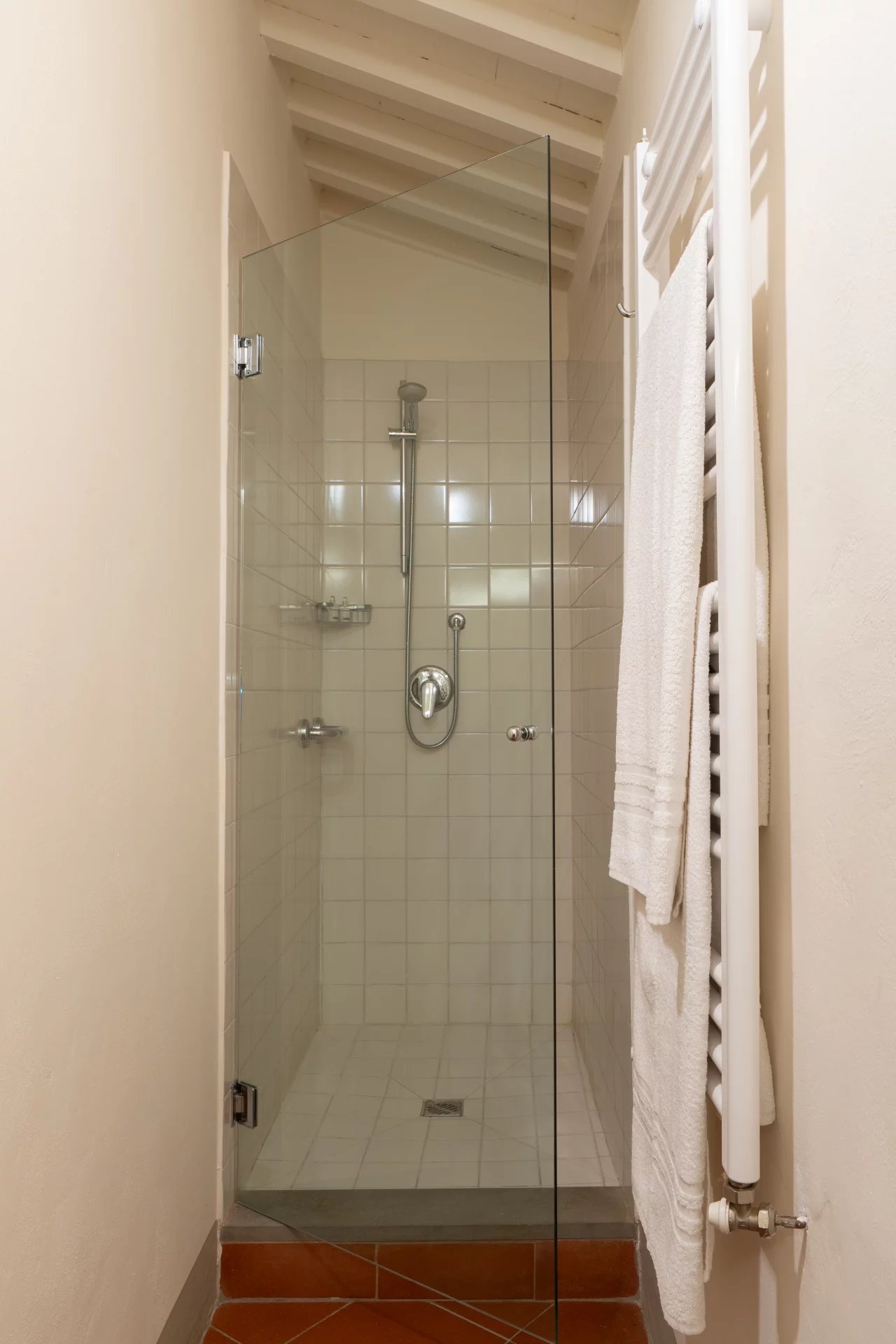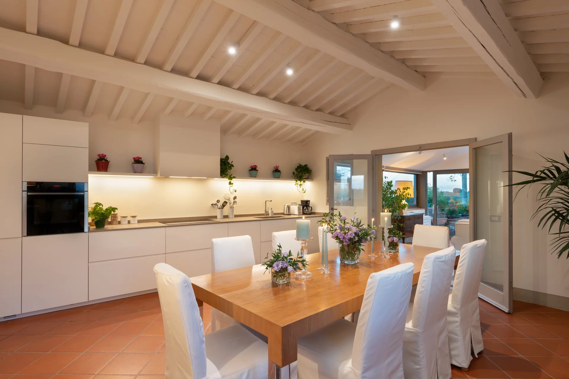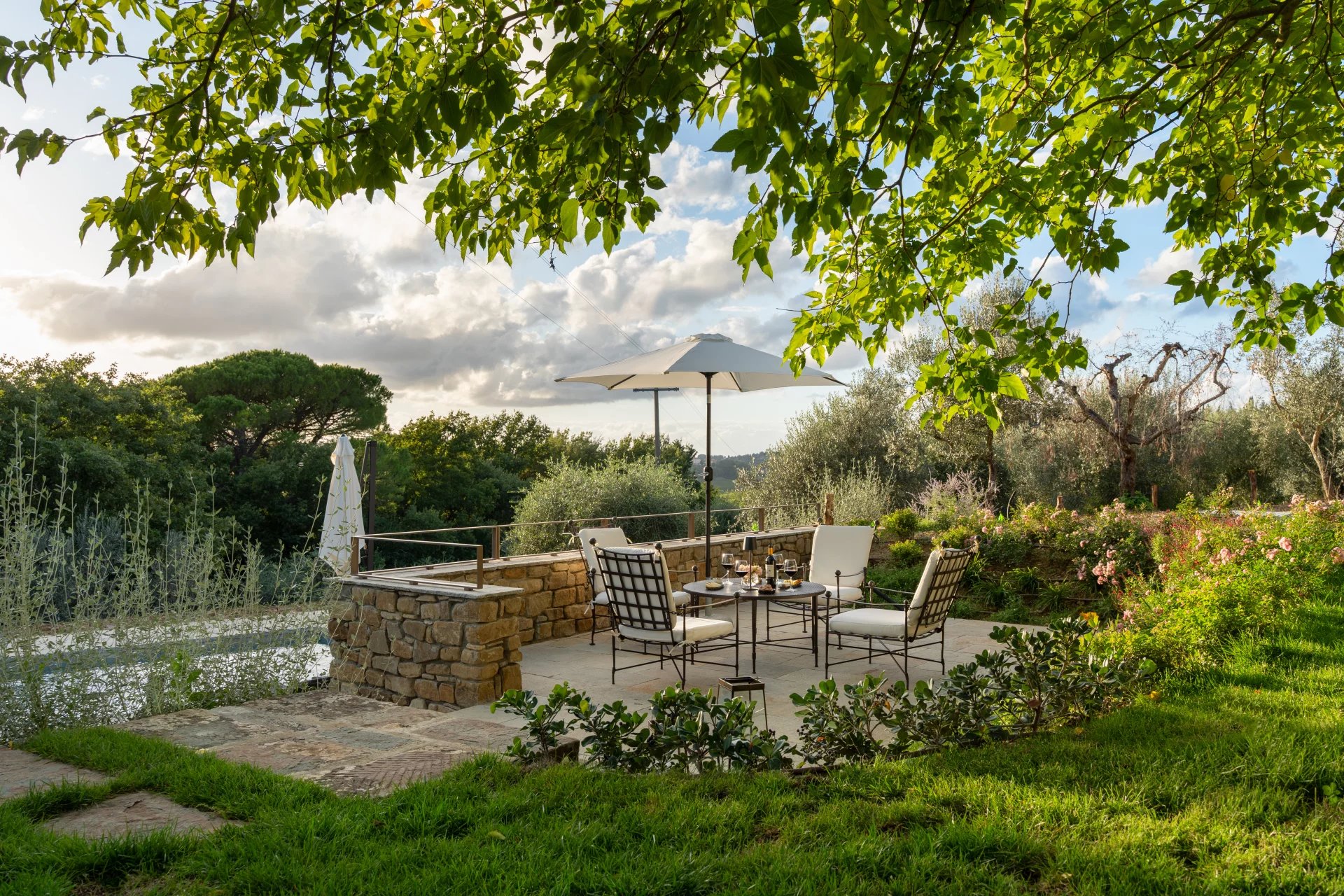La propriété dispose de quatre chambres doubles, chacune avec sa salle de bain privative, ainsi que d’une spacieuse véranda, d’une grande terrasse et d’une piscine panoramique offrant une vue imprenable sur les vignobles, les oliveraies et les collines bordées de cyprès.