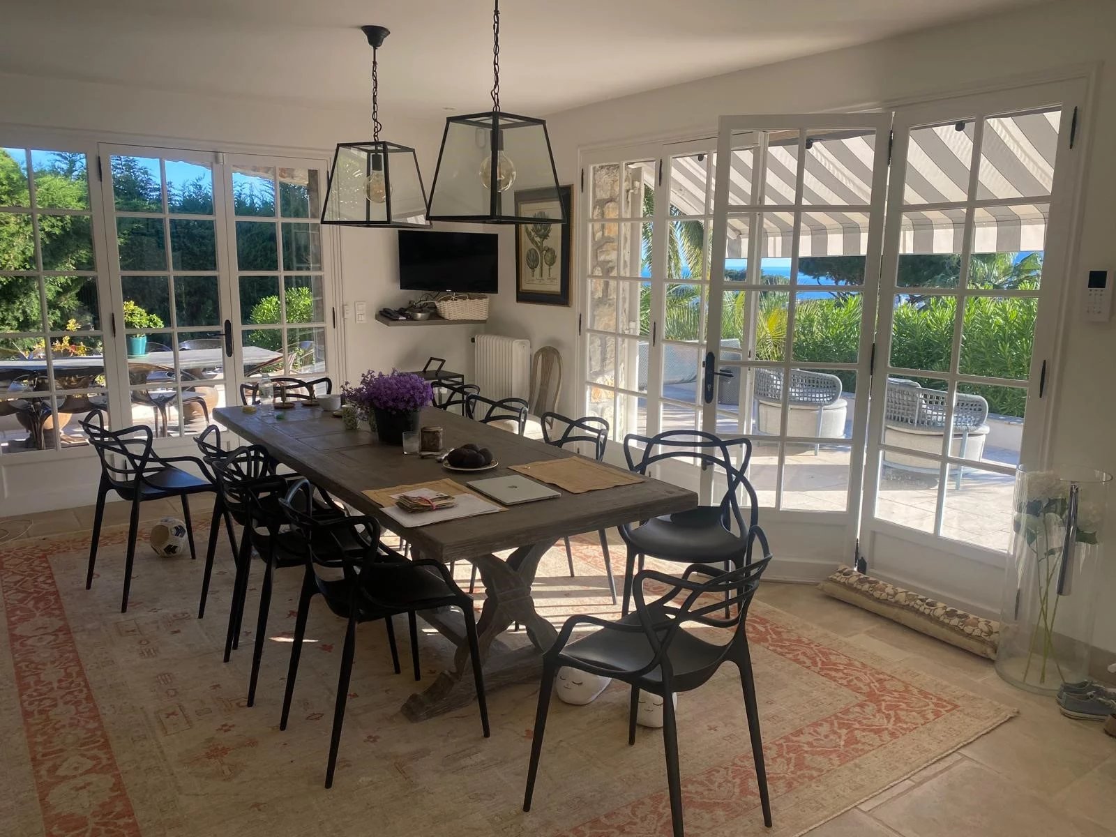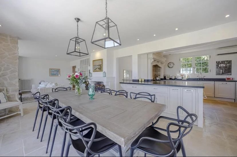 Pièce de réception comprenant salon, salle à manger et cuisine ouverte, le tout donnant sur les extérieurs.