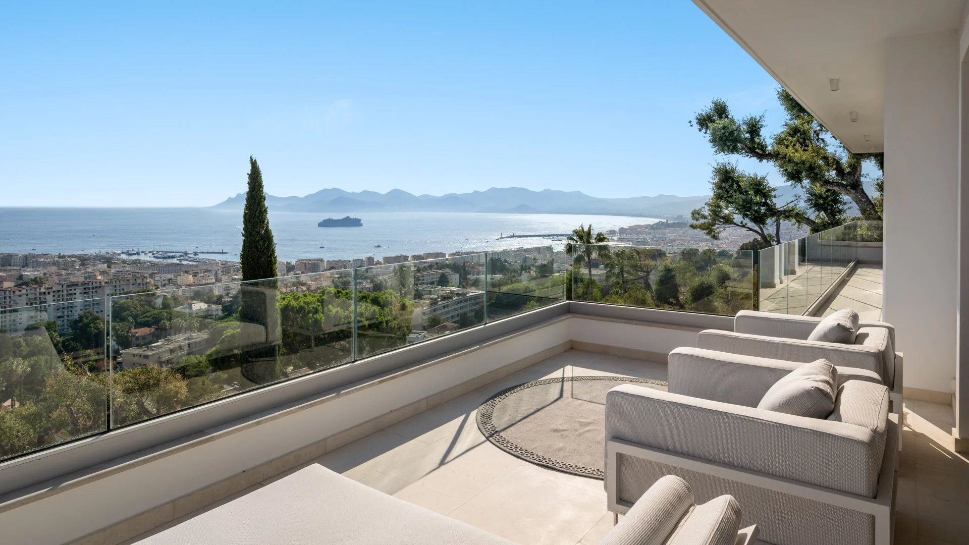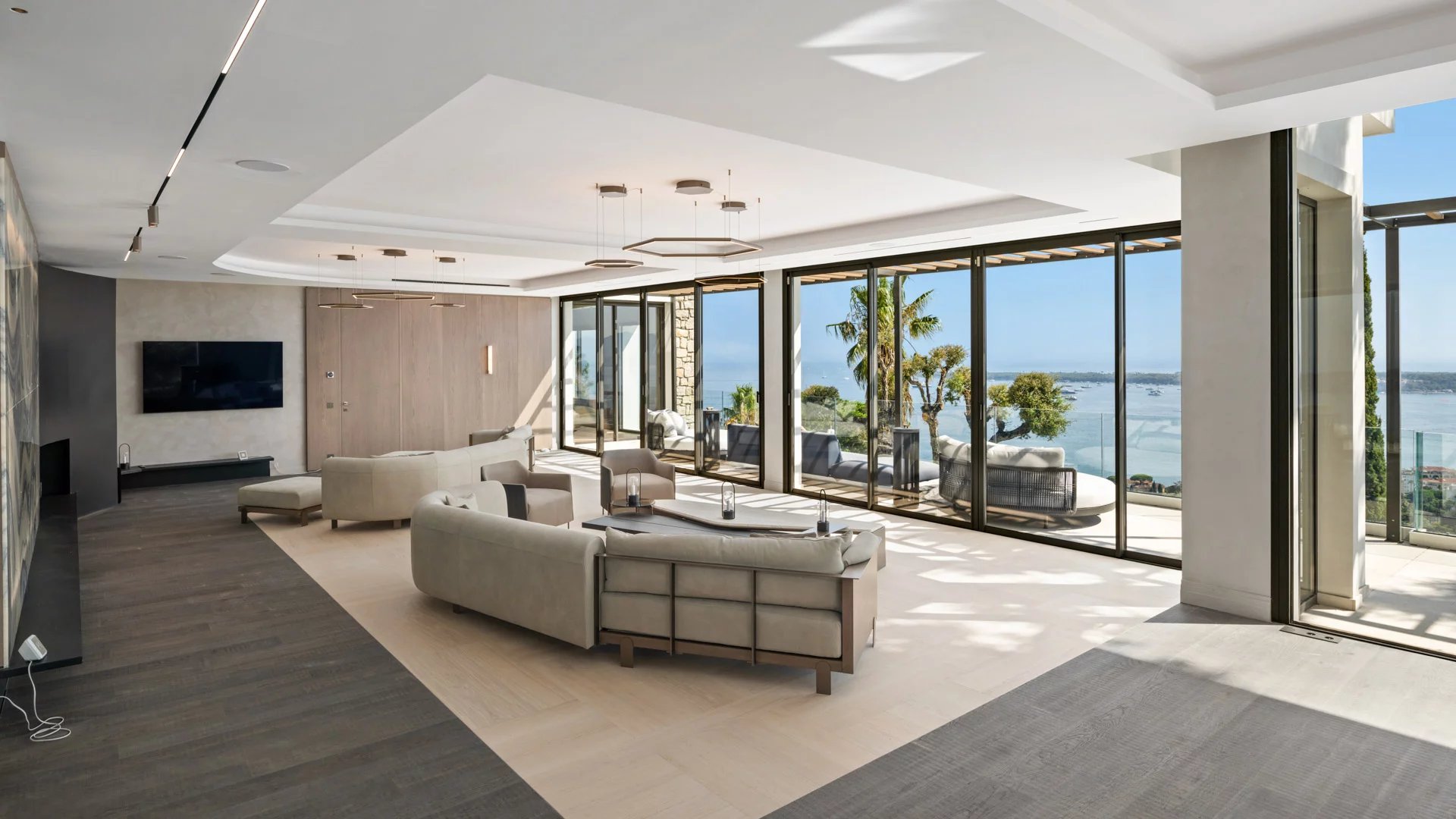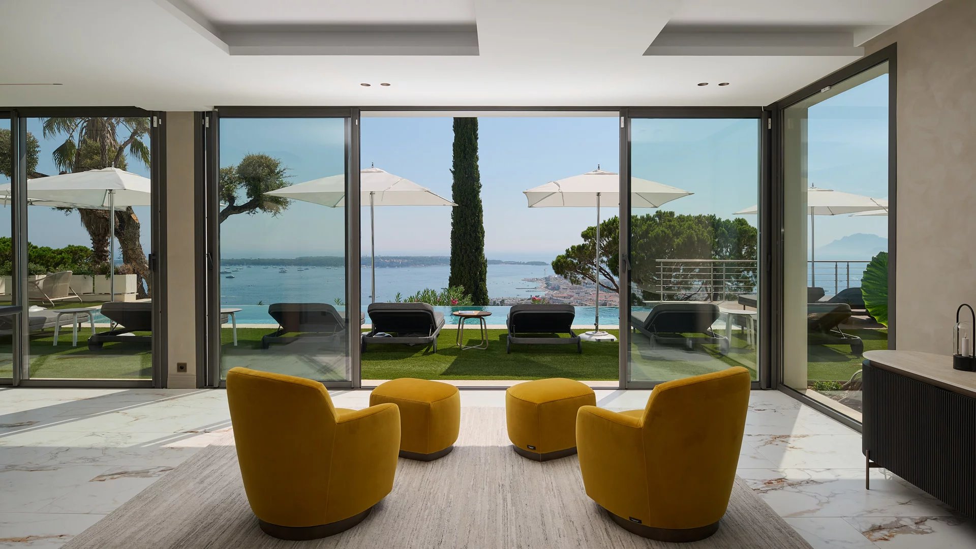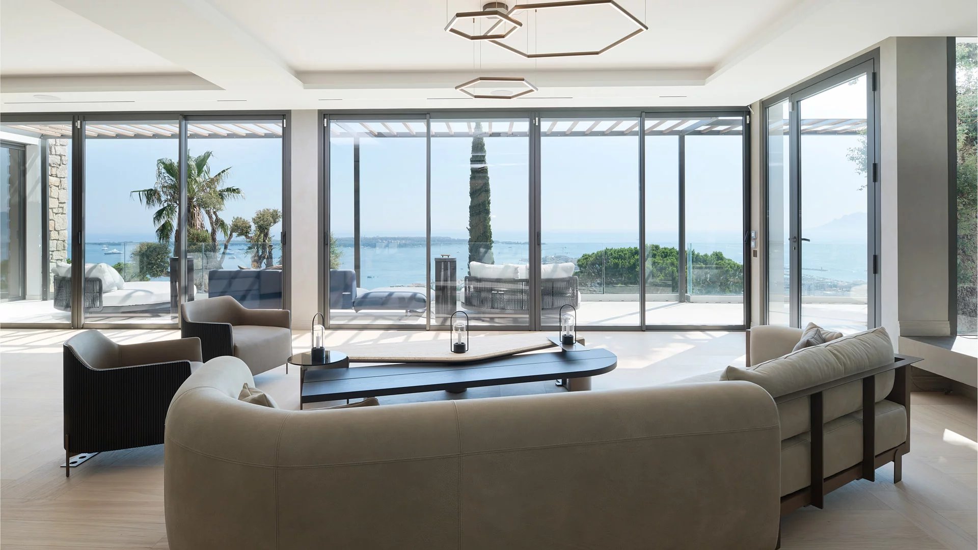 Avec ses 550 m² habitables, la villa dévoile une décoration sophistiquée et offre une vue imprenable sur la Baie de Cannes et les Îles de Lérins, garantissant ainsi des panoramas à couper le souffle.