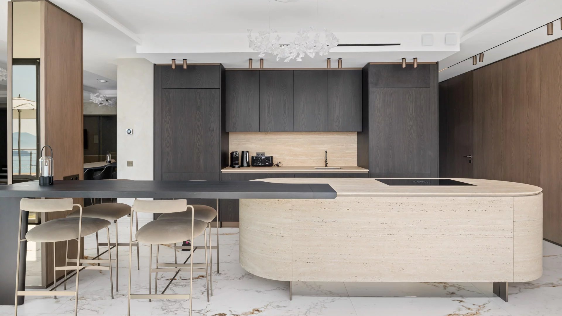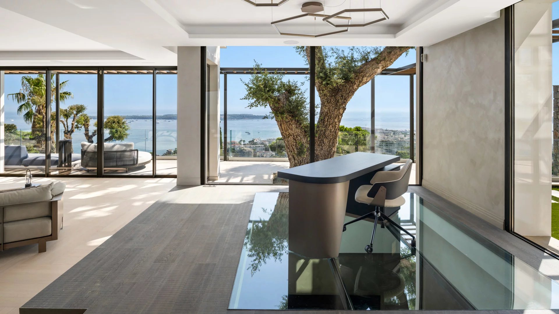 Un hall d'entrée s'ouvrant sur un vaste salon-salle à manger, un bureau avec terrasse offrant une vue sur la mer.