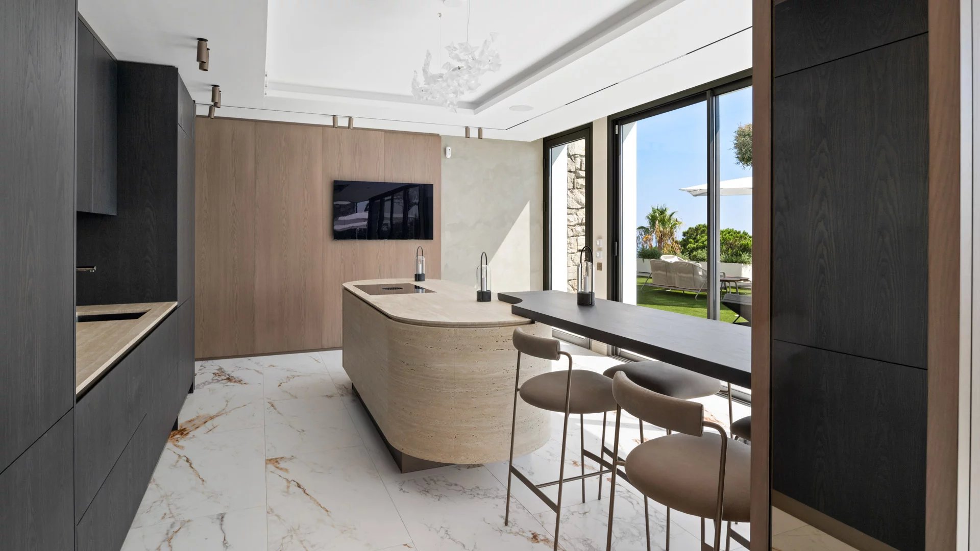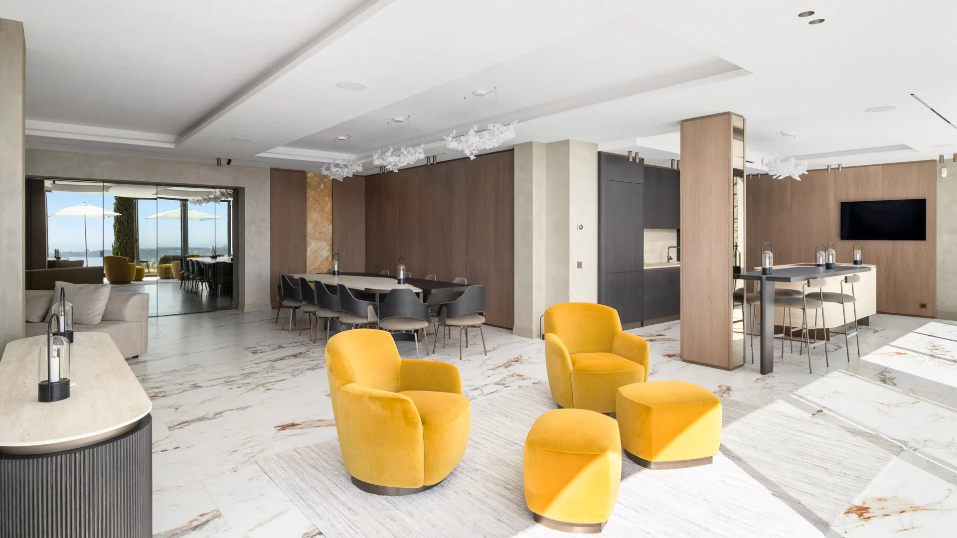 Une salle à manger, un salon TV, un salon d'été, une cuisine américaine entièrement équipée avec arrière-cuisine et office.