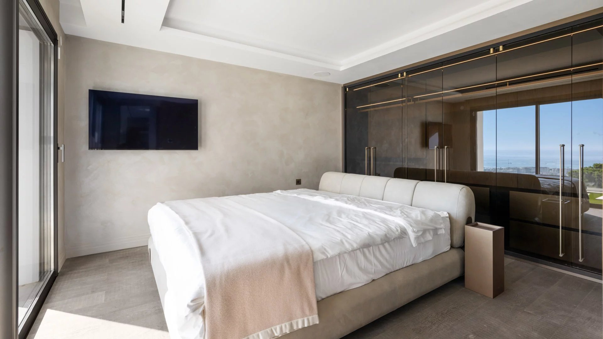 Une somptueuse chambre de Maître (lit double de 180cm) avec vue sur la mer, dressing et salle de bains complète avec douches et toilettes.