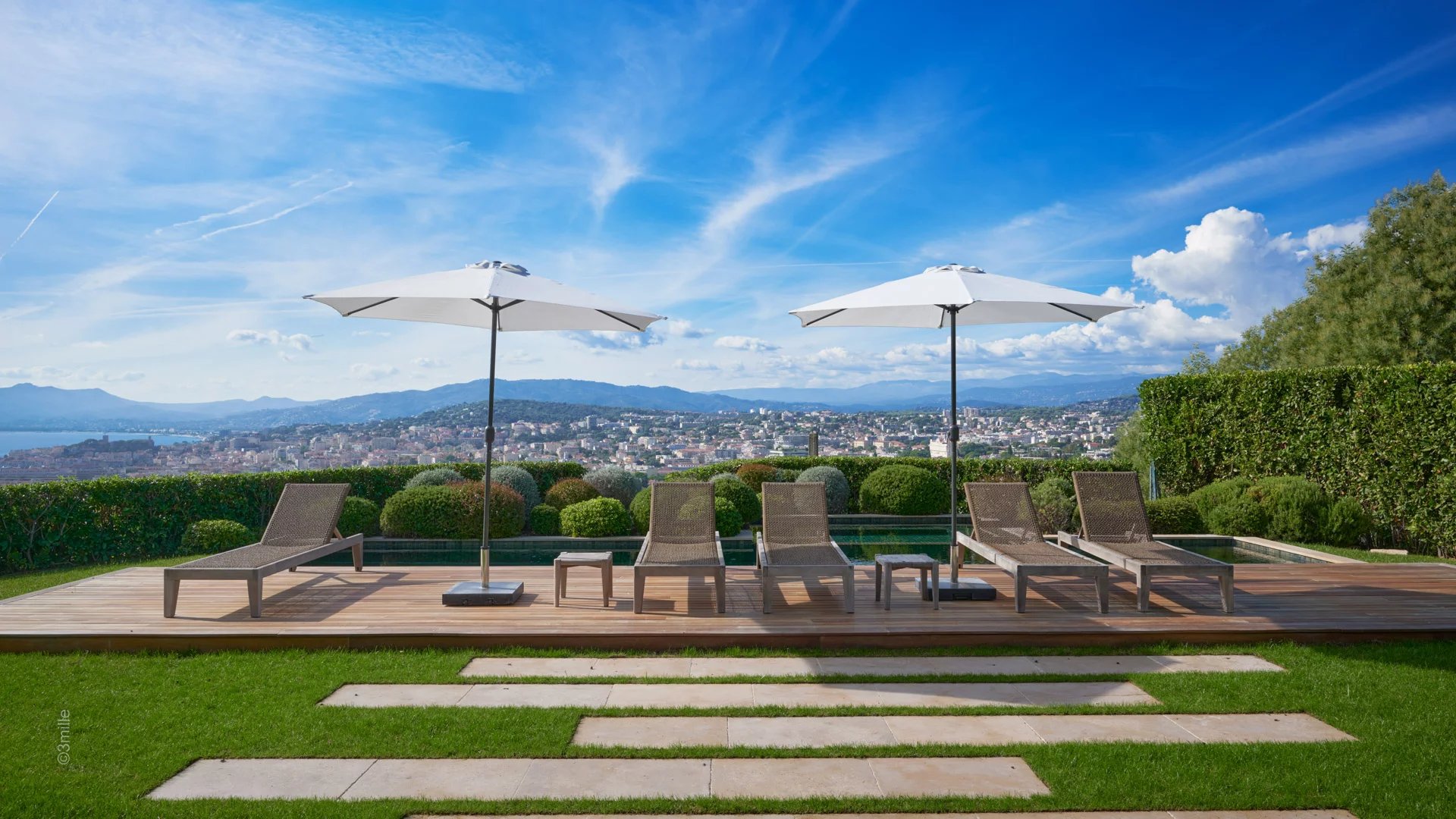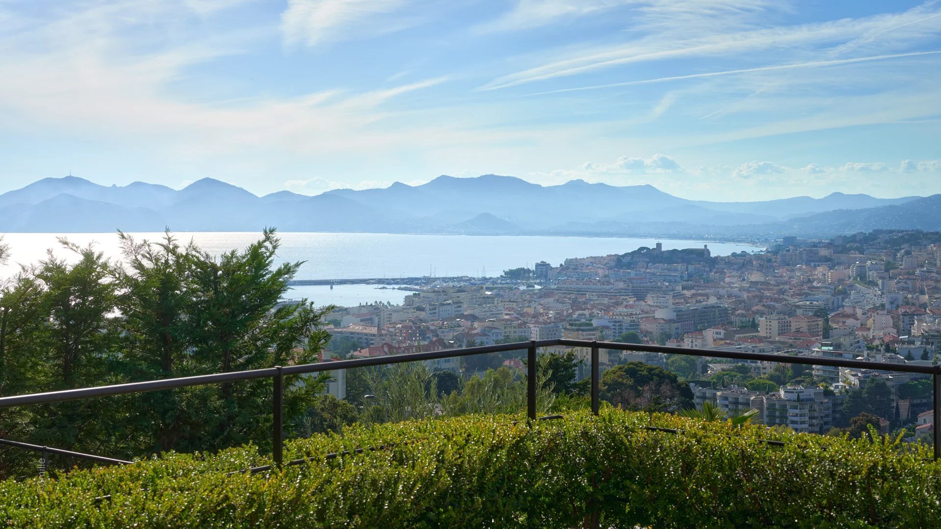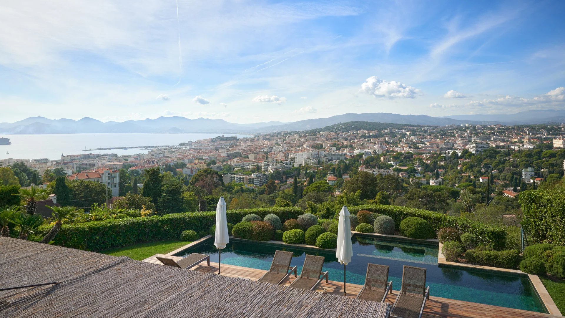 Dans un domaine privé sur les hauteurs de Cannes, élégante propriété, entièrement rénovée et climatisée, jouissant d'une belle vue sur la Baie de Cannes.