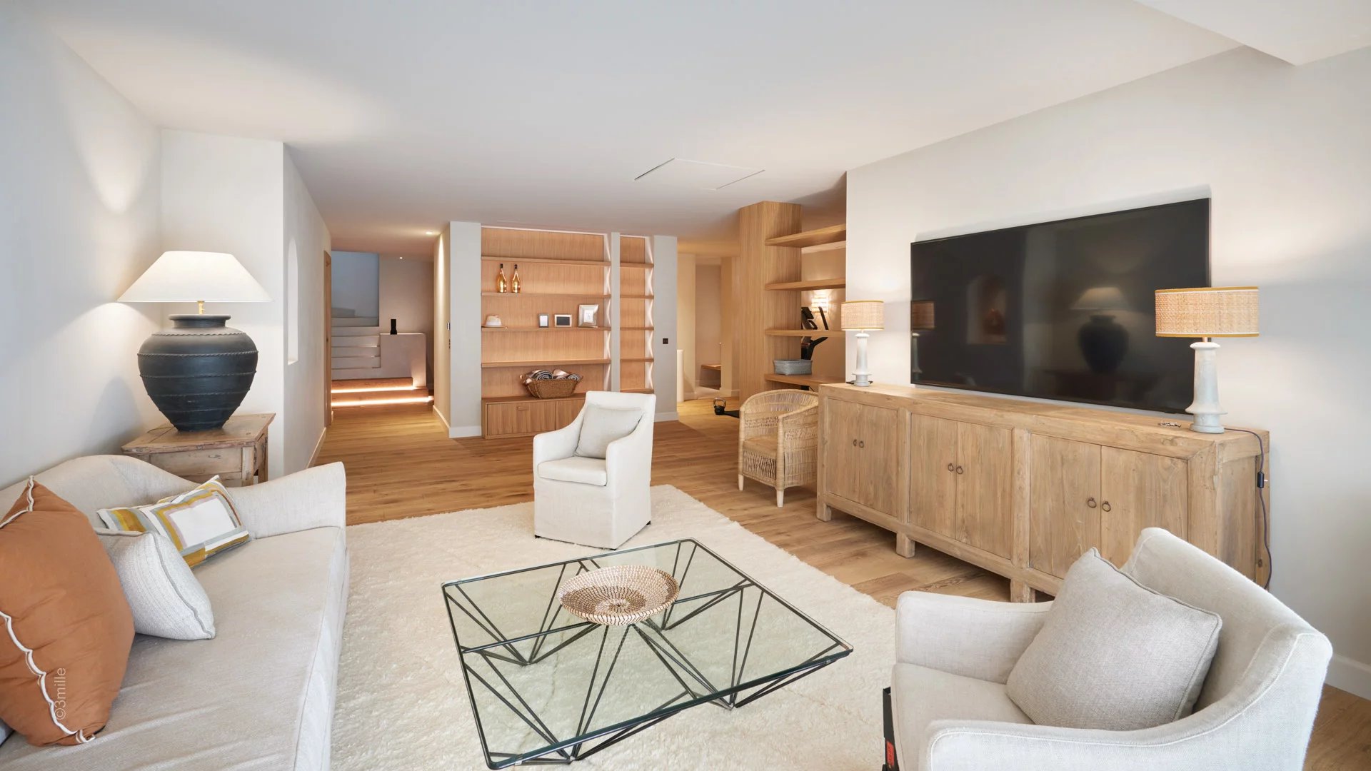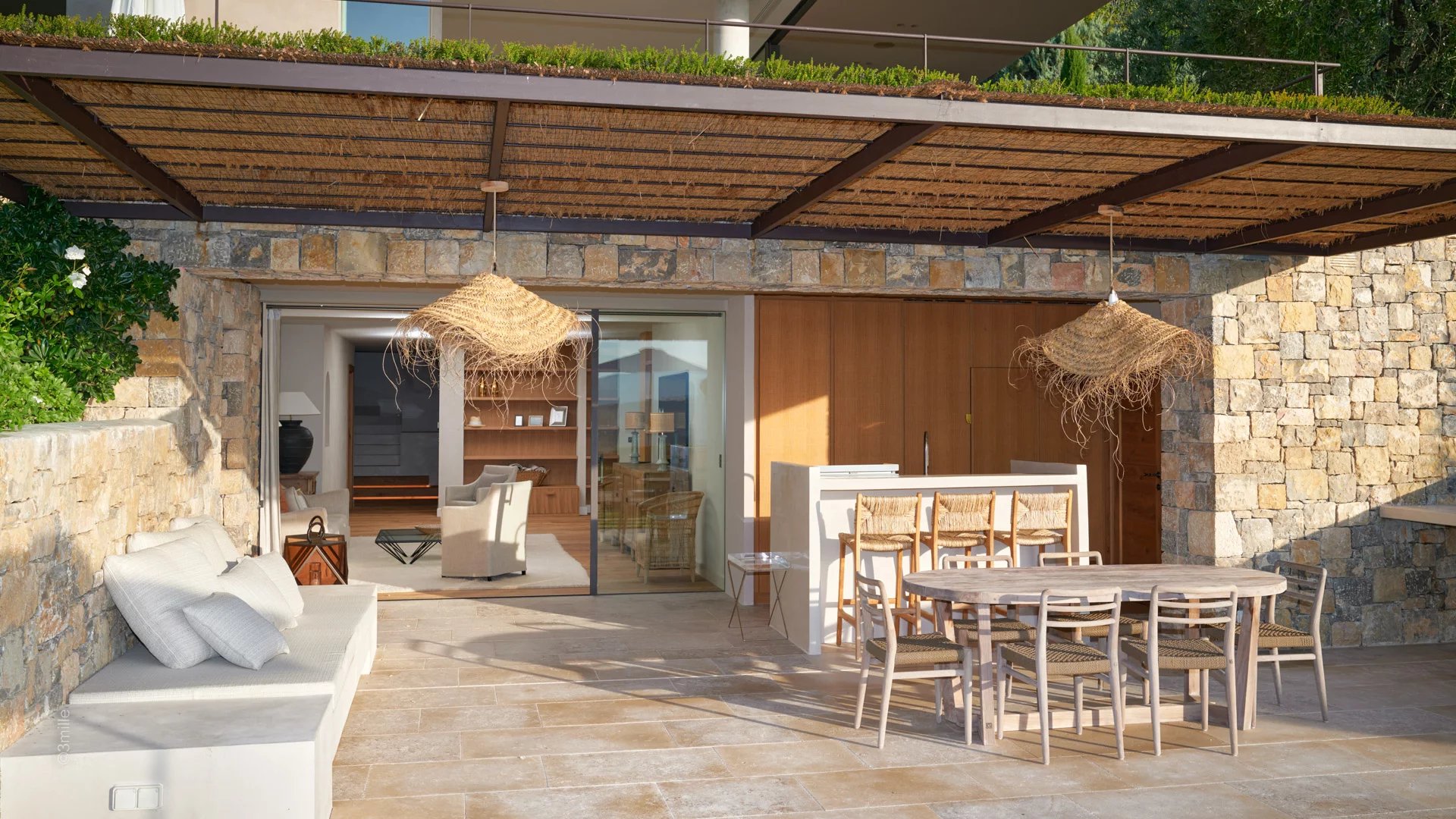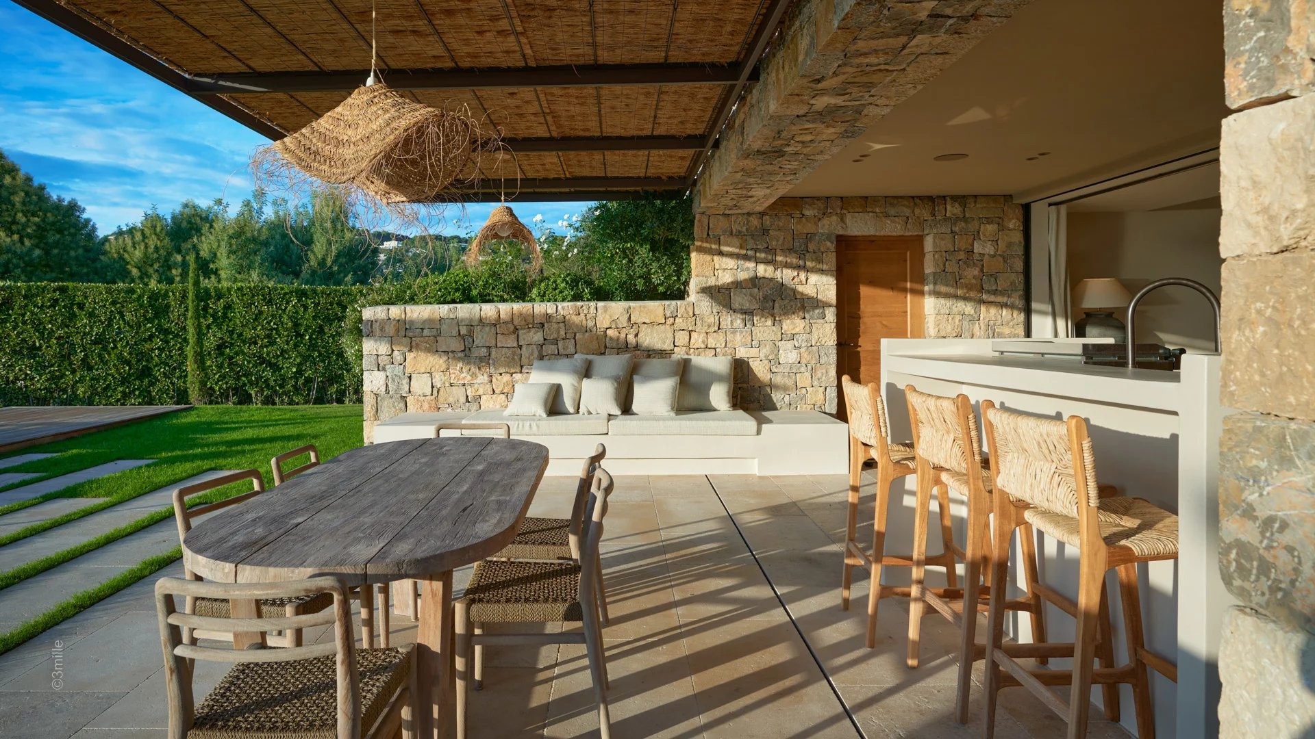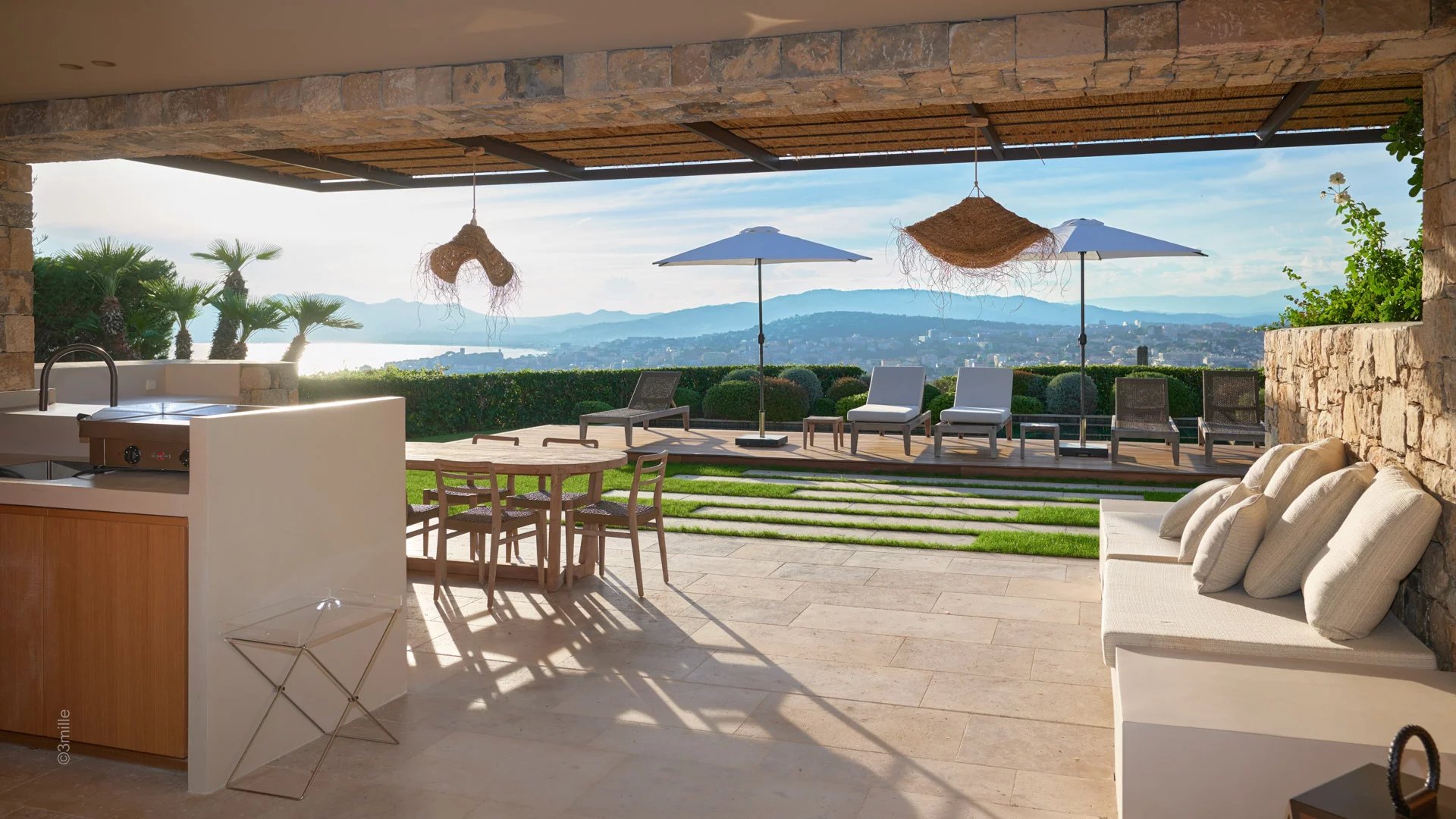 Grand salon TV donnant sur la terrasse couverte avec cuisine / bar / salle à manger d'été avec BBQ à gaz, plancha,lave vaisselle et réfrigérateur