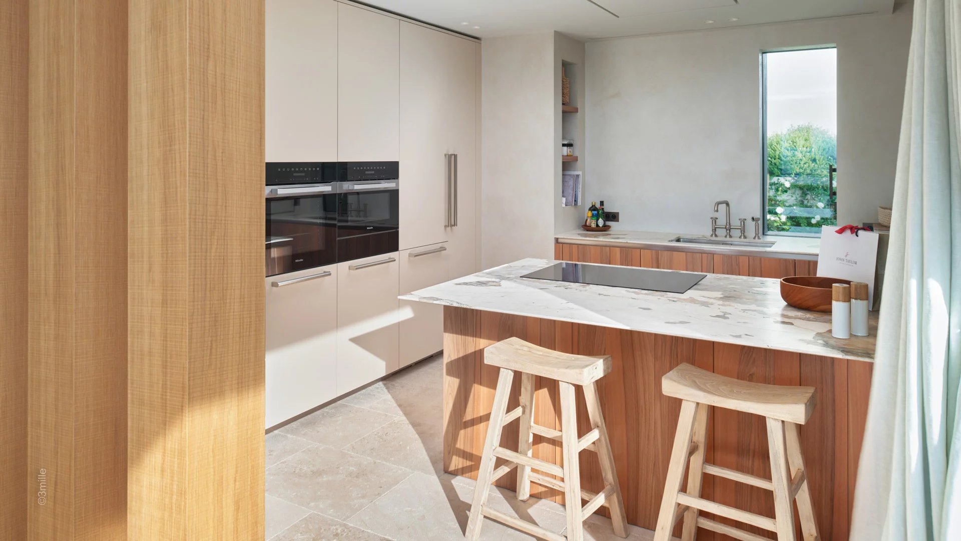 Cuisine entièrement équipée ouverte sur salle à manger et salon