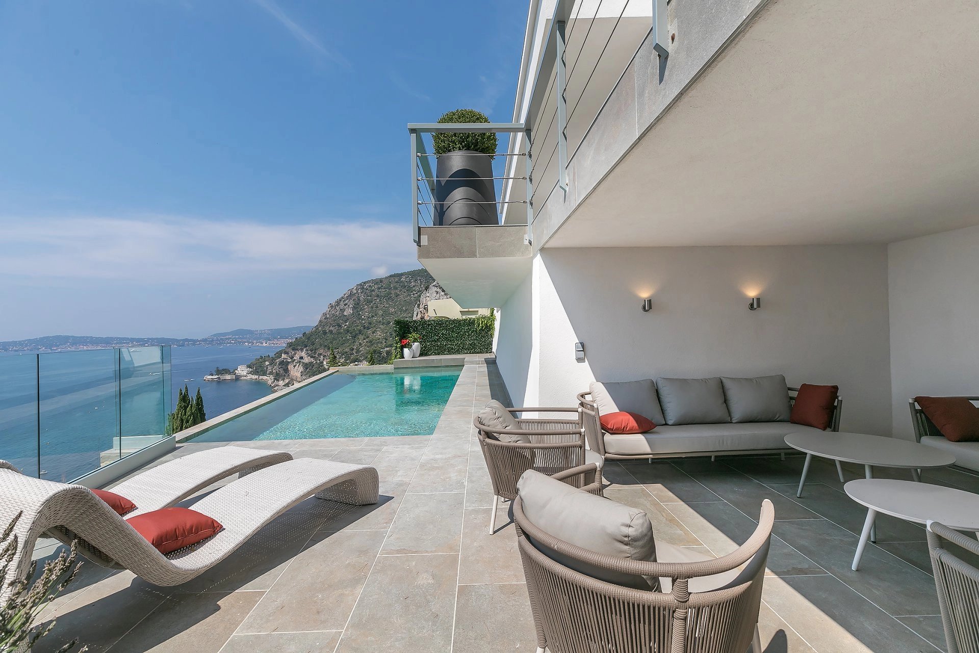 Exceptionnelle situation, à quelques minutes de Monaco au coeur d'un petit domaine fermé, pour cette villa moderne entièrement rénovée. Elle bénéficie d'une vue époustouflante sur la plage de la Mala et la péninsule de Saint Jean Cap Ferrat. Grand séjour/ salle à manger avec cuisine américaine, 4 chambres en suite, dont une de Maître, nombreuses terrasses, et espaces de détente, belle piscine à débordement. 3 parkings et un garage.