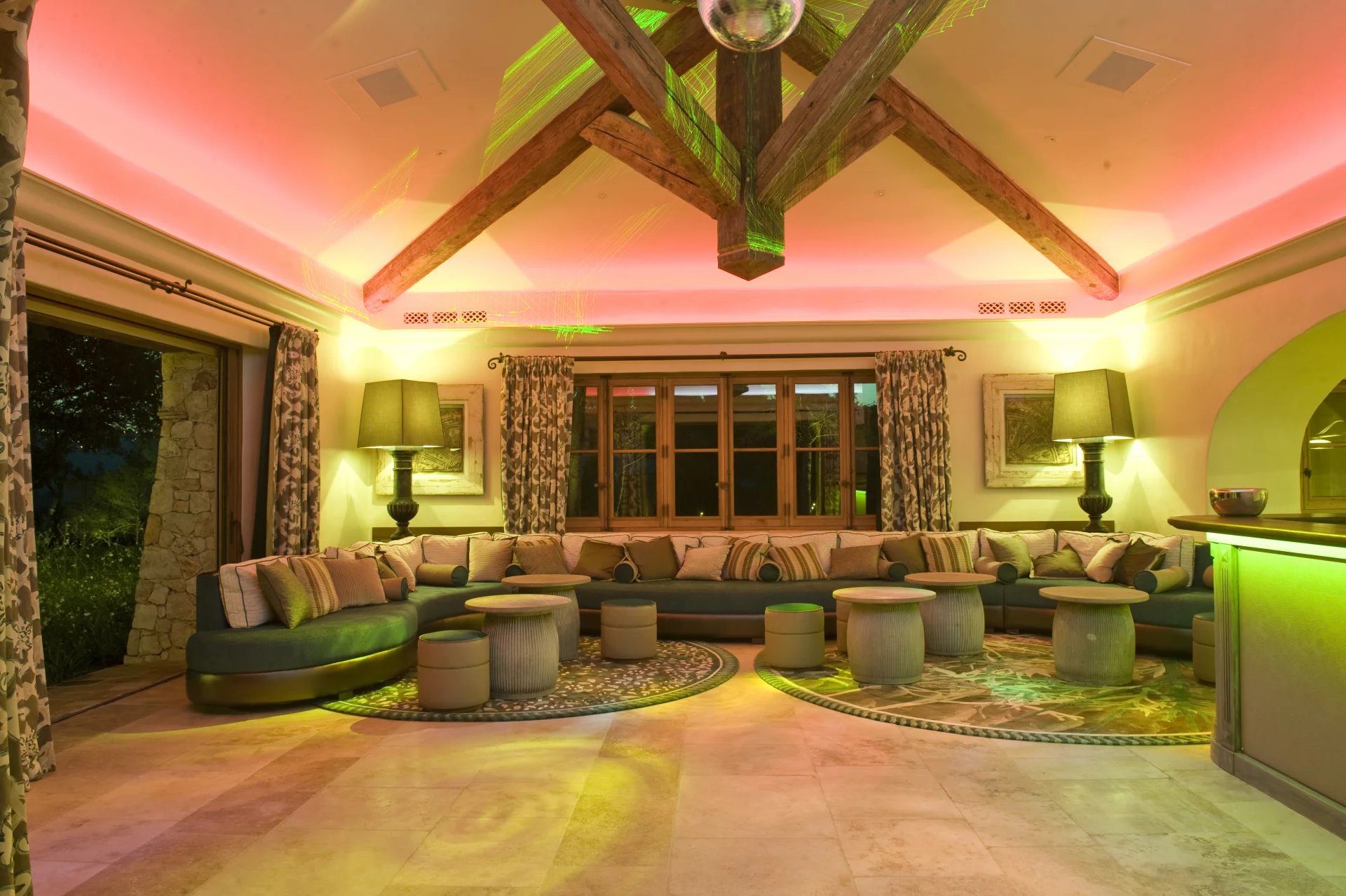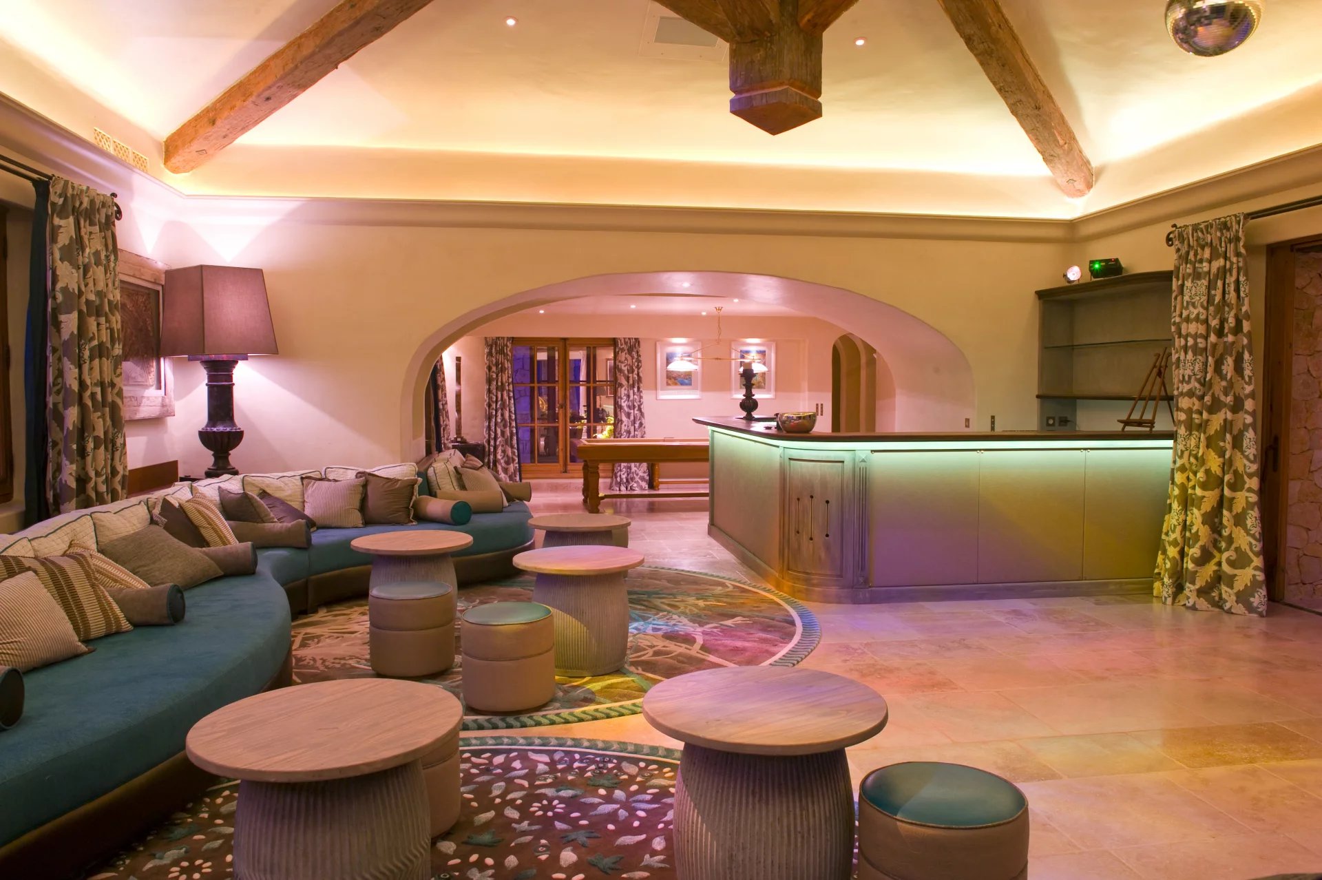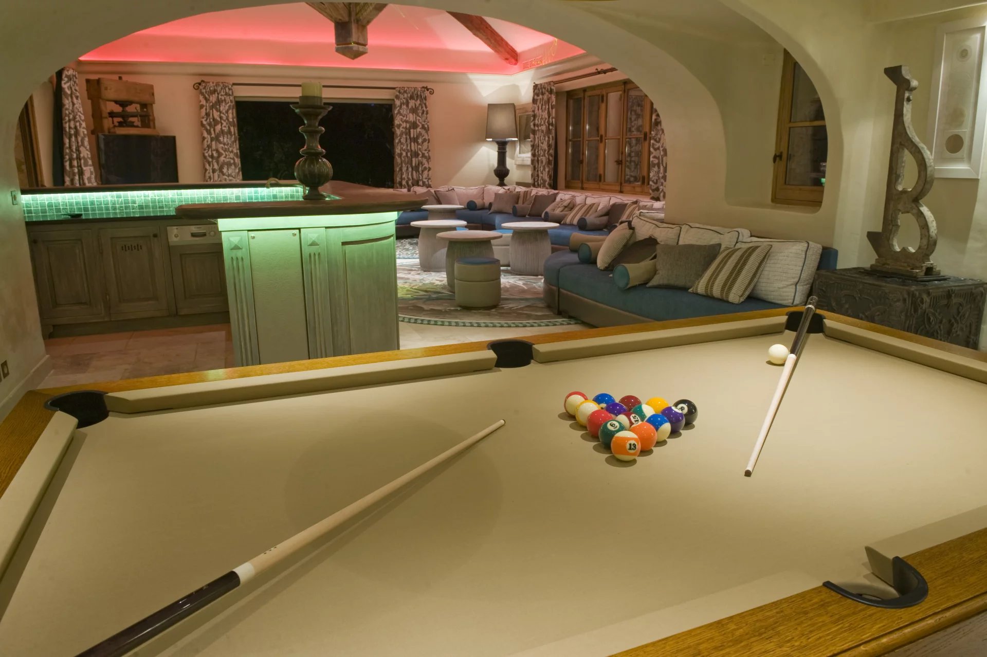 PARTIE OUEST : Salon Home Cinéma, disco (56 m²), billard, bar, toilettes ouvrant sur terrasse de jeux et jardin.