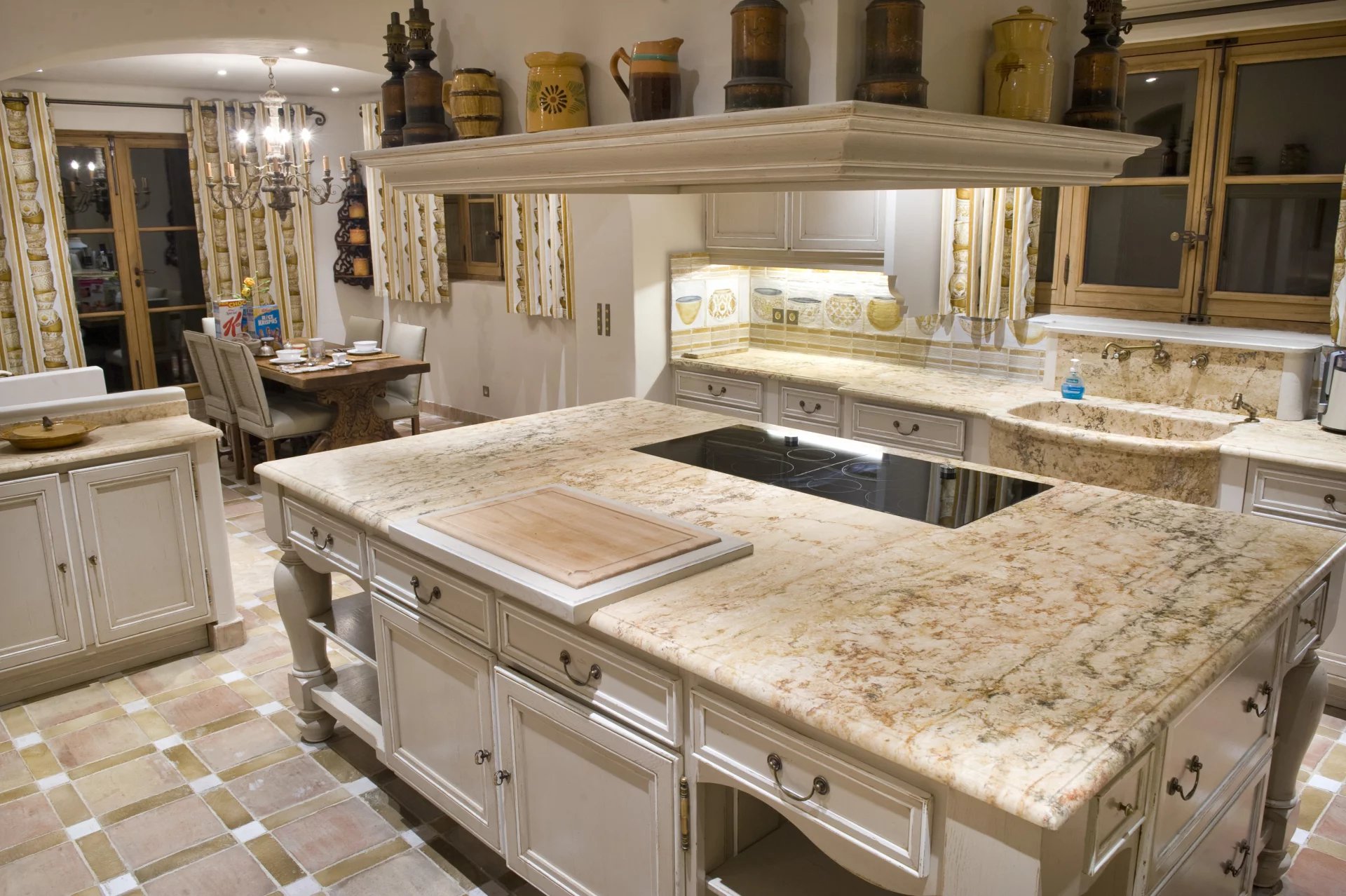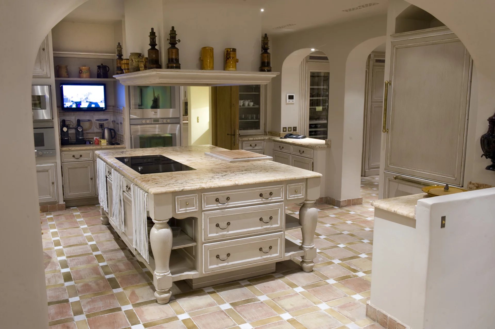 Superbe cuisine haut de gamme (90 m²) entièrement équipée avec arrière cuisine, cellier, desserte (accès direct indépendant), grande buanderie et salle de repassage avec accès indépendant.