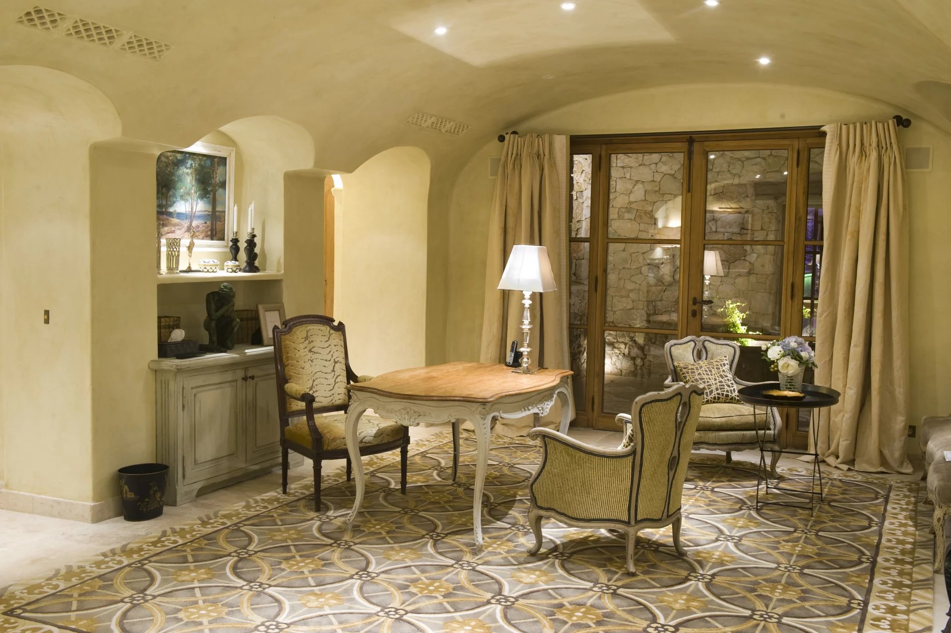 Grand bureau avec cheminée, TV (intégration de l'écran derrière miroir) ouvrant sur terrasse, jardin et piscine avec vue sur la baie de Cannes, salle d'archives, toilettes.