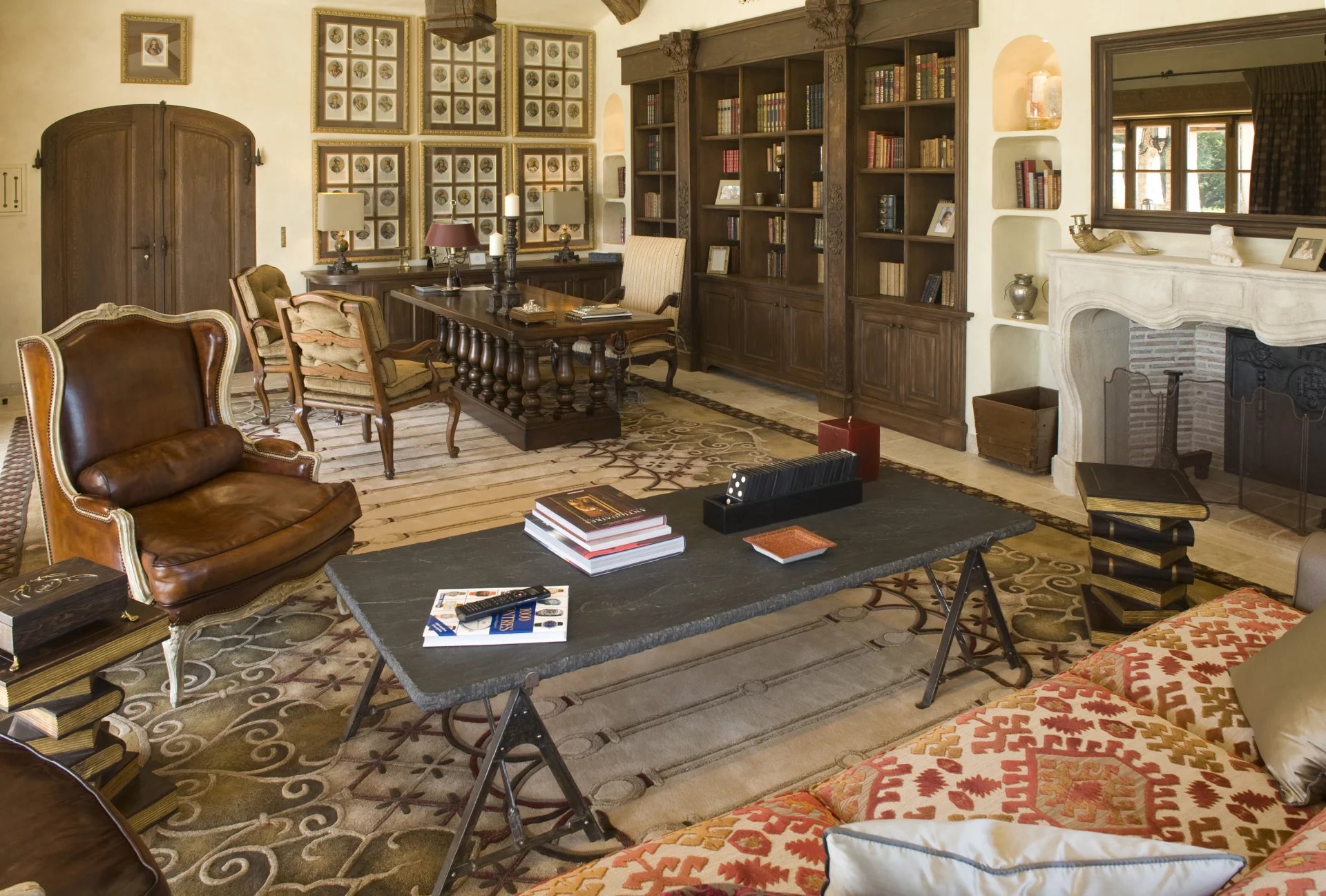 Salon / bureau avec cheminée et TV (intégration de l'écran derrière miroir)