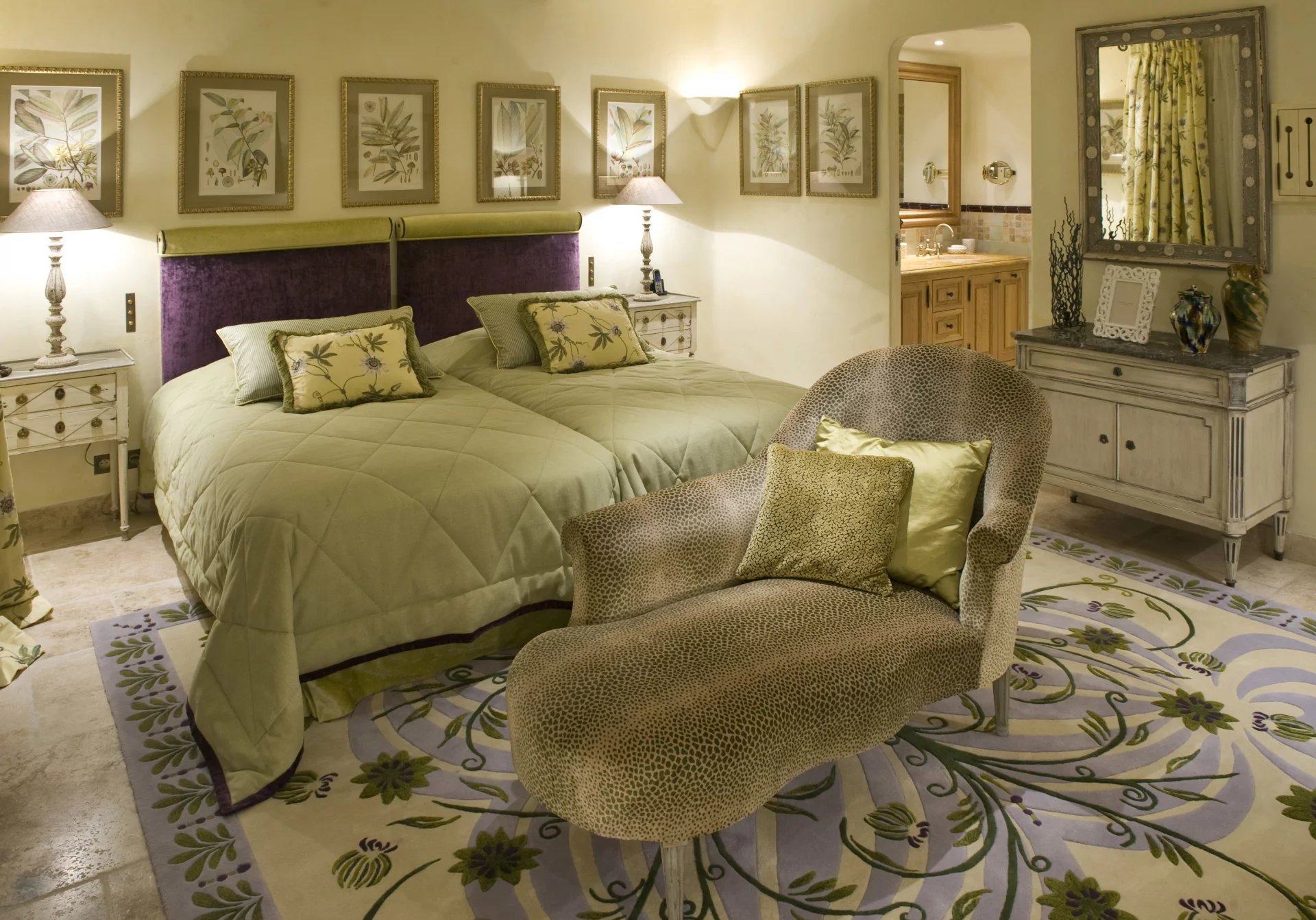 Chambre (deux lits x 100), TV / Dressing / Salle de bains incluant TV, baignoire, douche, double vasque et toilettes. Ouverte sur jardin