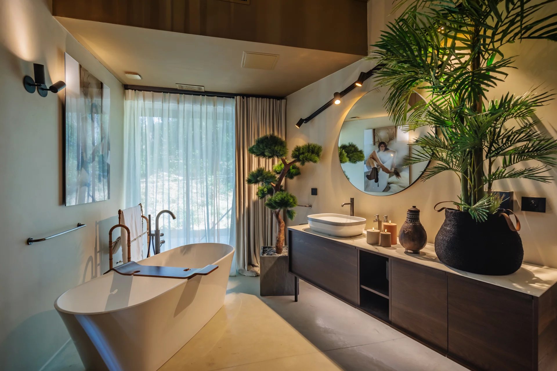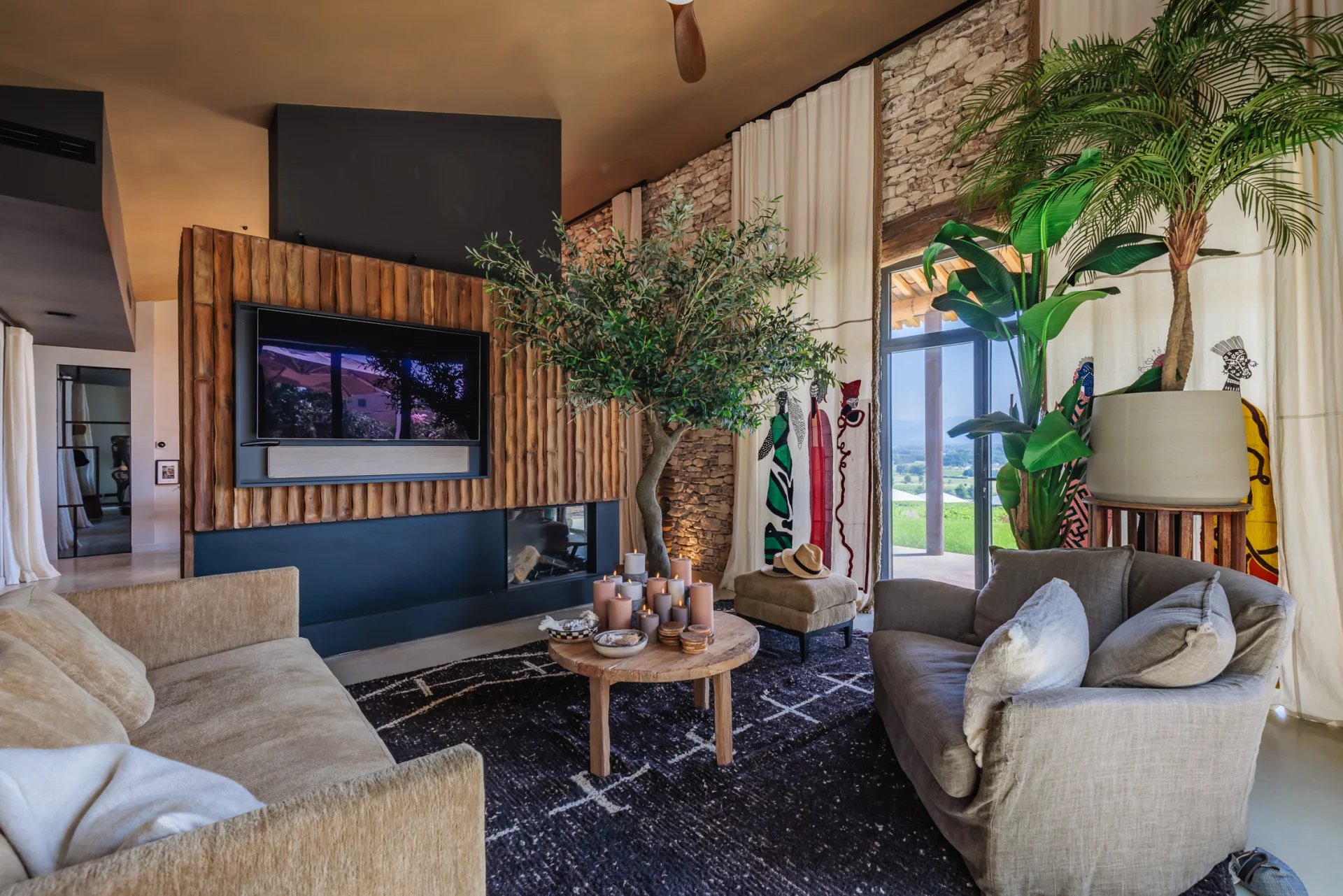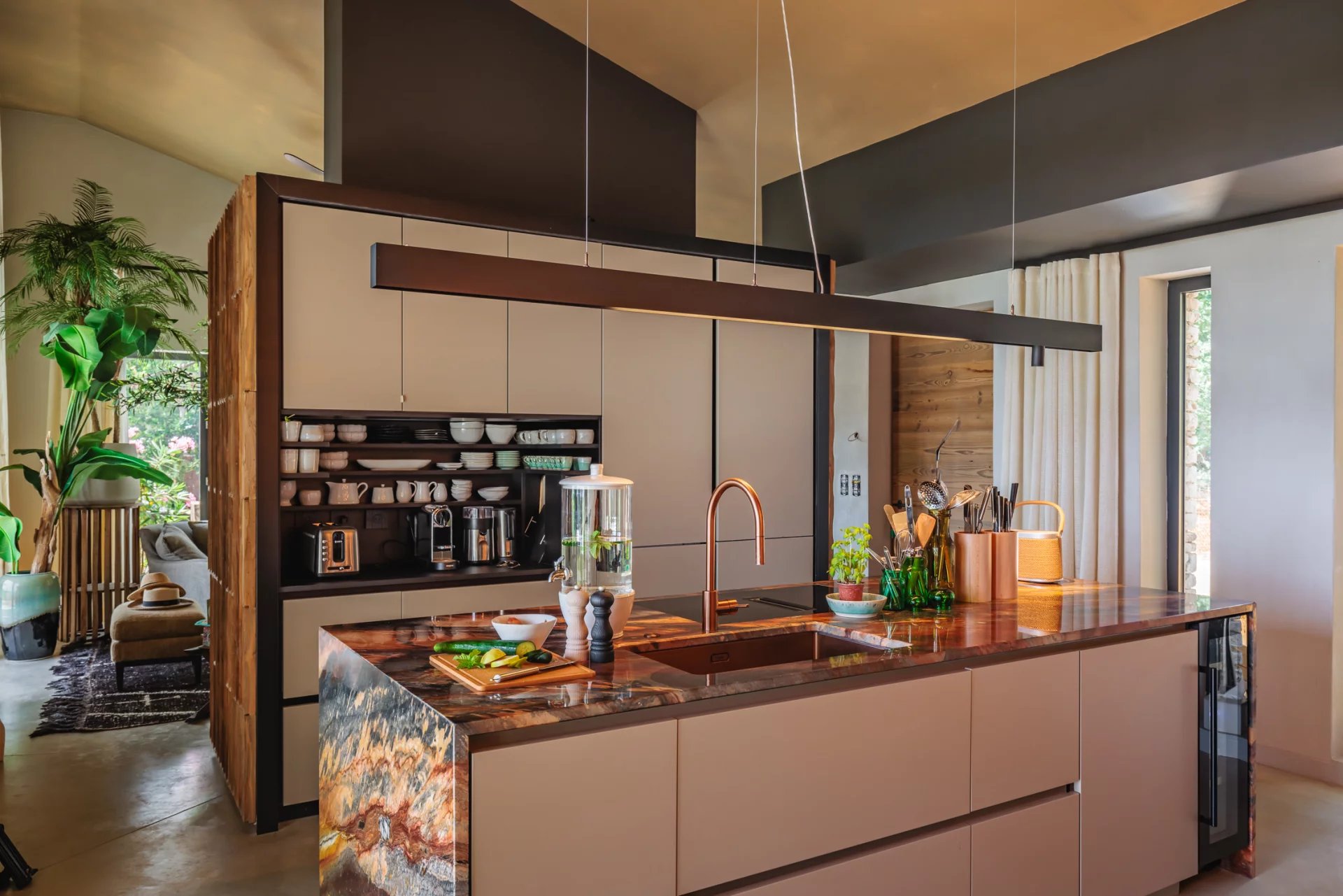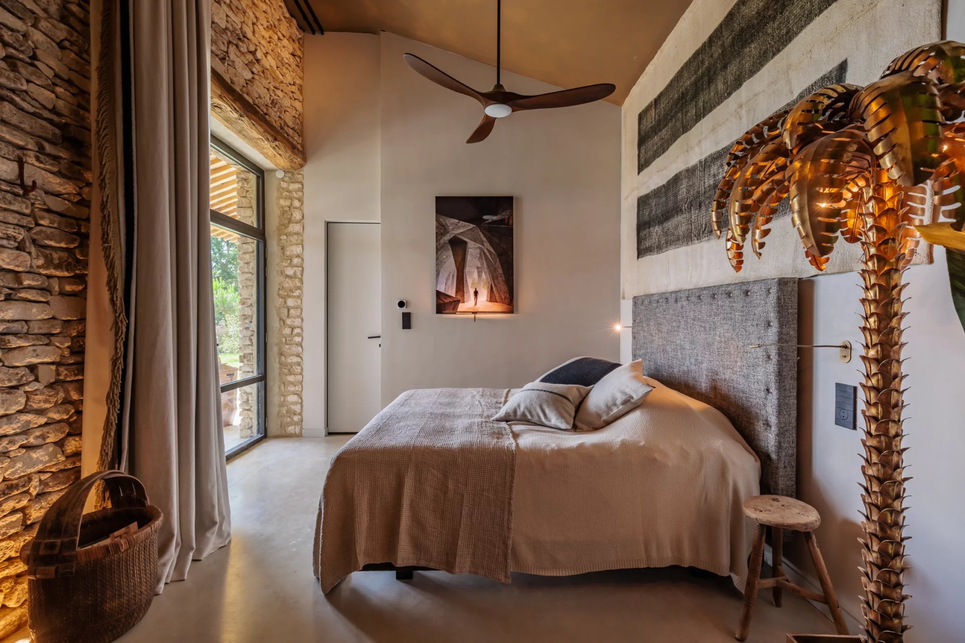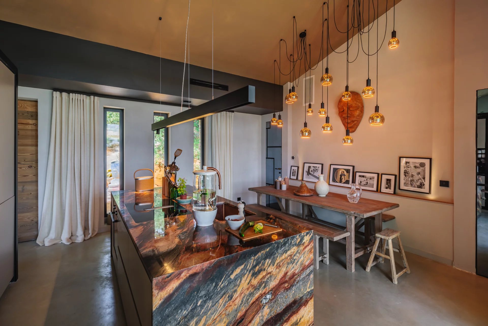 Vous serez immanquablement séduits par la qualité et le degré de raffinement des intérieurs. Une décoration originale, chaleureuse, soignée et recherchée, qui mêle subtilement les matières et matériaux (rideaux en lin, murs à la chaux, plan de cuisine en pierre du Brésil...).