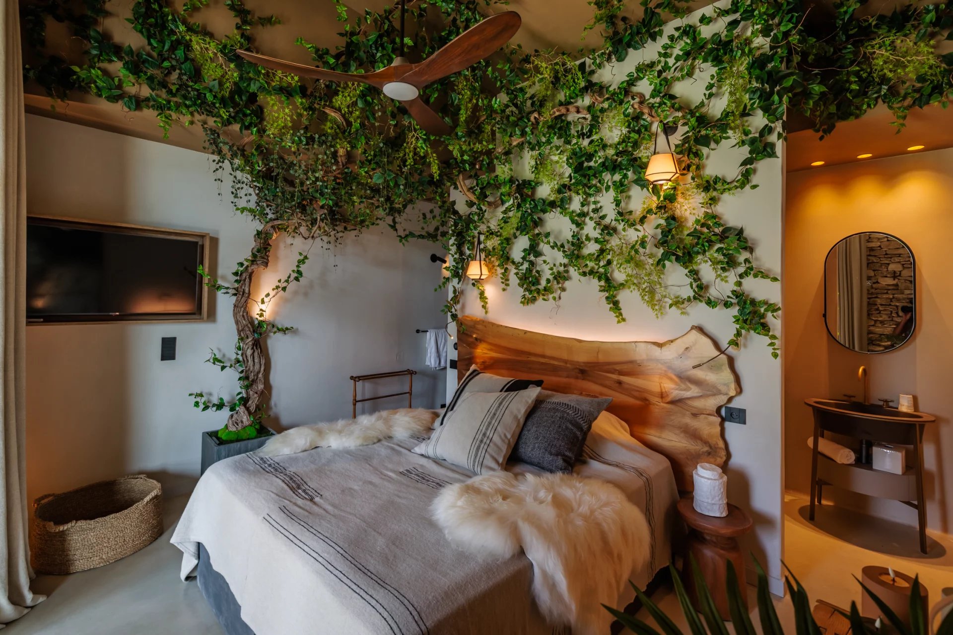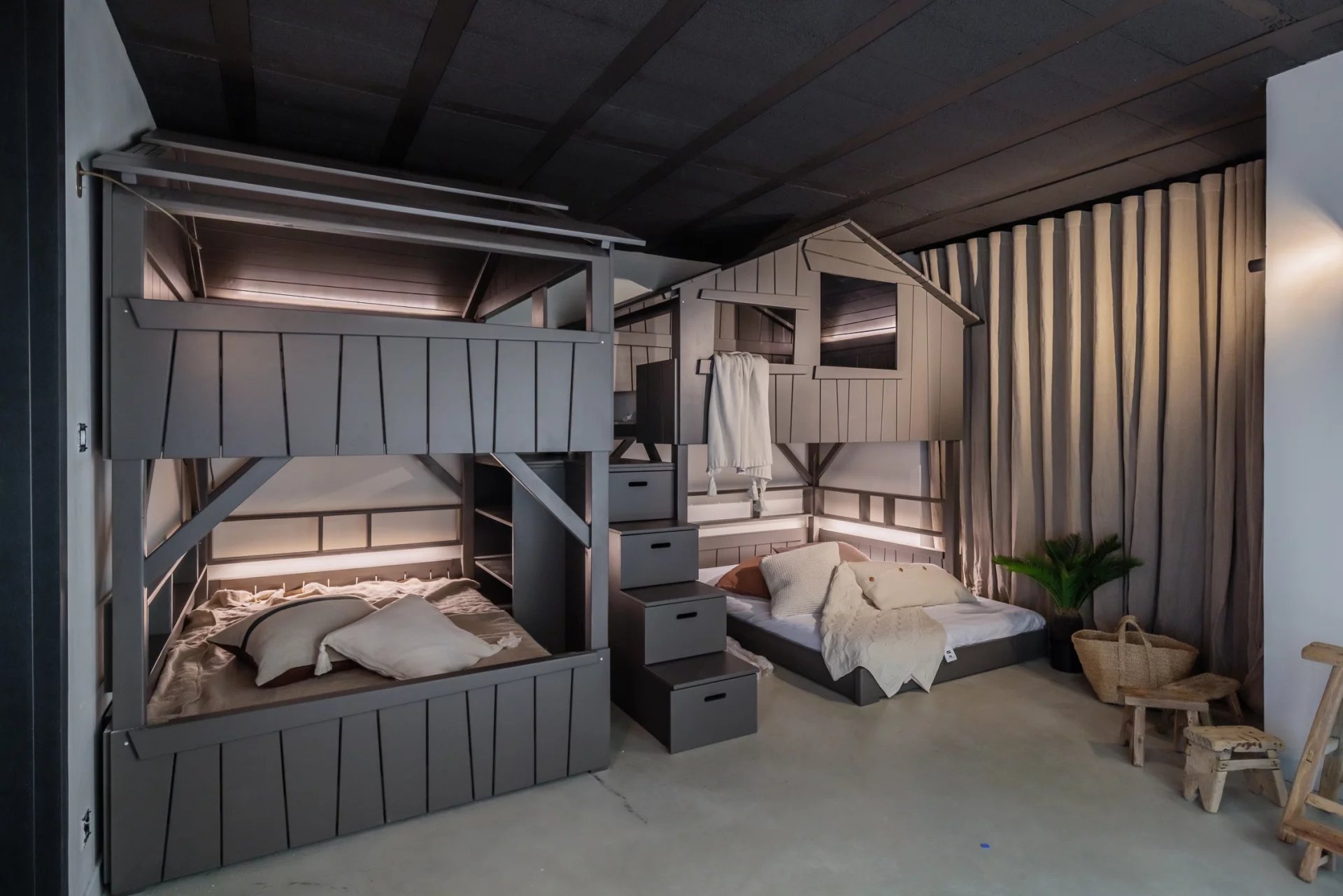 En contrebas, au niveau de la piscine, un espace nuit supplémentaire propose une chambre en suite avec terrasse dédiée et un beau dortoir pour enfants avec une ambiance "cabanes".