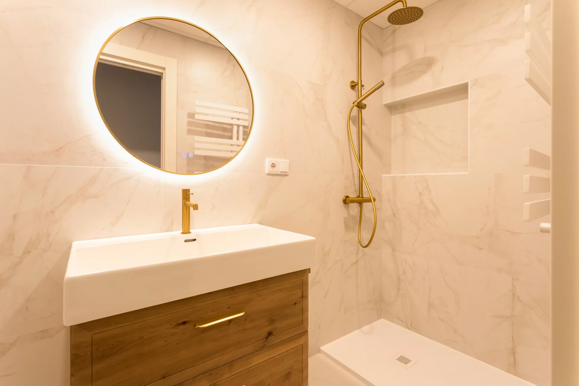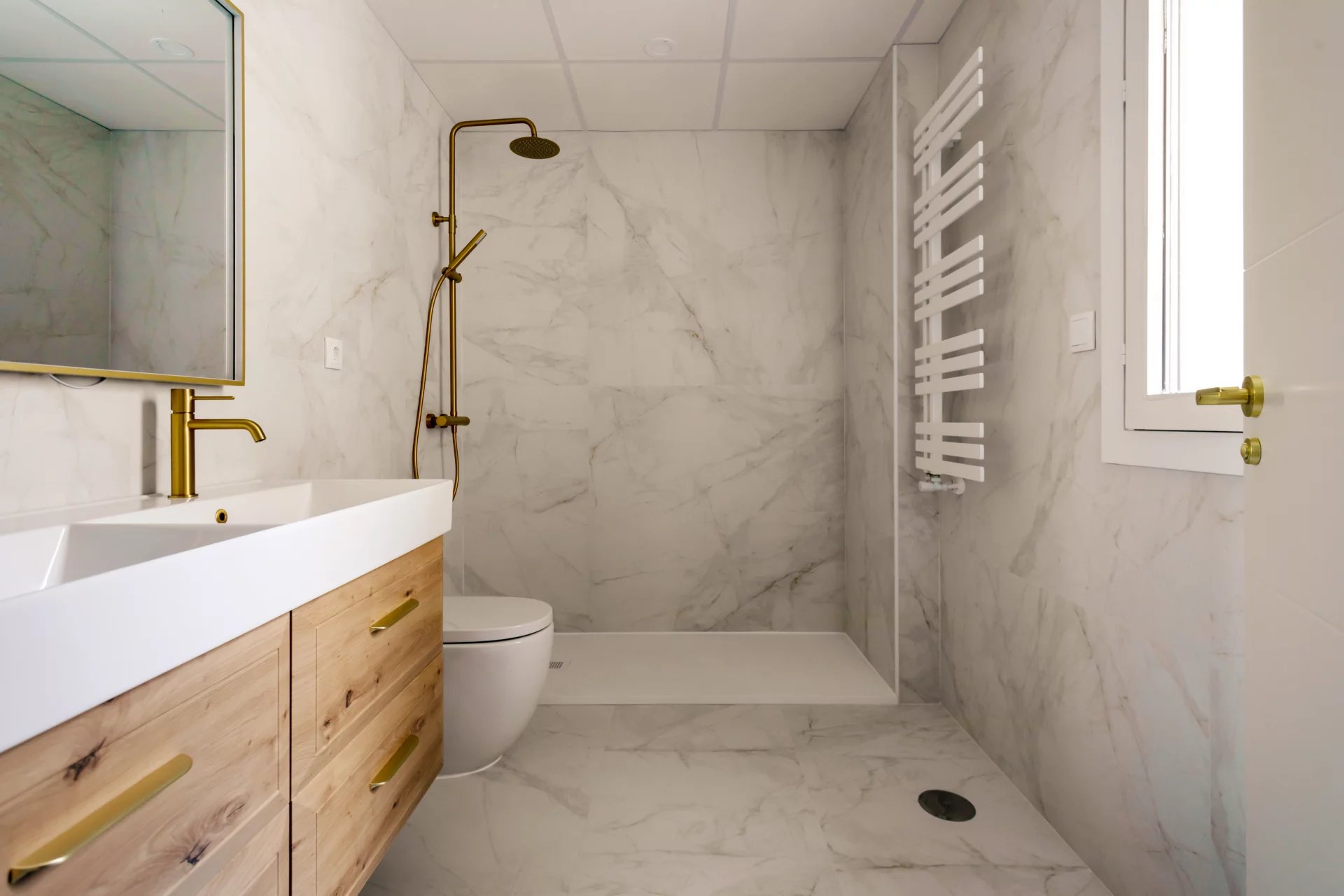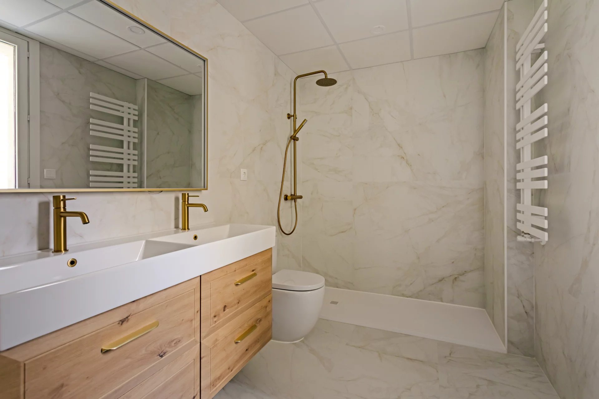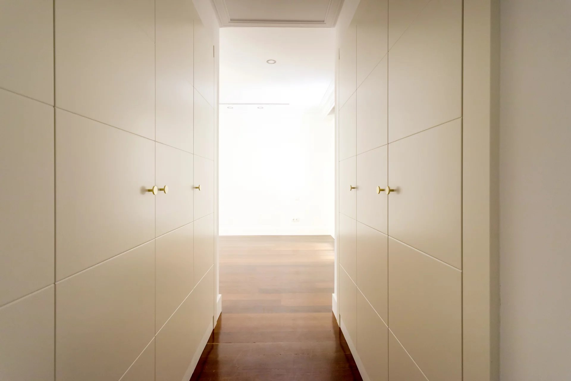 L'appartement comprend trois chambres à coucher, toutes équipées de placards. La chambre principale dispose d'une salle de bains privative et les deux autres se partagent une salle de bains complète. Il y a également des toilettes pour les invités.